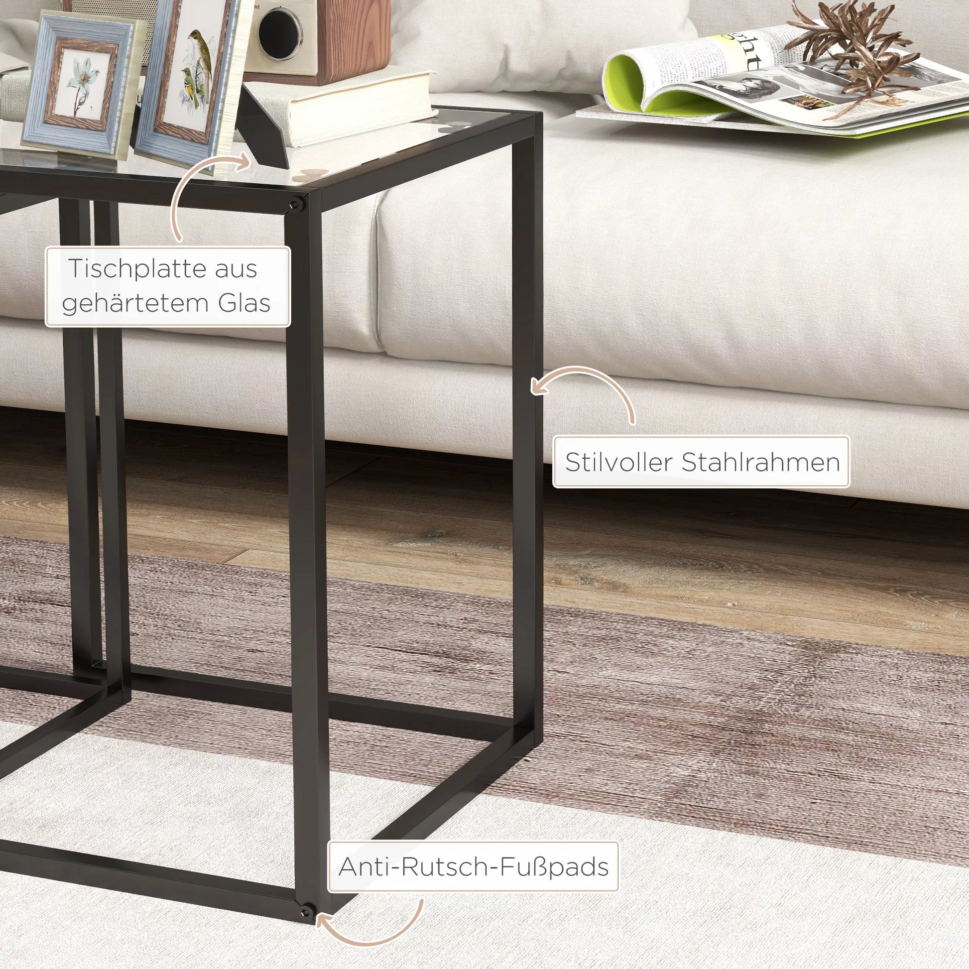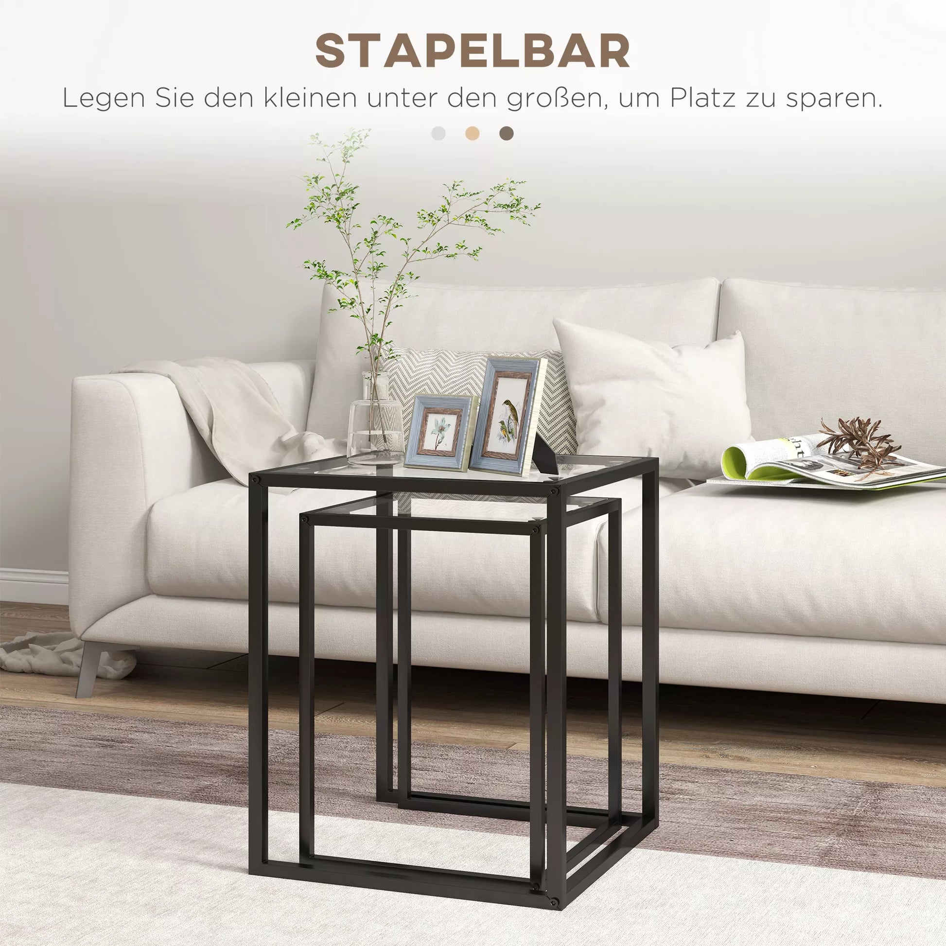 Stilingai papildykite savo svetainę ar biurą praktiška laikymo erdve su staliukų rinkiniu! Jį sudaro vienas mažesnis ir vienas didesnis staliukai, kuriuos galima sutaupant vietą sudėti vieną į kitą. Tvirtas ir smūgiams atsparus grūdinto stiklo stalviršis lengvai valomas drėgna, o po to sausa šluoste. Šis universalus staliukų rinkinys akimirksniu pagyvins jūsų erdvę.