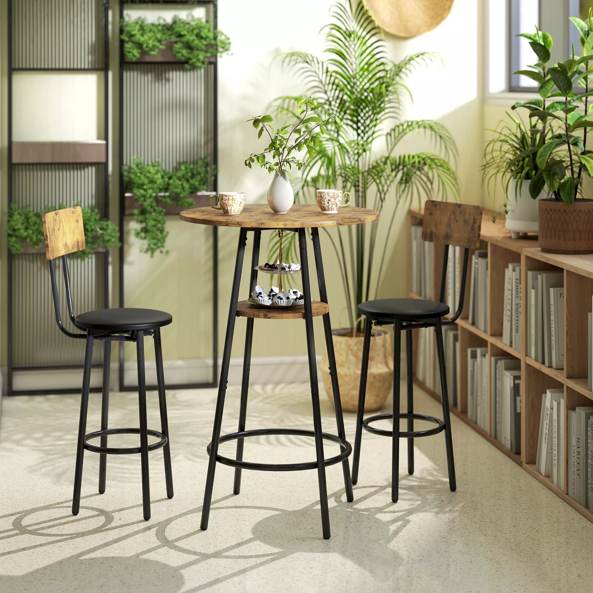 3 dalių baro stalo komplektas su 2 paminkštintomis taburetėmis, dirbtinės odos apmušalais, atlošu, metaliniu rėmu, rudas