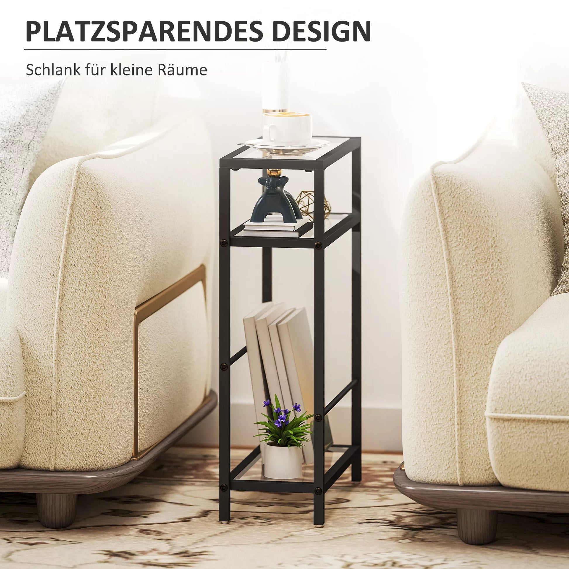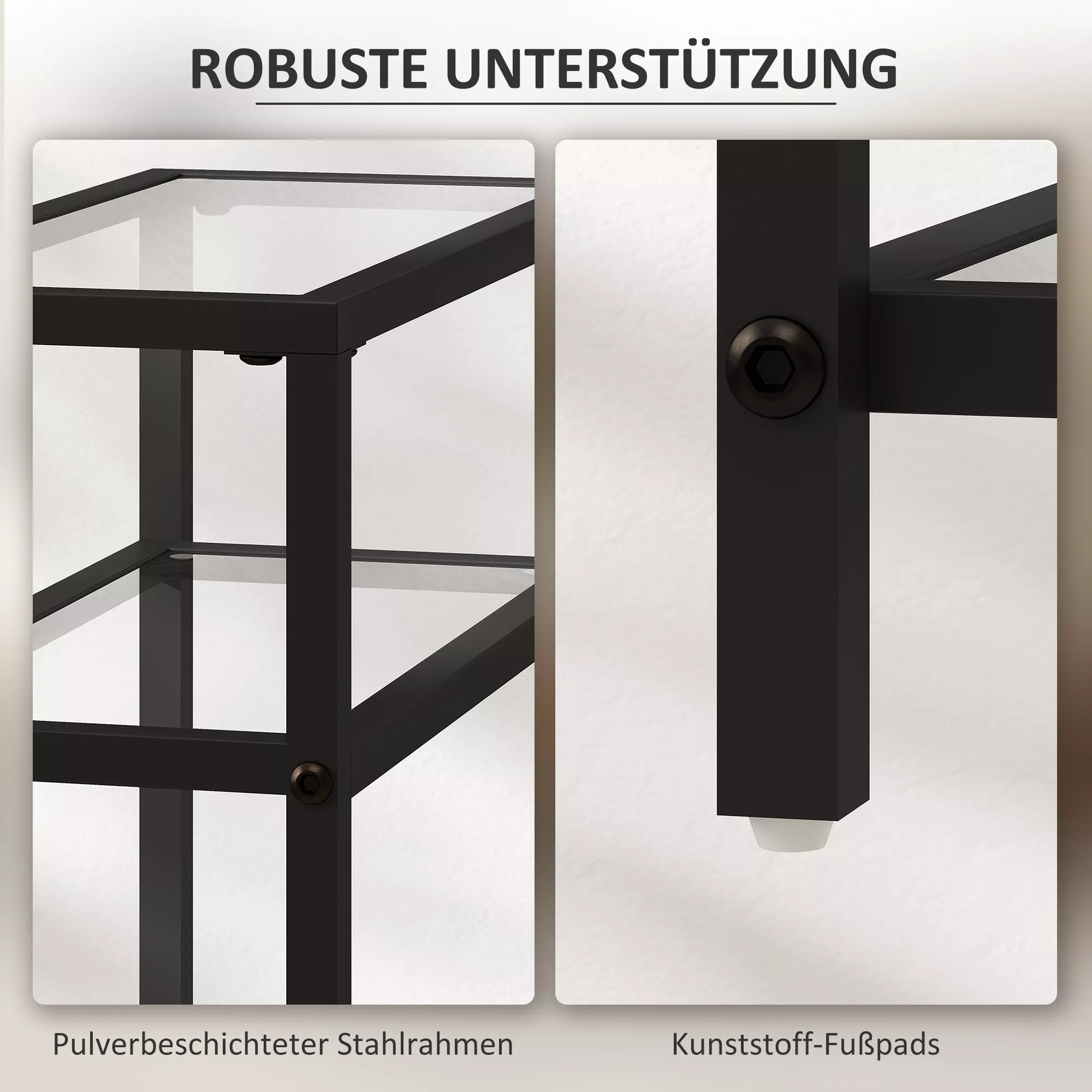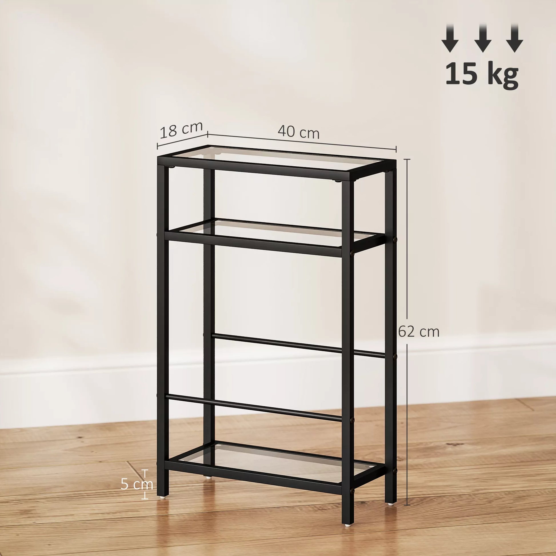 3 pakopų lentyna su stiklinėmis plokštėmis, 18 cm pločio, plieninis rėmas, skersinės atramos, juoda