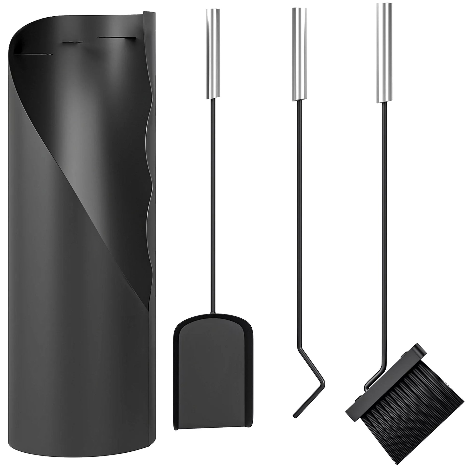 4 dalių židinio įrankių komplektas su šluota, semtuvėliu, pakūrio iečiu ir krepšiu, židinio reikmenys, metalas, juodas