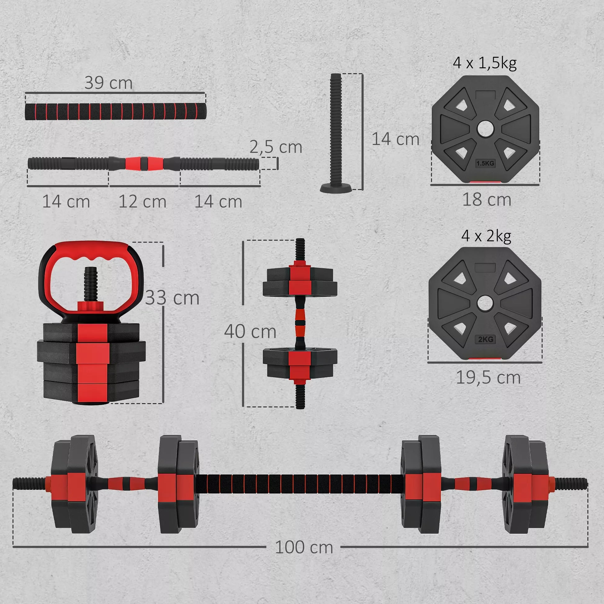 - ✔ 15 kg 4-in-1 rinkinys: Hanteliai, štangos, kettlebellai ir atsispaudimų rankenos