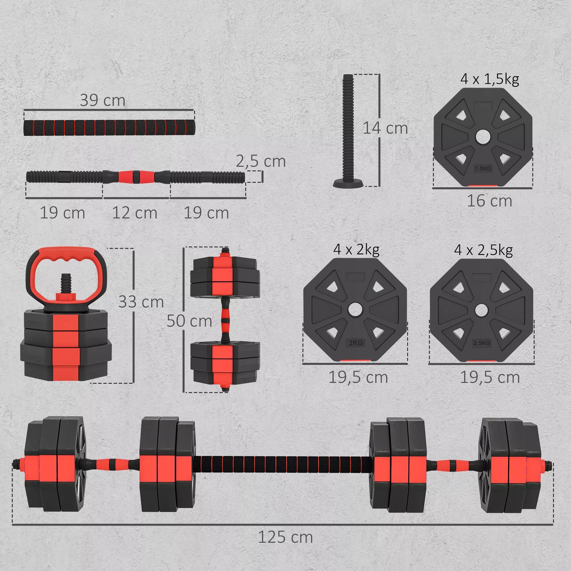 - ✔ 25 kg 4-in-1 rinkinys: hanteliai, štangos, kettlebellai ir atsispaudimų rankenos