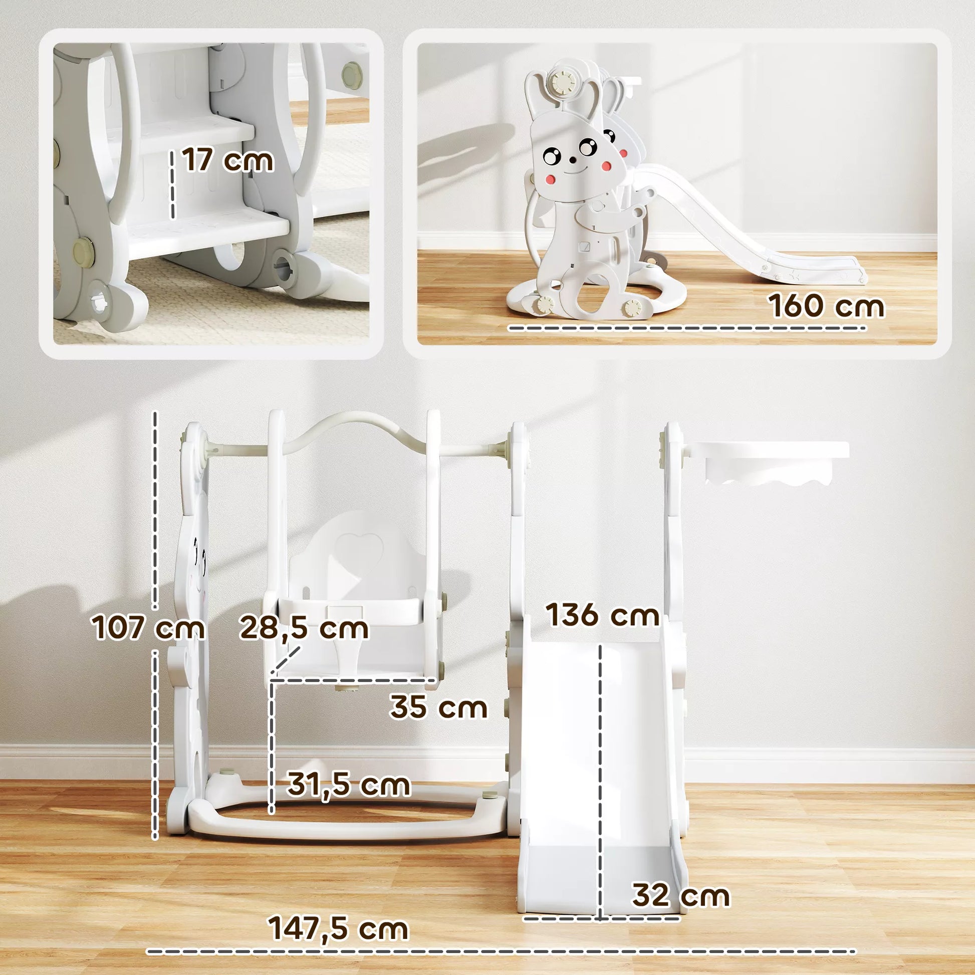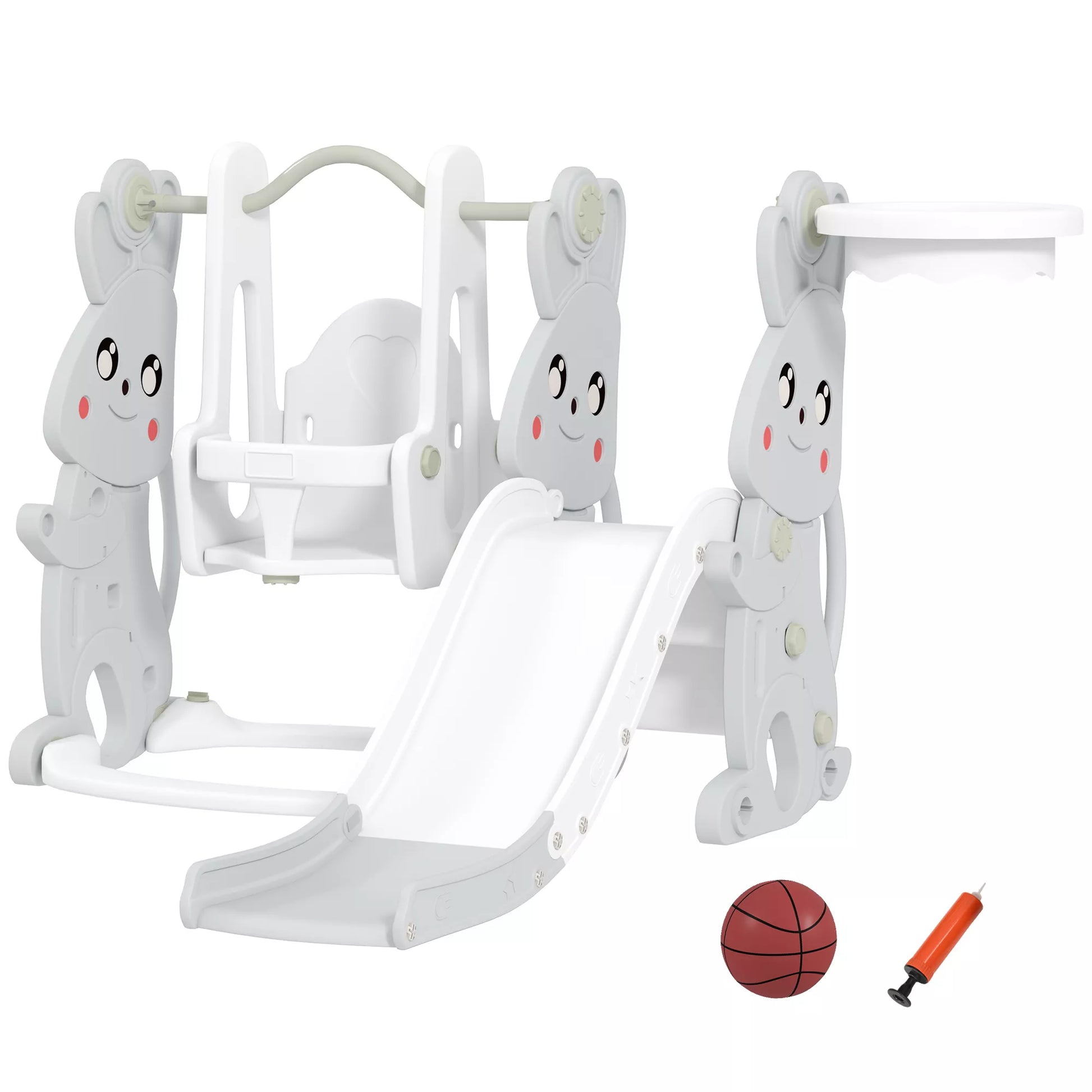 4-in-1 žaidimų rinkinys mažyliams, čiuožykla, supynės, laipiojimo aikštelė, krepšinio lankas, plastikas, triušio dizainas, pilkas