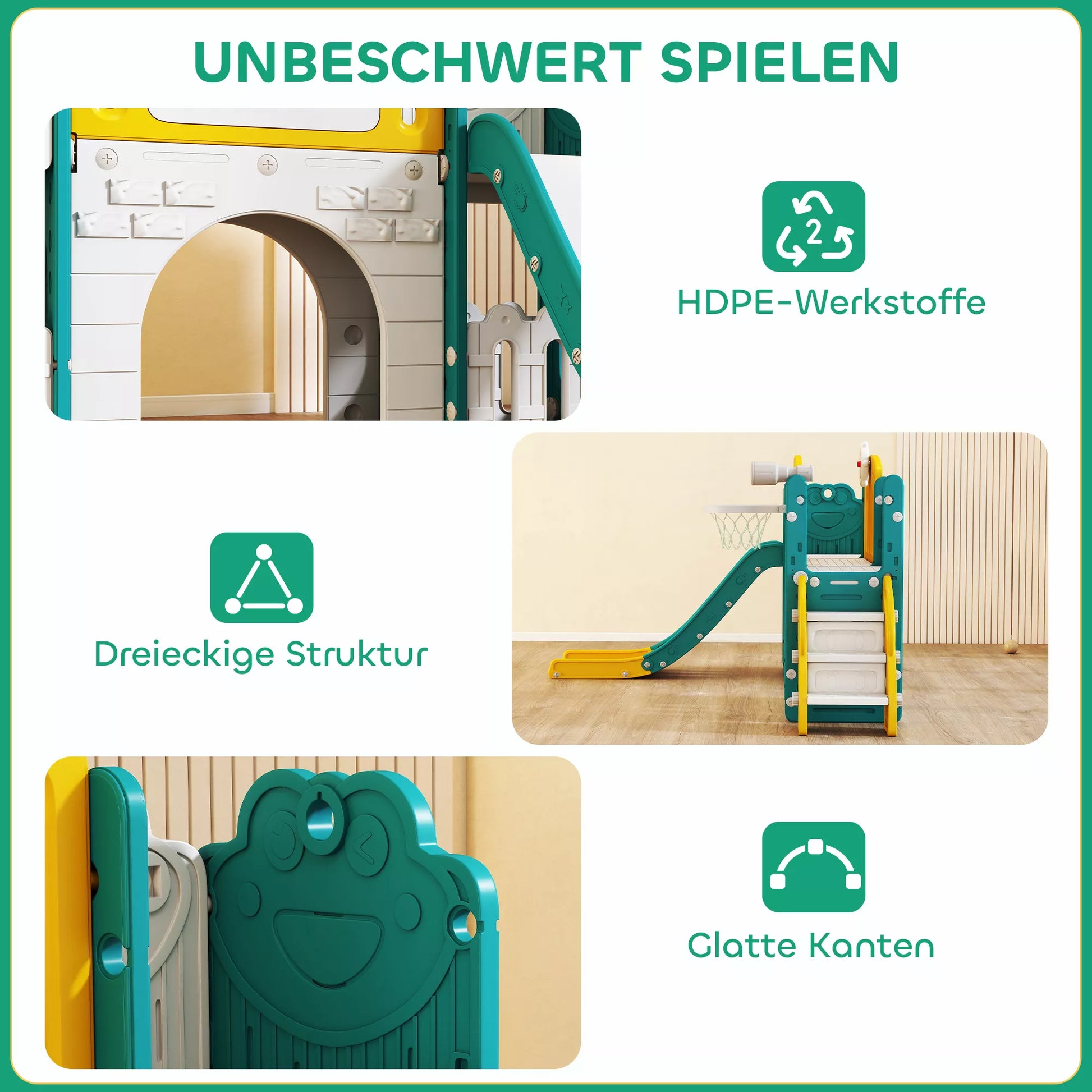 7-in-1 čiuožyklų ir žaidimų komplektas mažyliams, su krepšinio lanku, varlės dizainu, laipiojimo konstrukcija, sūpynių sėdyne, skirtas naudoti viduje ir lauke, geltonas+žalias