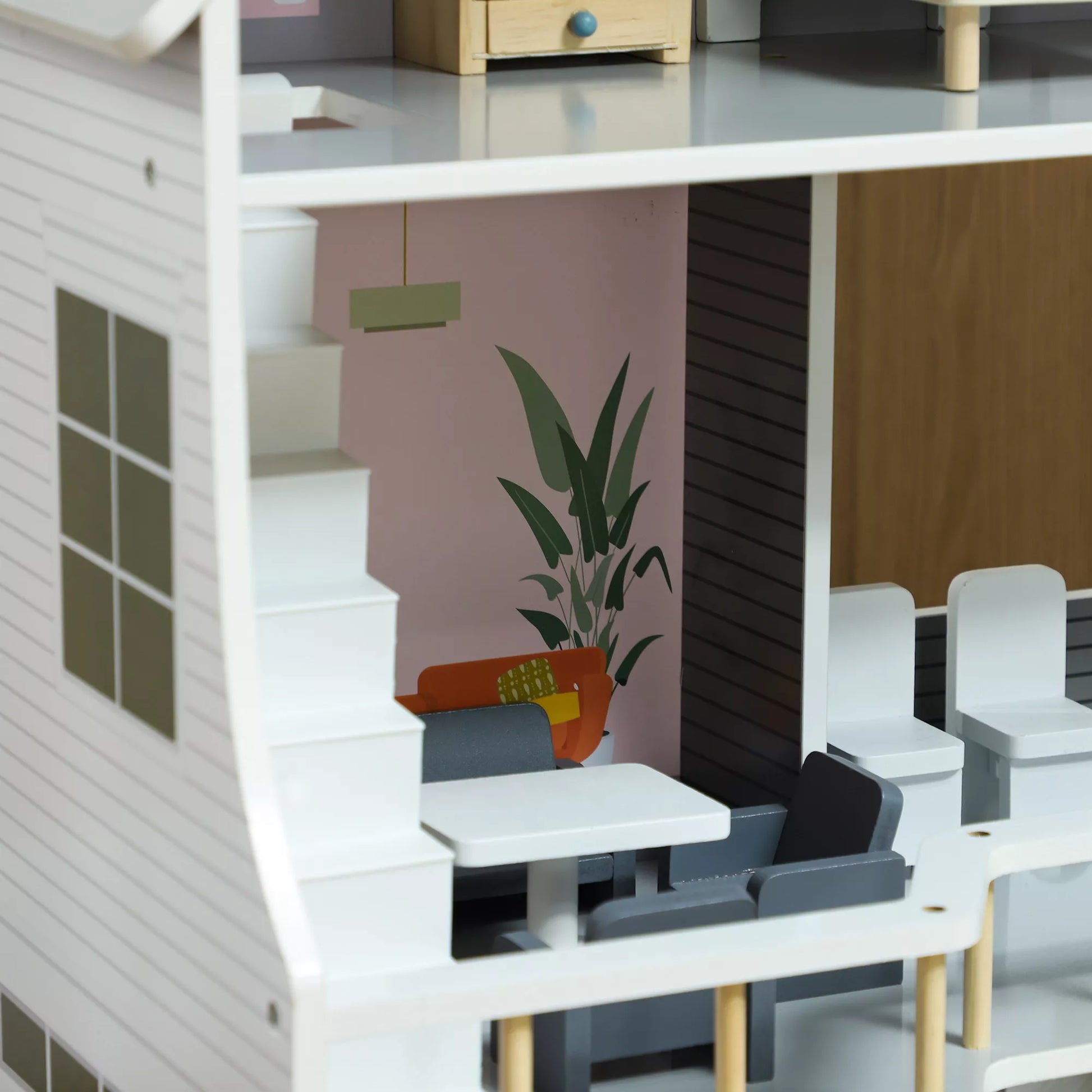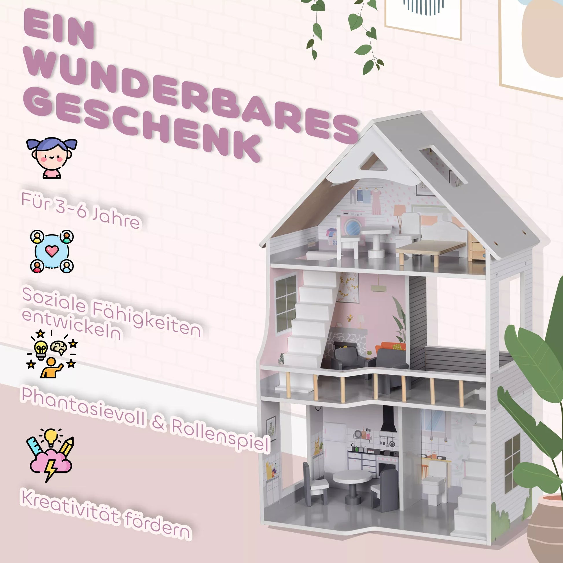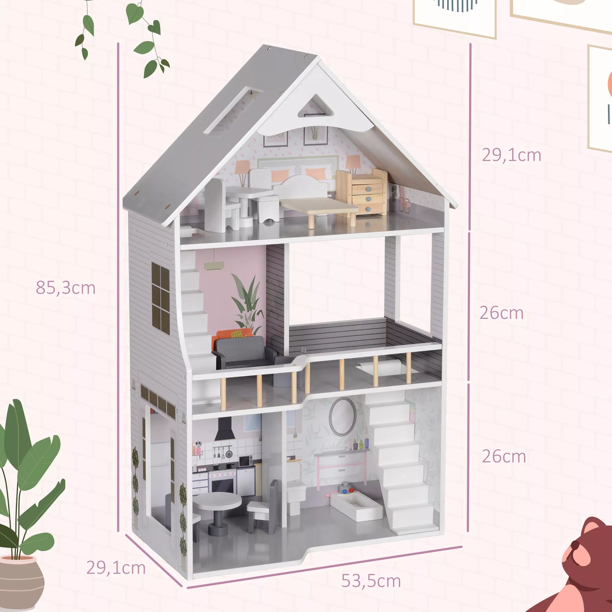 Medinis lėlių namelis su 13 baldų ir priedų, 3 aukštų žaidimų namelis vaikams nuo 3 iki 6 metų