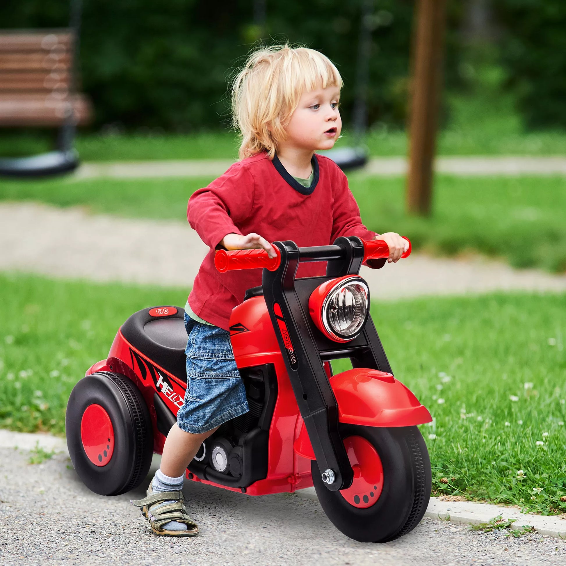 Vaikiškas čiuožiamasis automobilis, motociklo dizainas, muzika ir muilo burbulai, skirtas 2–5 metų amžiaus vaikams, raudonas