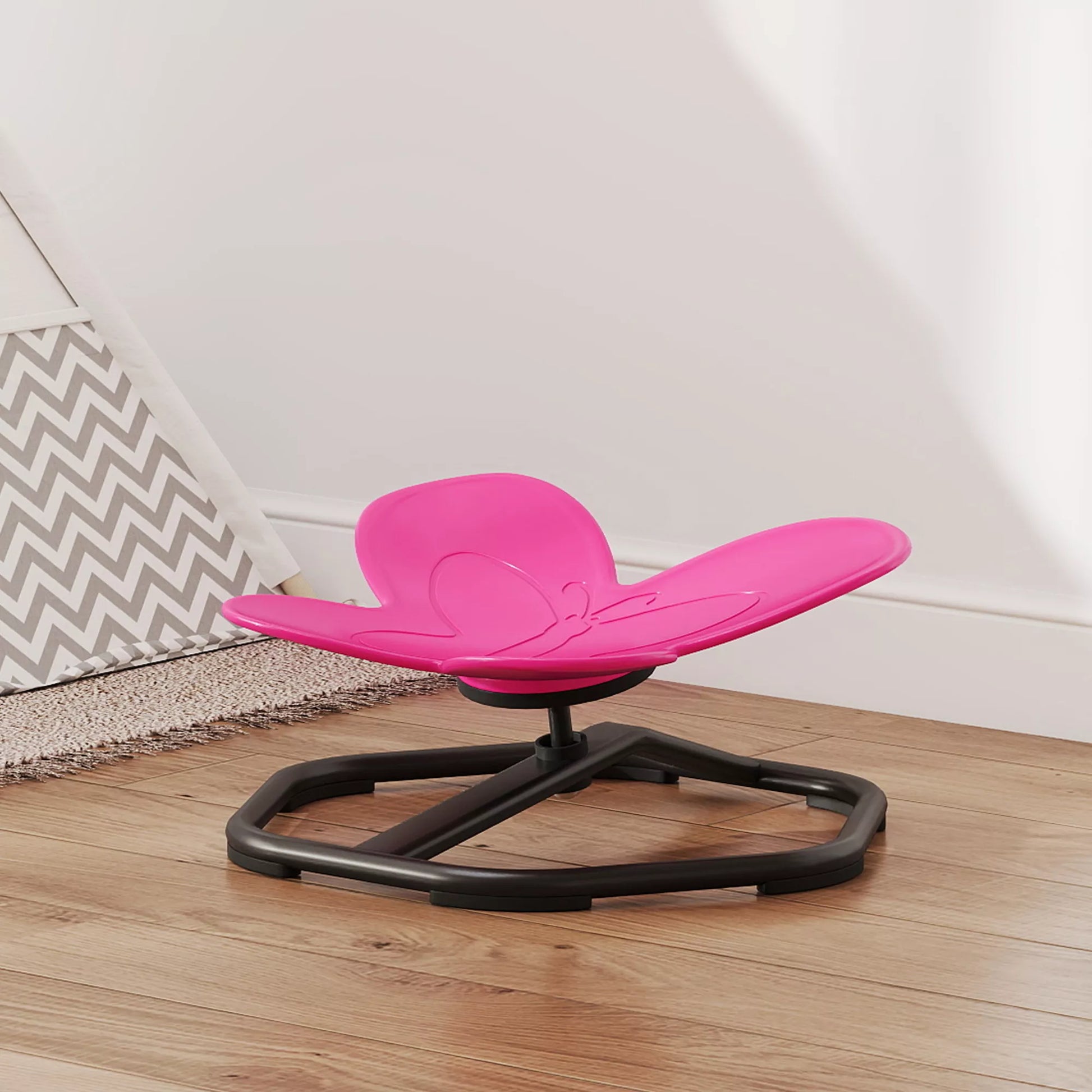 Sensorinė pasukama kėdutė vaikams, drugelio formos, lavina pusiausvyrą ir koordinaciją, plastikas, metalas, rožinė