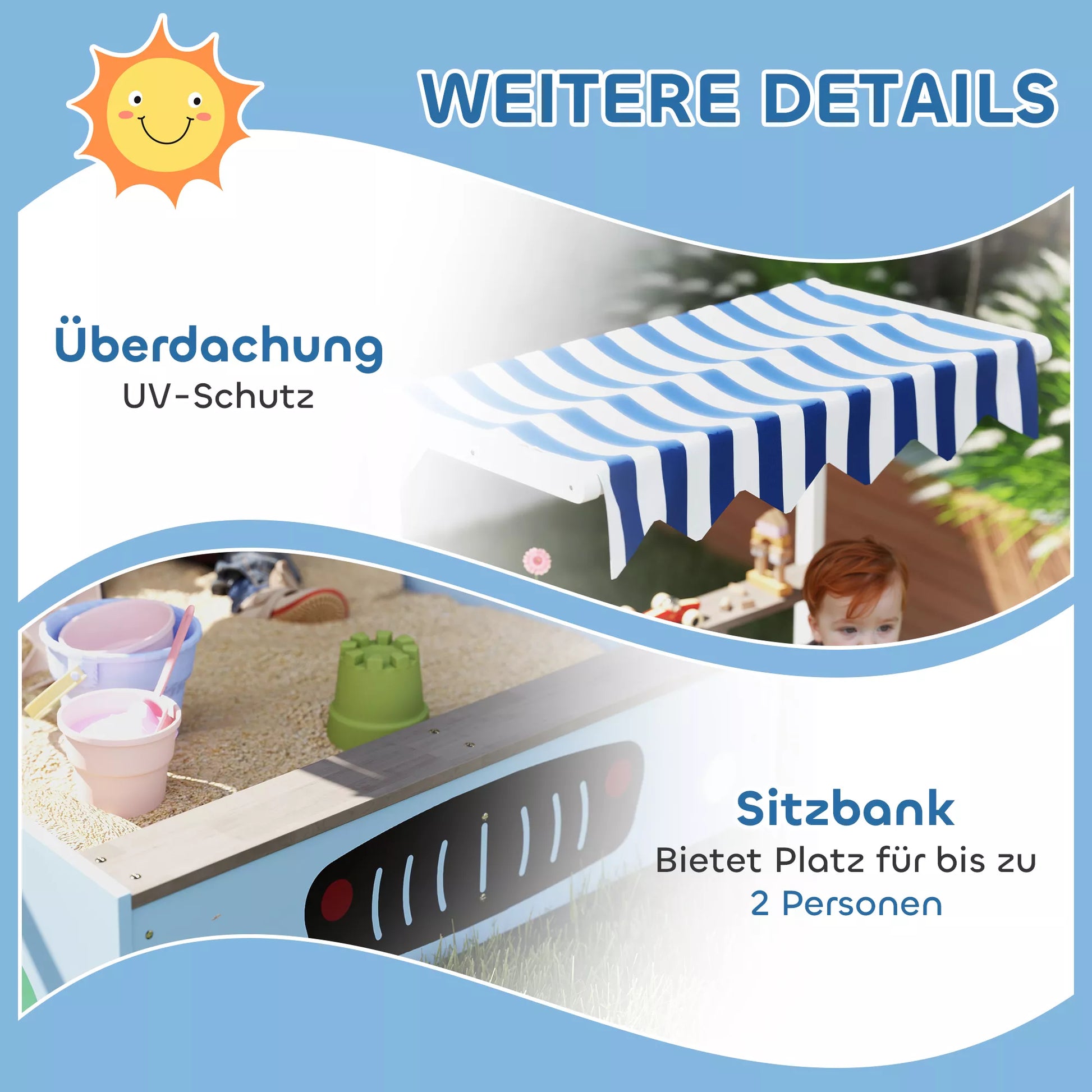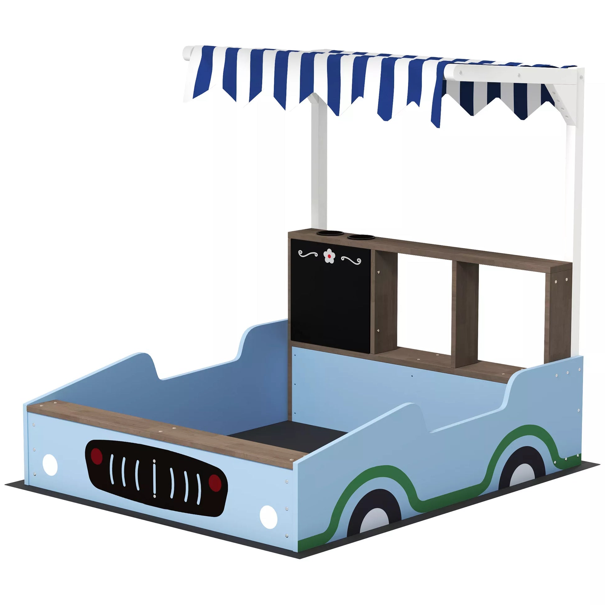 Skatinkite vaiko kūrybiškumą su smėlio dėže su suoliuku! Ši žavinga medinė smėlio dėžė automobilio dizaino taip pat tarnauja kaip mažas maisto prekių parduotuvėlė. Vaikai čia gali žaisti parduotuvę, piešti ant lentos ir auginti augalus dviejose paruoštose dėžėse. Dėl UV spinduliams atsparaus stogelio jie taip pat apsaugoti nuo per didelio saulės poveikio.