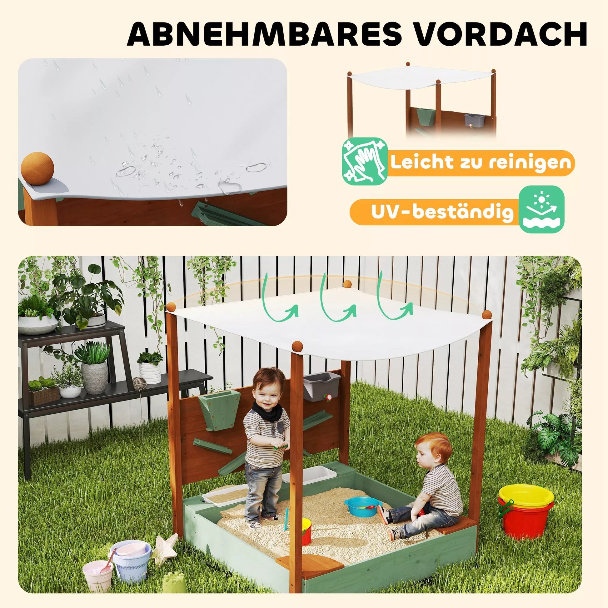 Smėlio dėžė su stogeliu vaikams, 2 laikymo dėžės, 116I x 112,5P x 128A cm, eglės mediena, plastikas, žalia