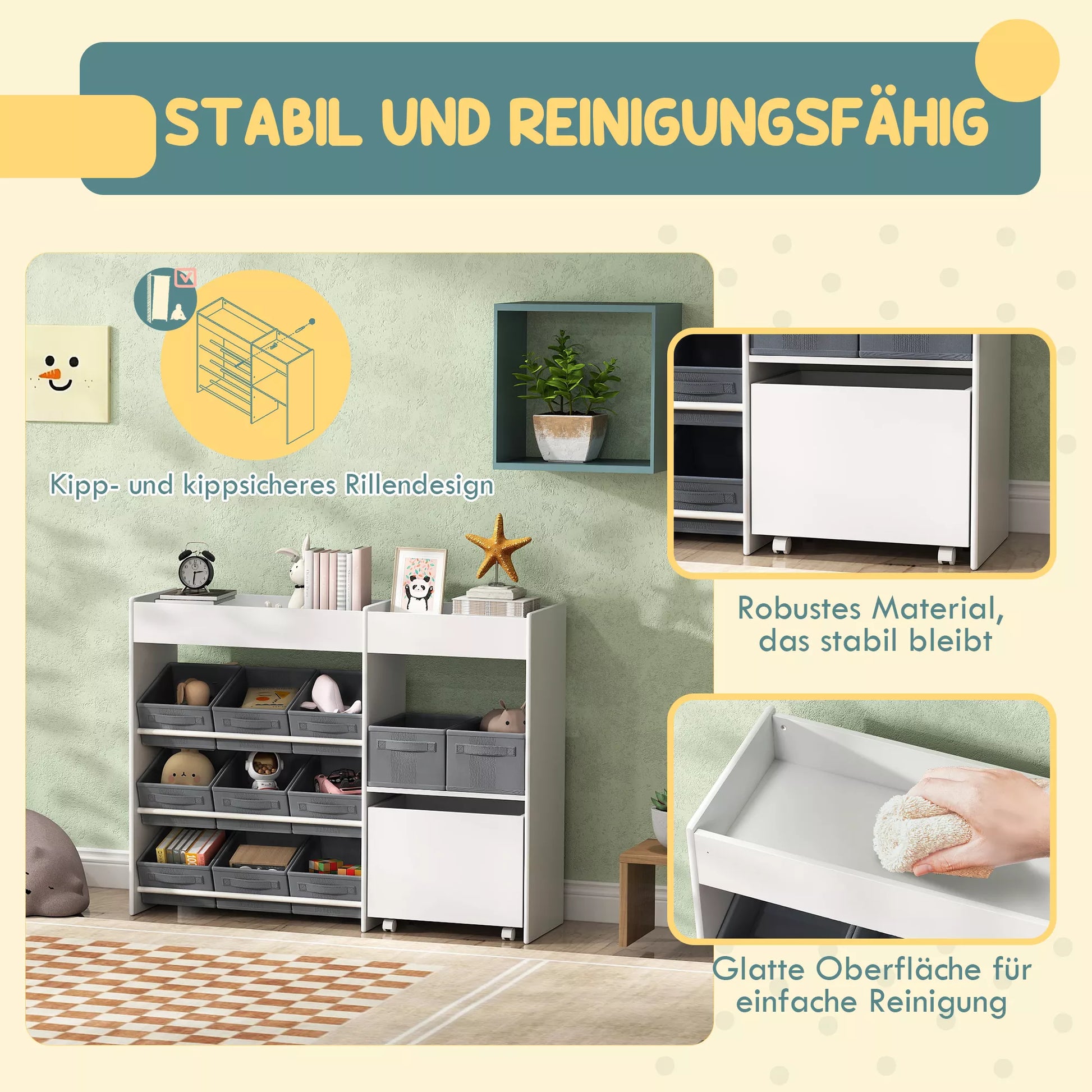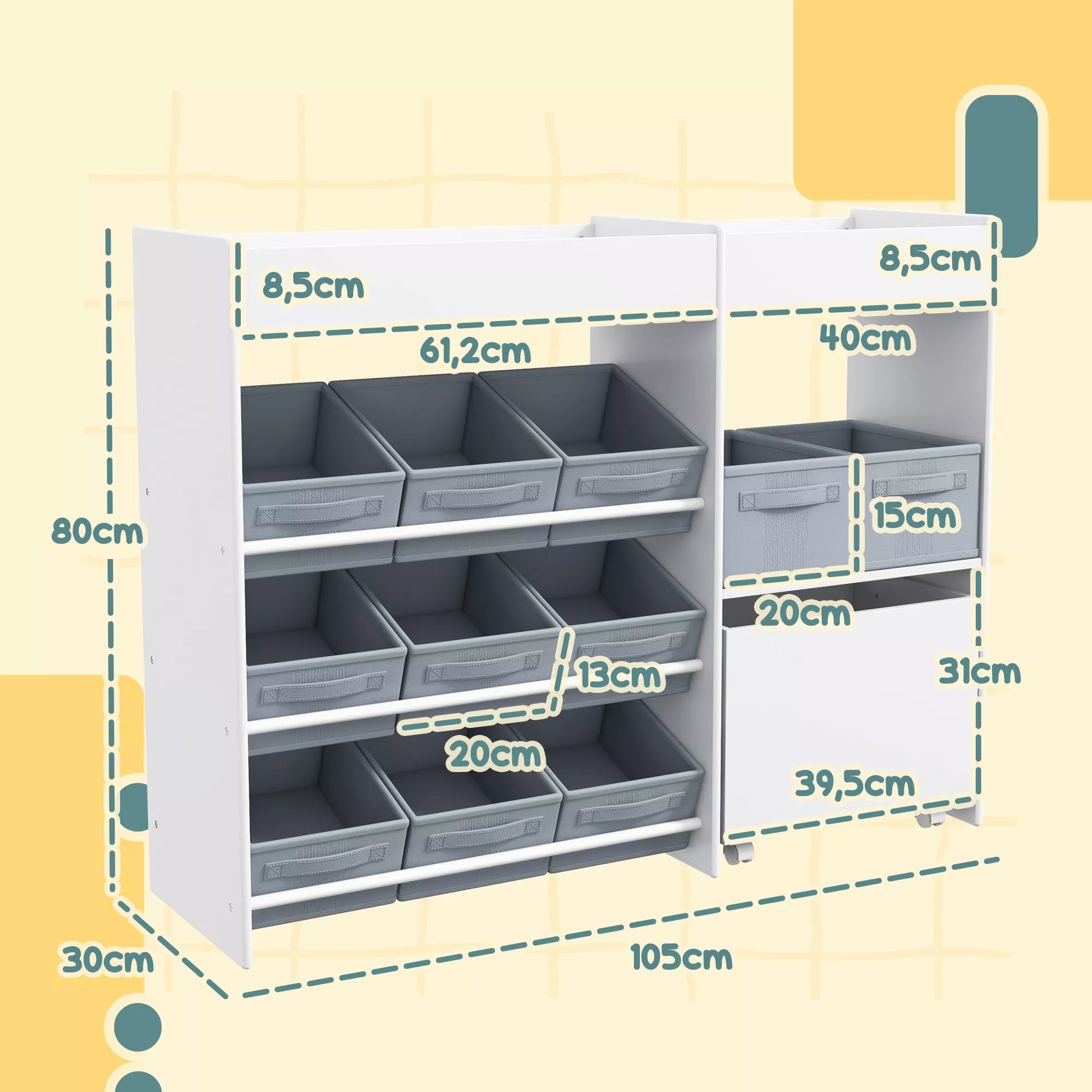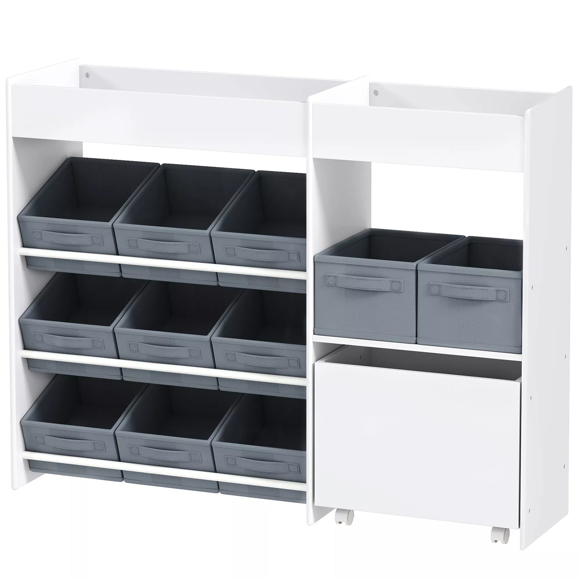 Vaikiška daiktų laikymo lentyna, žaislų spintelė su 11 audinių dėžučių, viršutiniais skyreliais, 3 lipdukais, balta