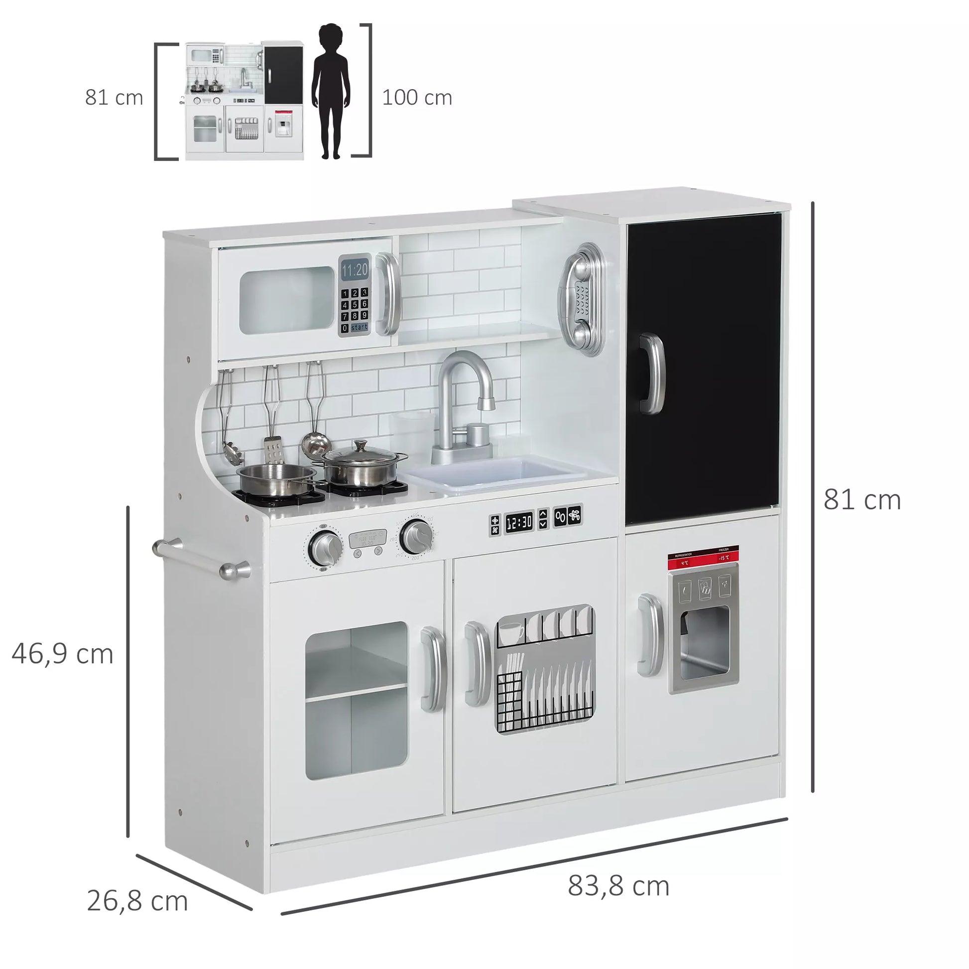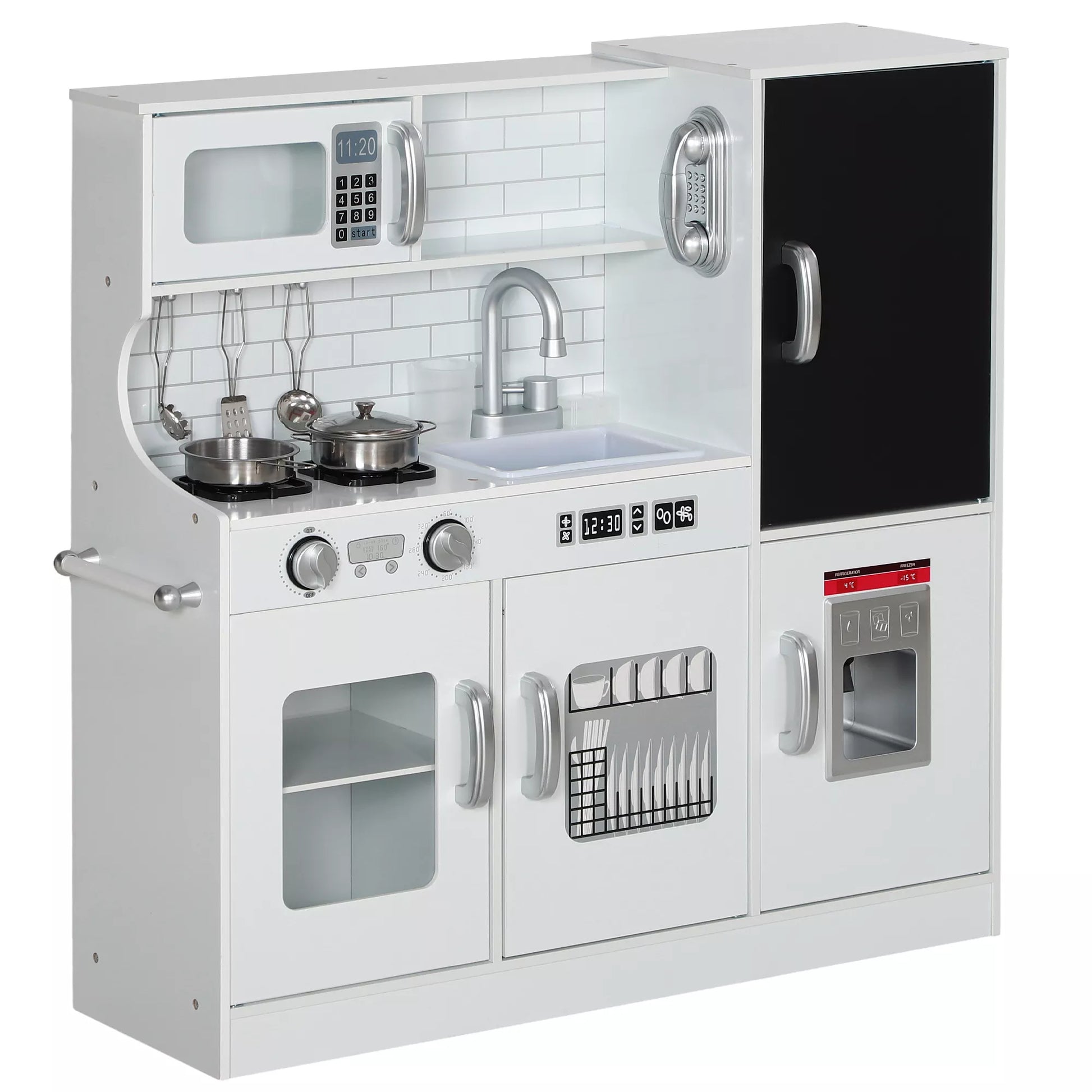 Leiskite savo mažajam šefui išreikšti savo kūrybiškumą su žaisliniu virtuvės komplektu! Komplekte yra kreidinė lenta, skirta dienos patiekalams užrašyti, tikra ledo kubelių mašina, viryklė ir mikrobangų krosnelė. Žaislinis virtuvės komplektas vaikams apima 5 dalių nerūdijančio plieno rinkinį, skirtą fantazijai praturtintiems kulinariniams nuotykiams saugioje, MDF konstrukcijos erdvėje. Idealiai tinka jauniems kulinarijos talentams!