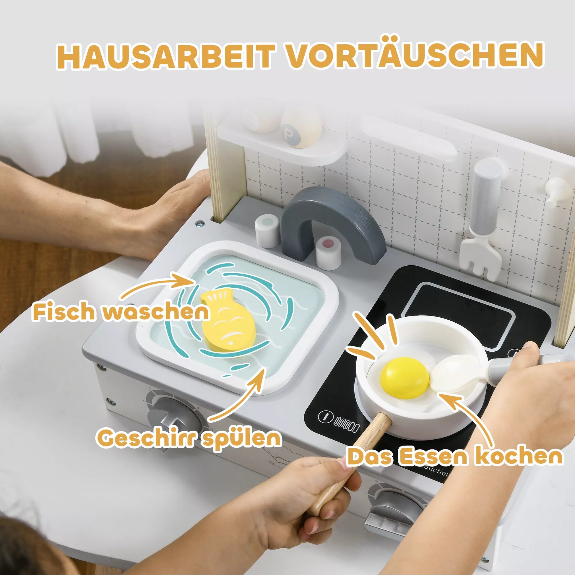 Vaikiškų virtuvėlių rinkinys, 10 dalių, su prieskonių buteliukais, puodu, kiaušiniu, žuvimi, 36x21,5x25 cm, Pilka/Geltona