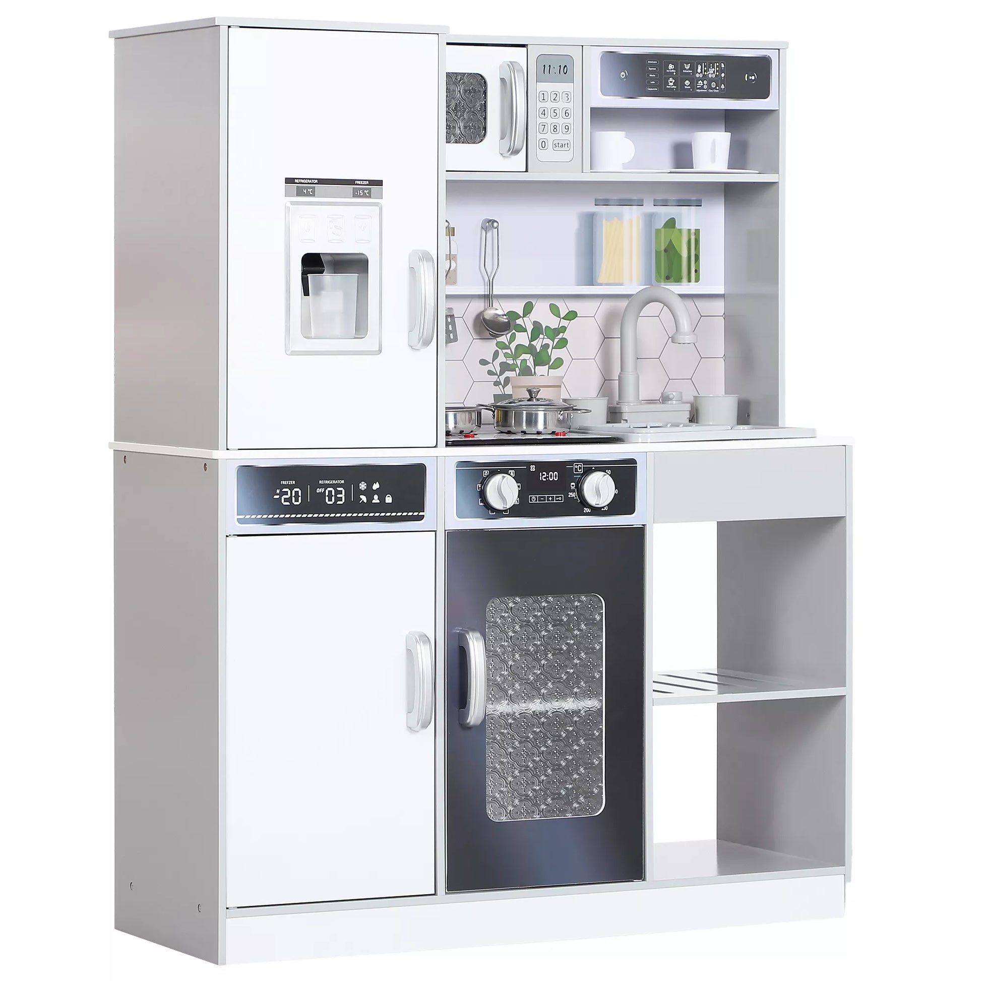Žaislinės virtuvėlės rinkinys su nerūdijančio plieno indų rinkiniu, virykle, kriaukle su vandens cirkuliacijos sistema, šviesos ir garso efektais, balta