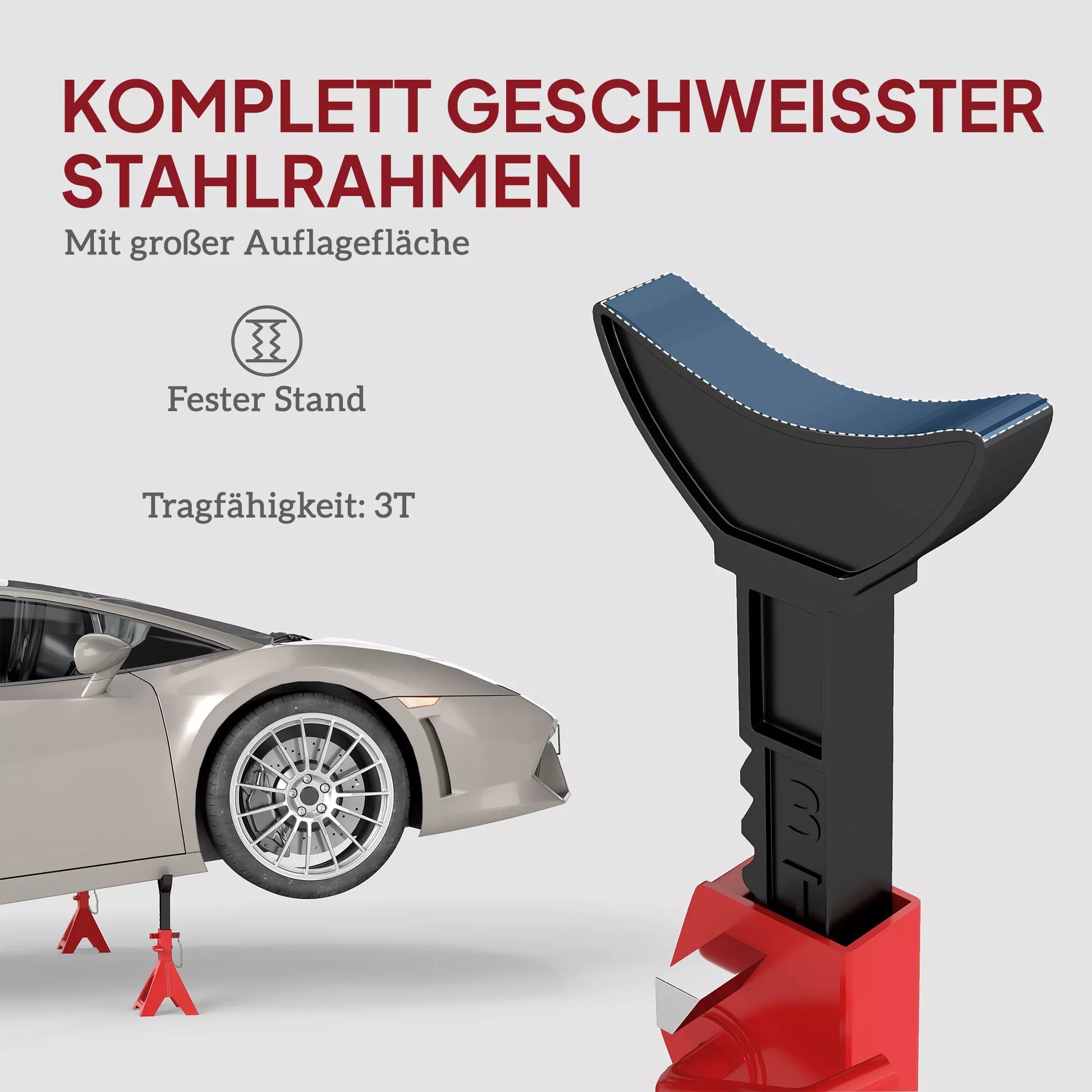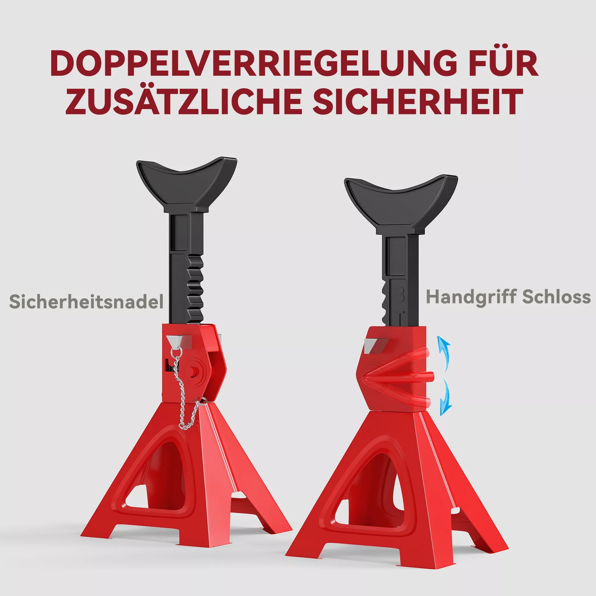 Atraminiai stovai 2 vnt. 3 tonų keliamosios galios, su saugos kaiščiu, 10 pakopų aukščio reguliavimas, raudoni