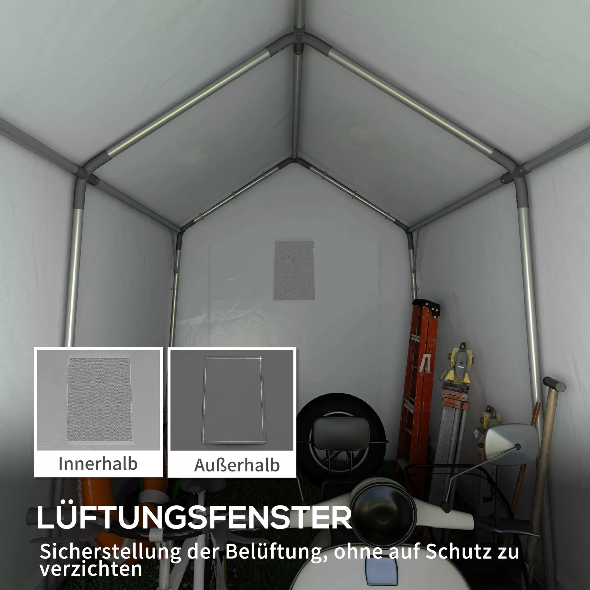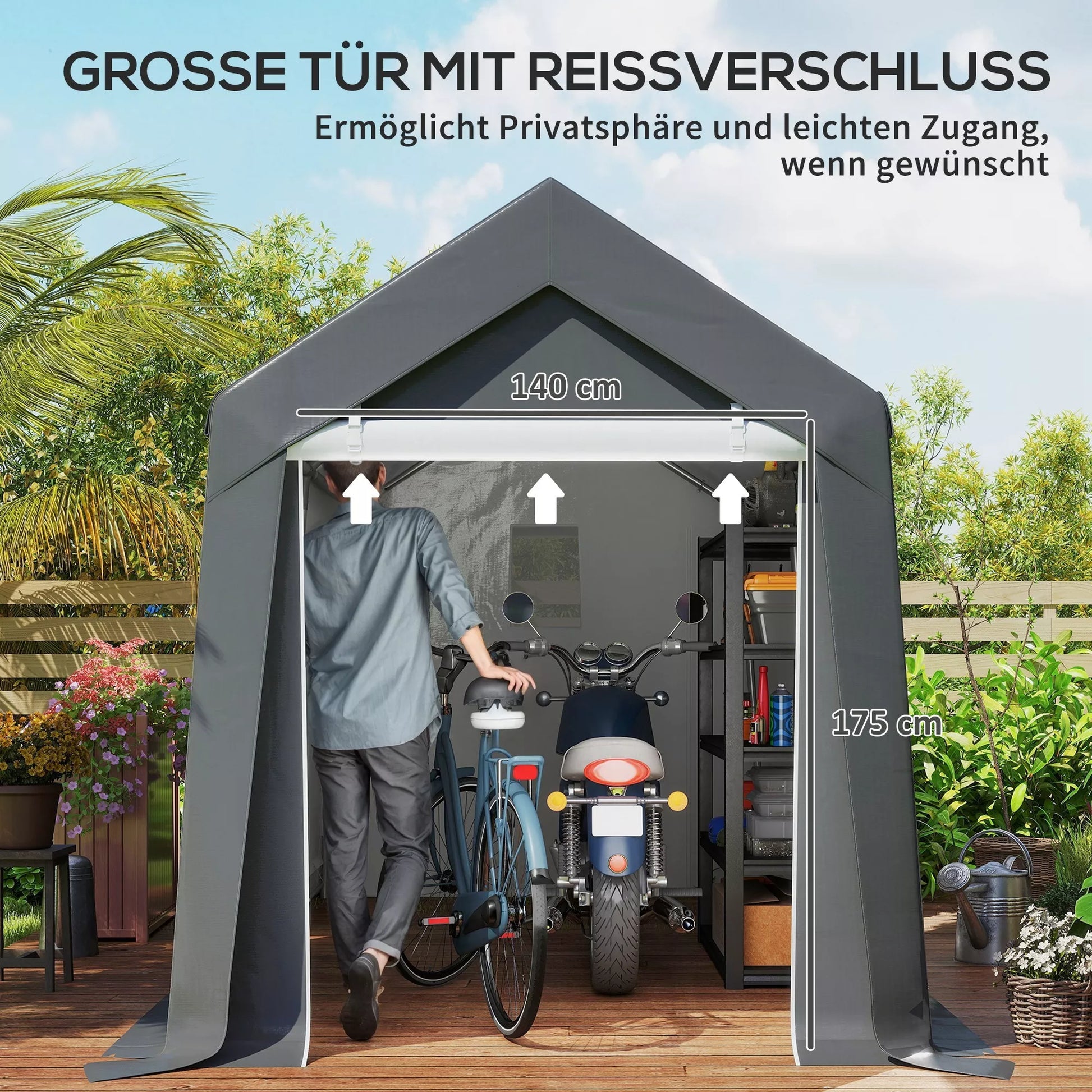 Atraskite stovyklos palapinę savo sodui – idealią lauko papildomos saugyklos vietos sprendimą. Apsaugokite savo motociklą, įrankius ar kitus daiktus tvirta PE danga, kurią galima saugiai pritvirtinti prie žemės. Dėl didelių, atsegamų ir susukamos durys tilps didesni įrenginiai, pavyzdžiui, vejapjovės. Pagaminta iš tvirto, cinkuoto plieno ir pritvirtinta žemės inkarais, ši dviračių palapinė suteikia greitą ir patikimą apsaugą nuo stichijų.