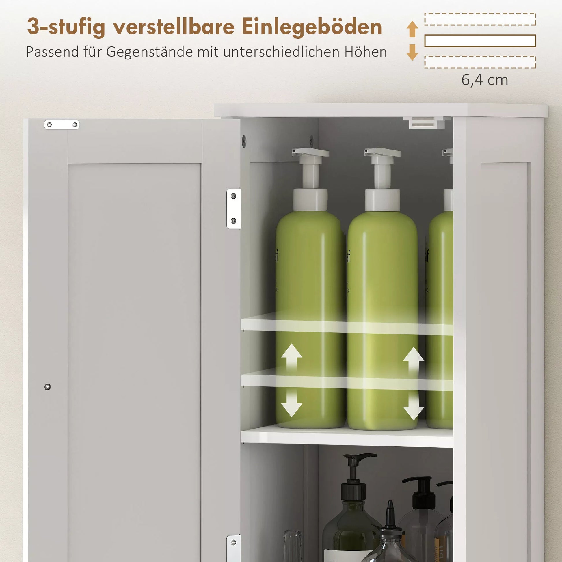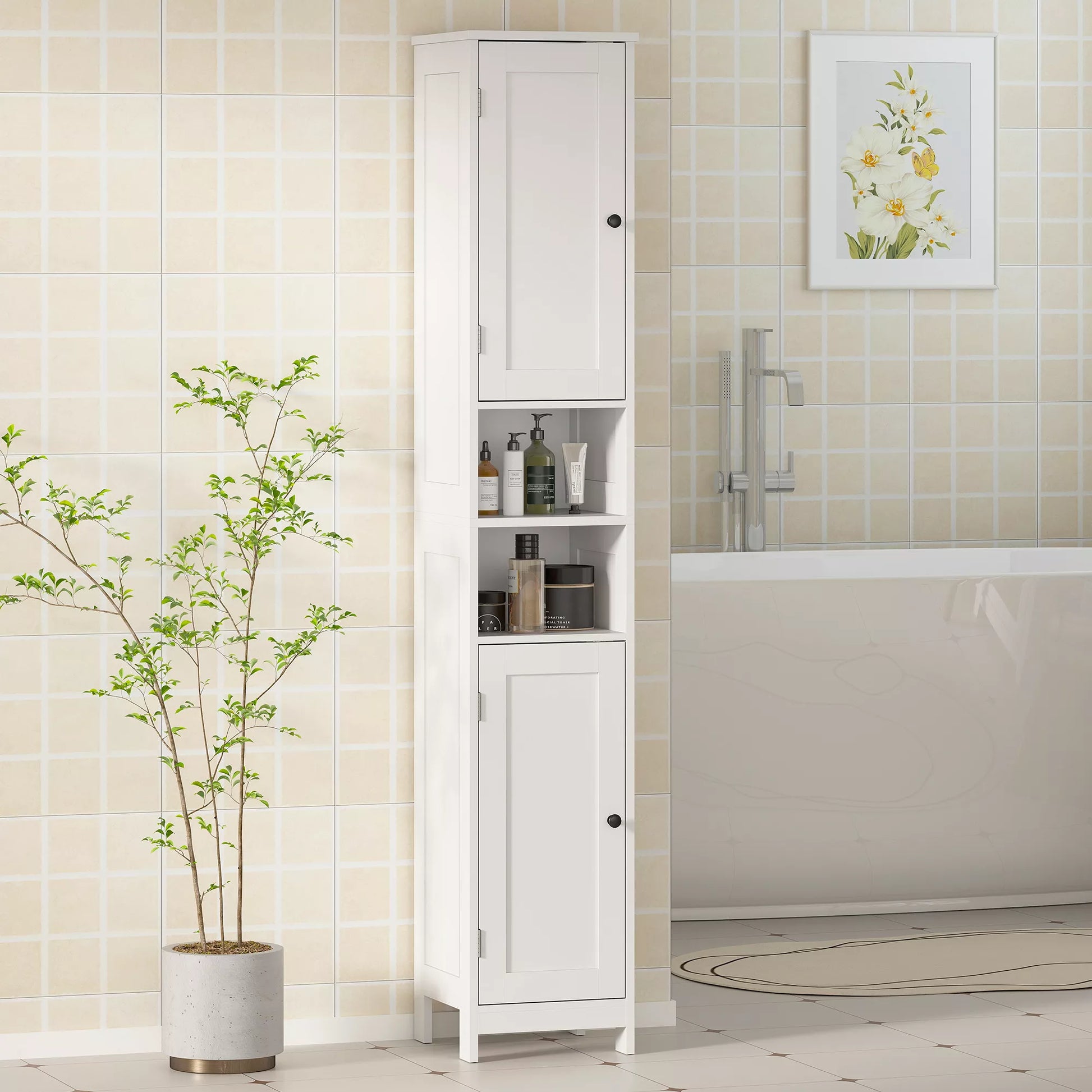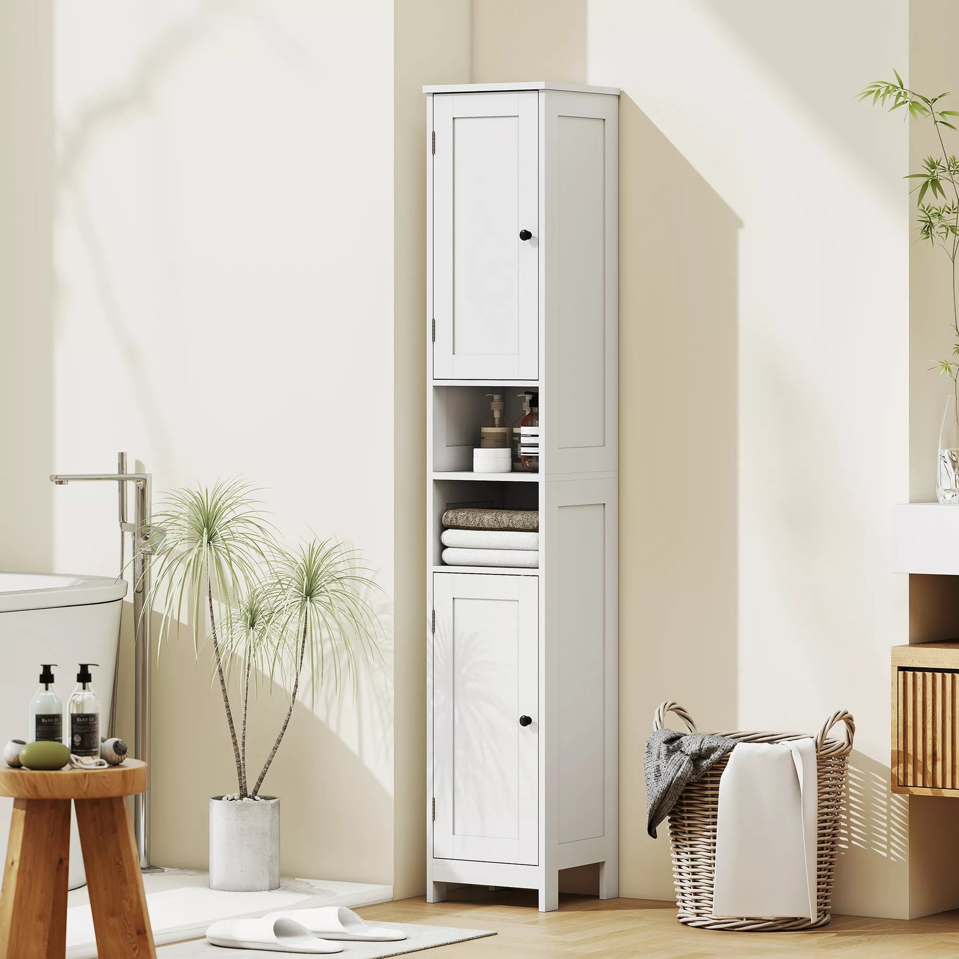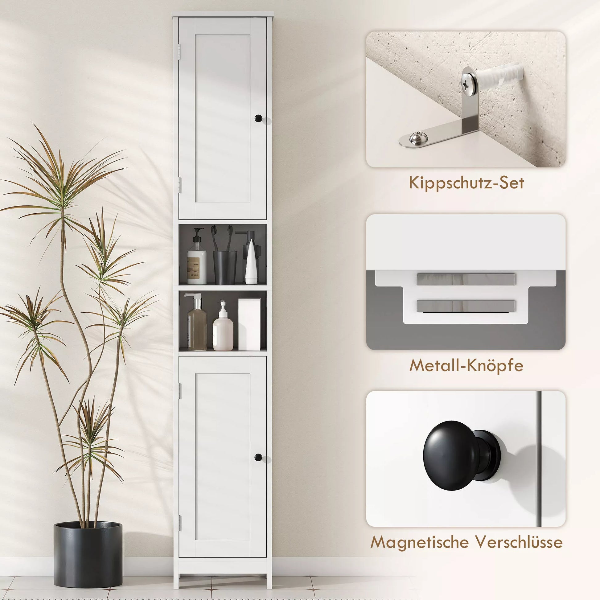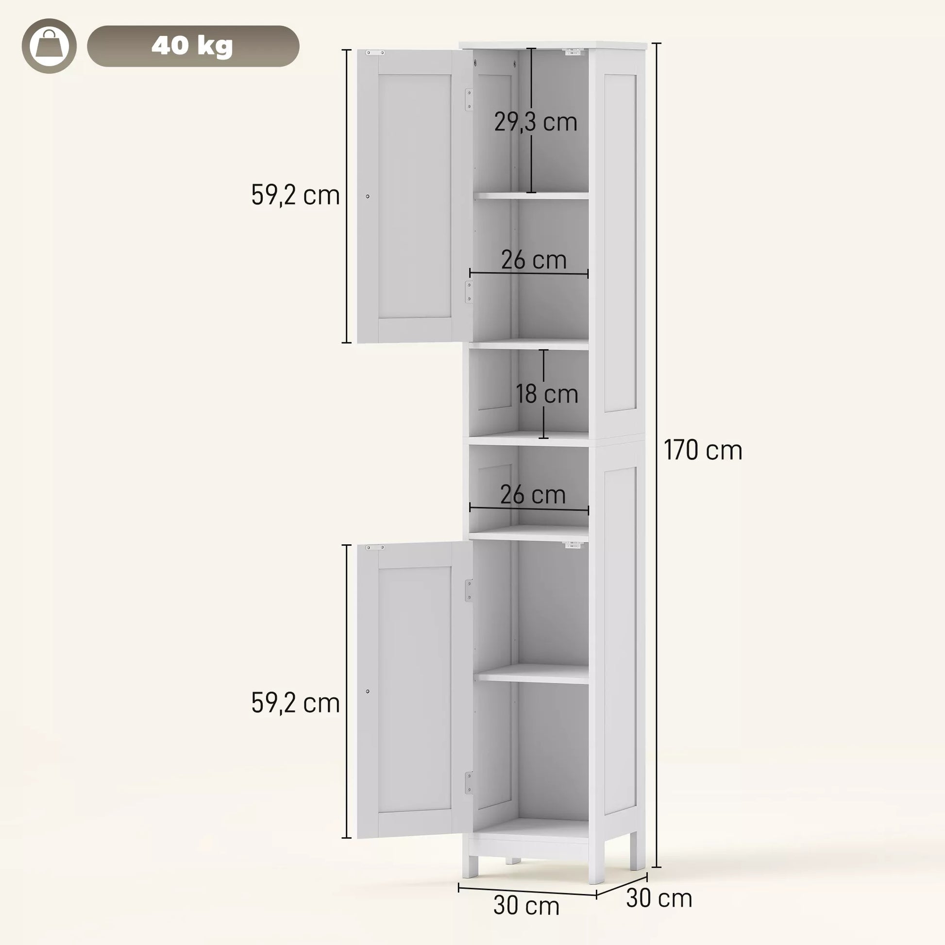 Aukštas, siauras vonios spintelė su durelėmis, atviromis lentynomis, 30 x 30 x 170 cm, balta