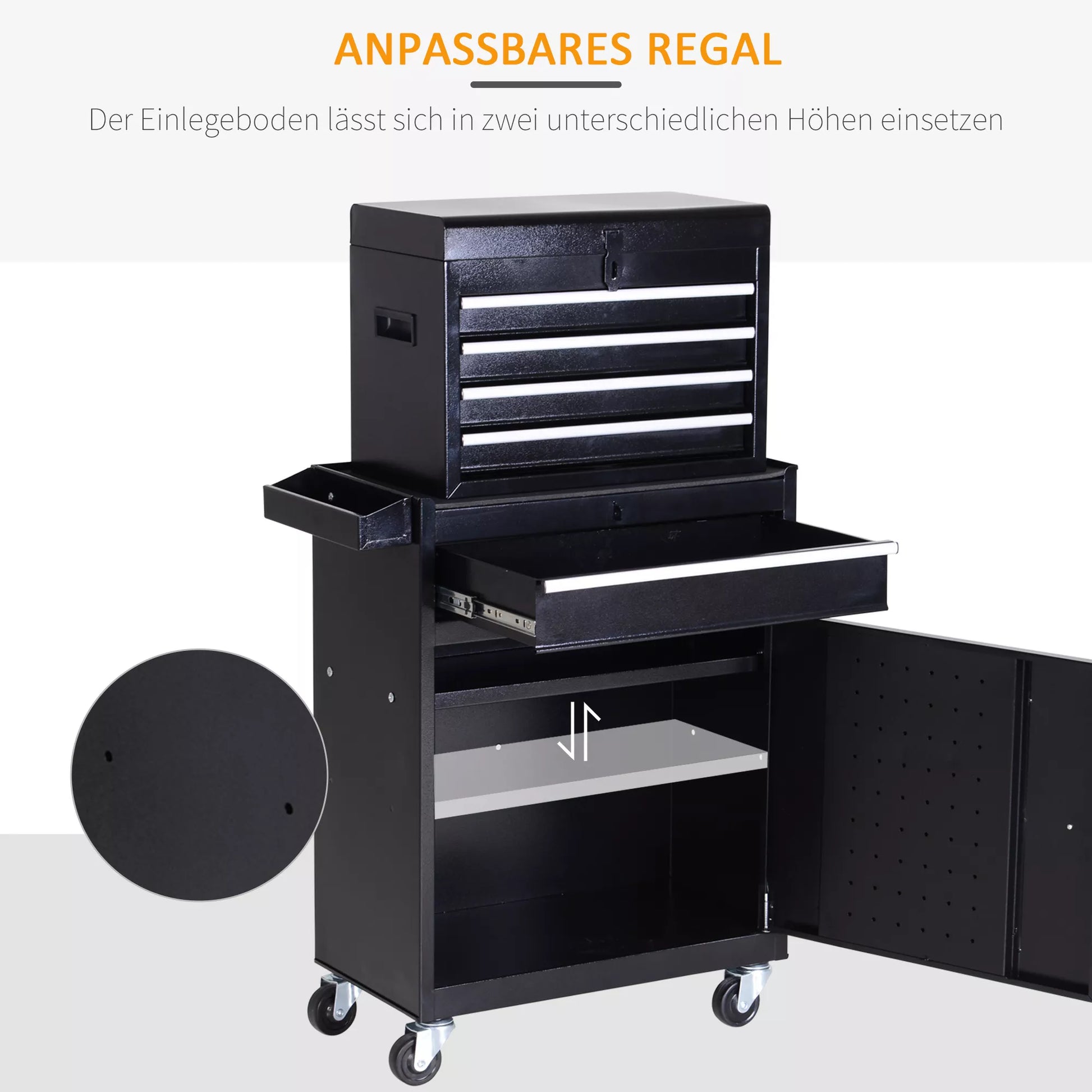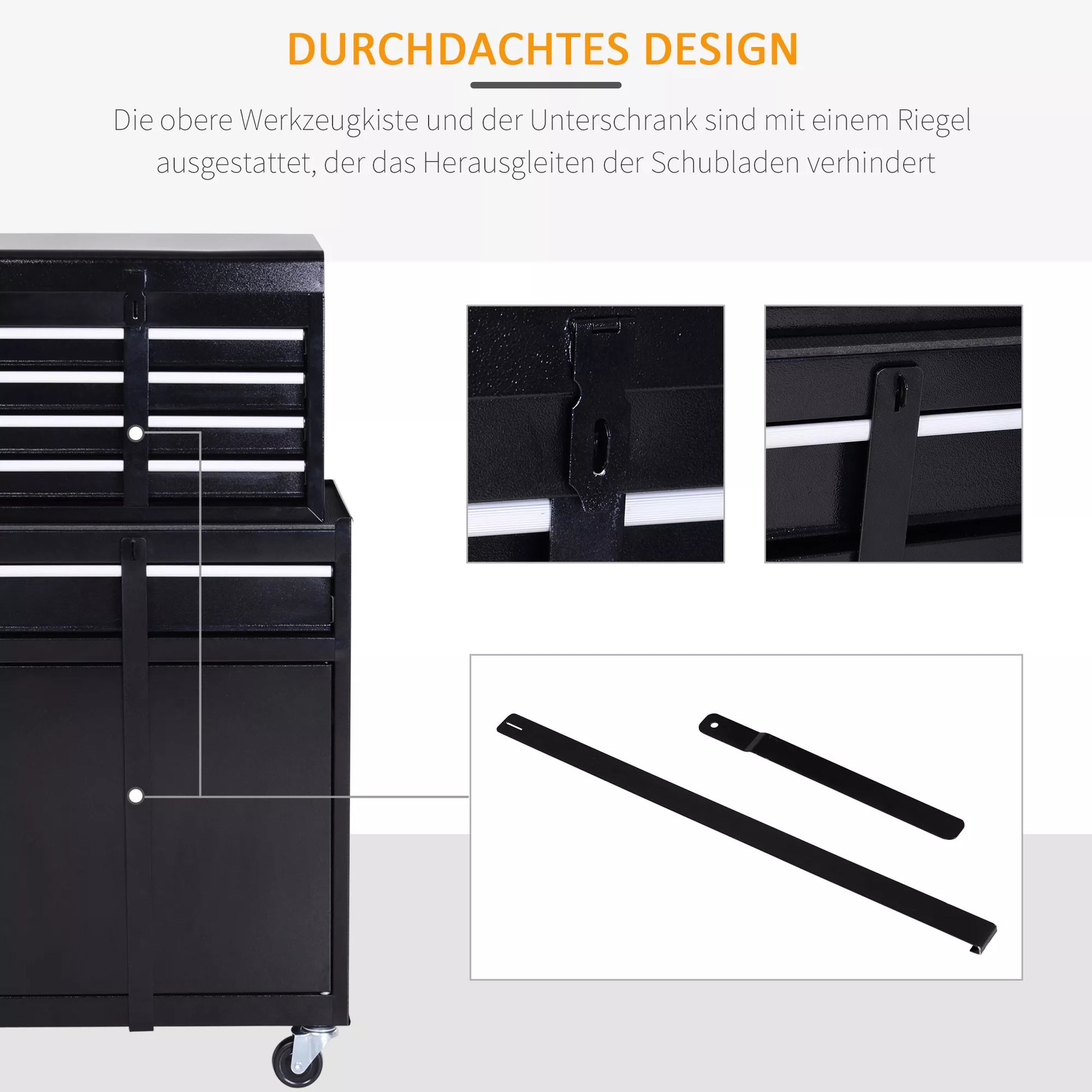 - ✔ Su fiksavimo strypais saugumui ir tvarkai palaikyti net perkeliant įrankių spintelę (užrakinama, spyna ir raktai į komplektą neįeina)