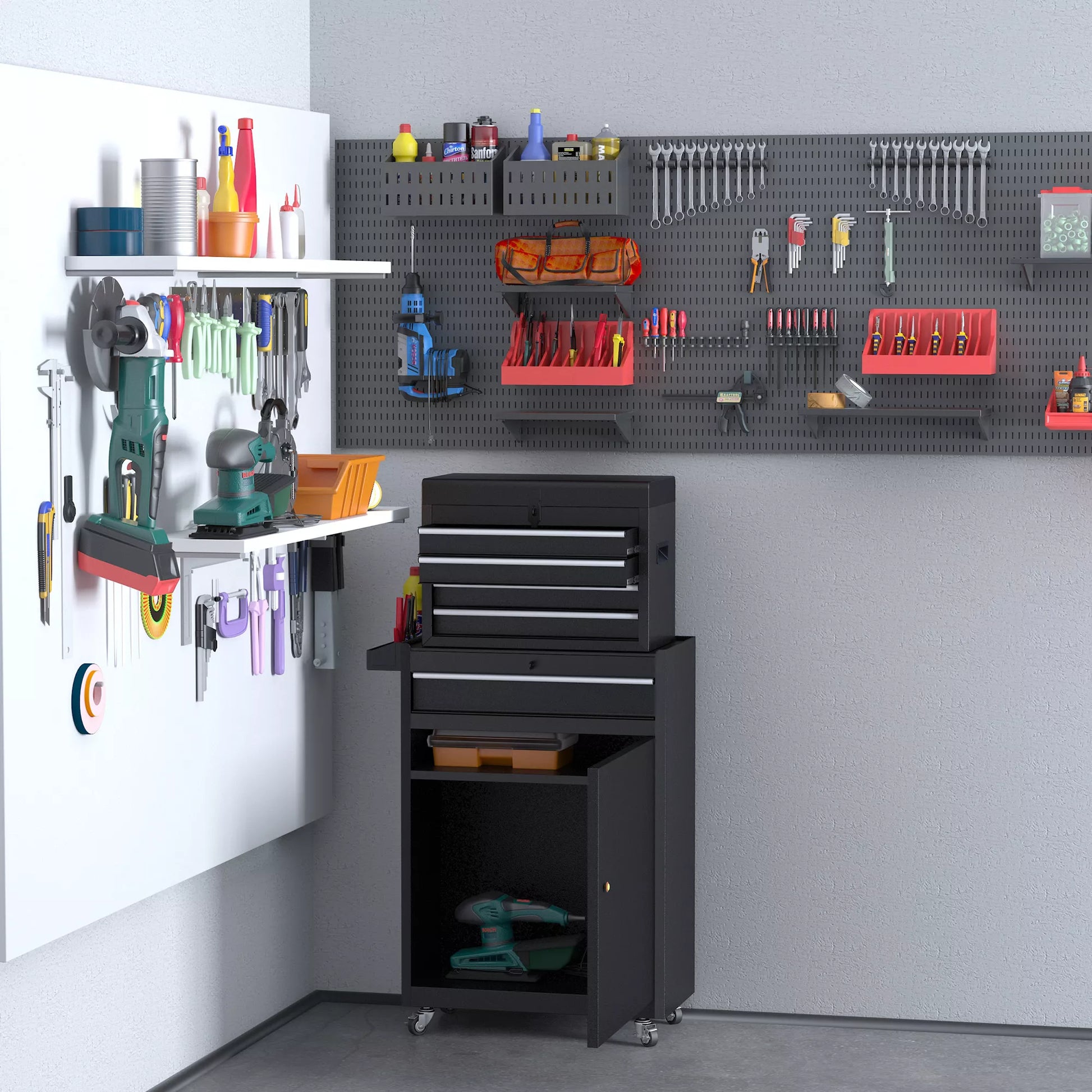 Čia tilps viskas: erdvi DURHAND įrankių spintelė turi didelį apatinį skyrių su viena didesne ir keturiomis mažesnėmis stalčiais bei nuimamu įrankių dėklu. Spintelės durų vidinėje pusėje rasite praktišką lentynėlę jūsų dažniausiai naudojamiems ir po ranka norimiems laikyti įrankiams. Įrankių spintelė puikiai tinka garažui, dirbtuvėms ar sodo nameliui.