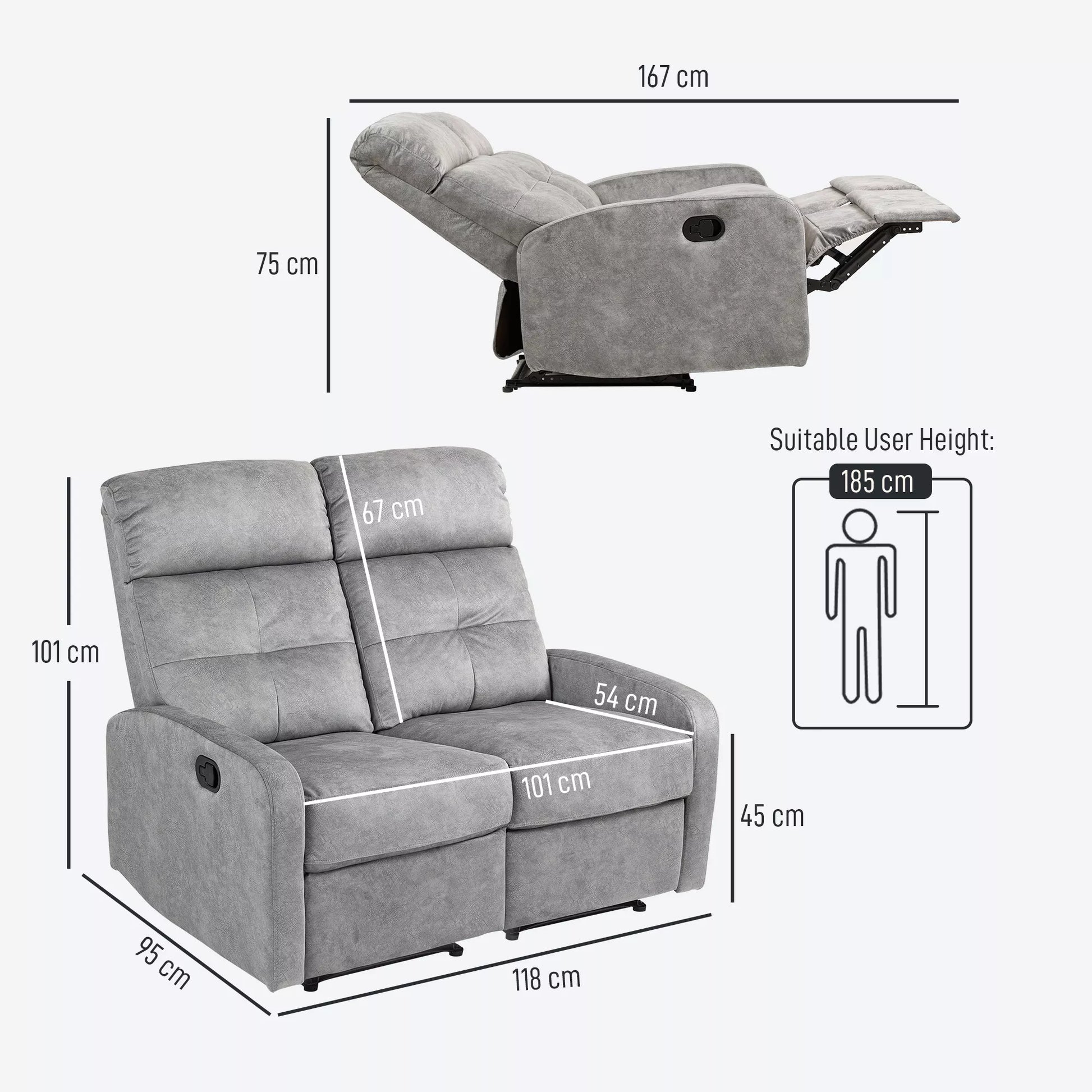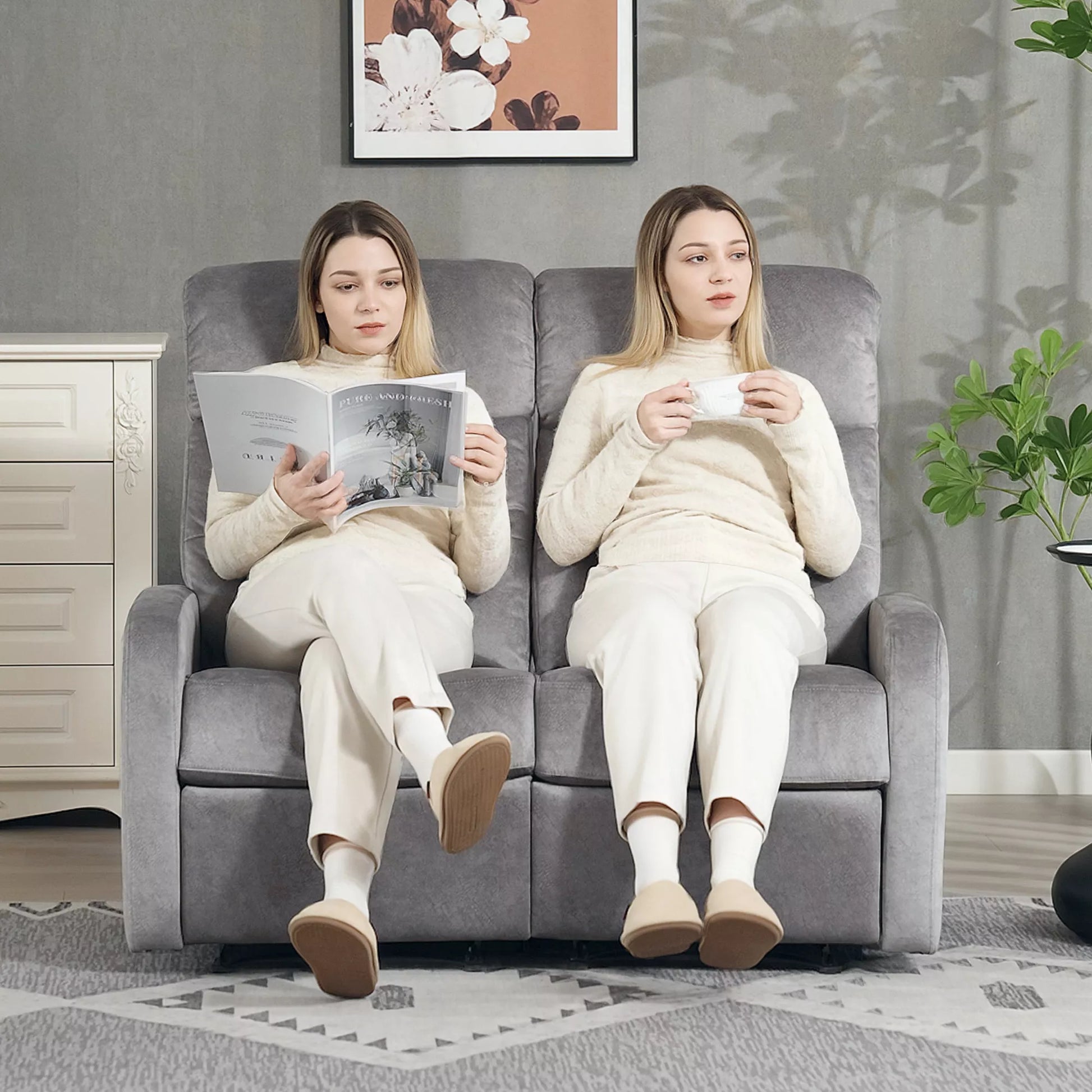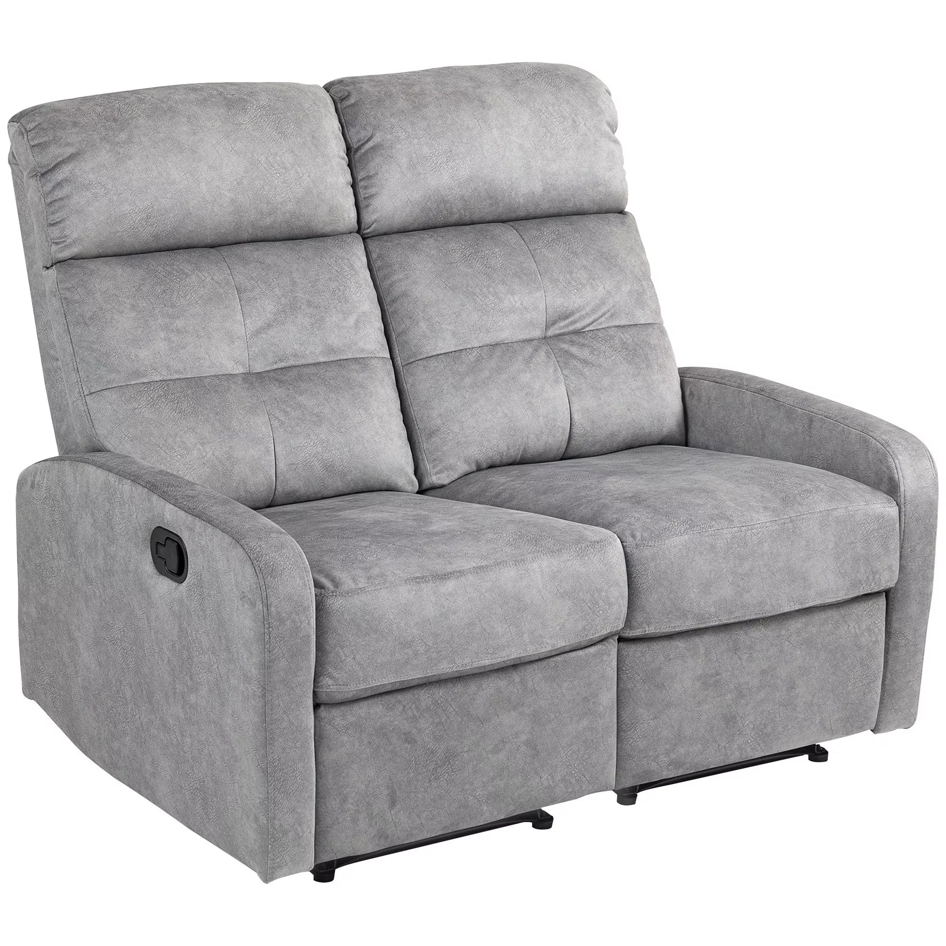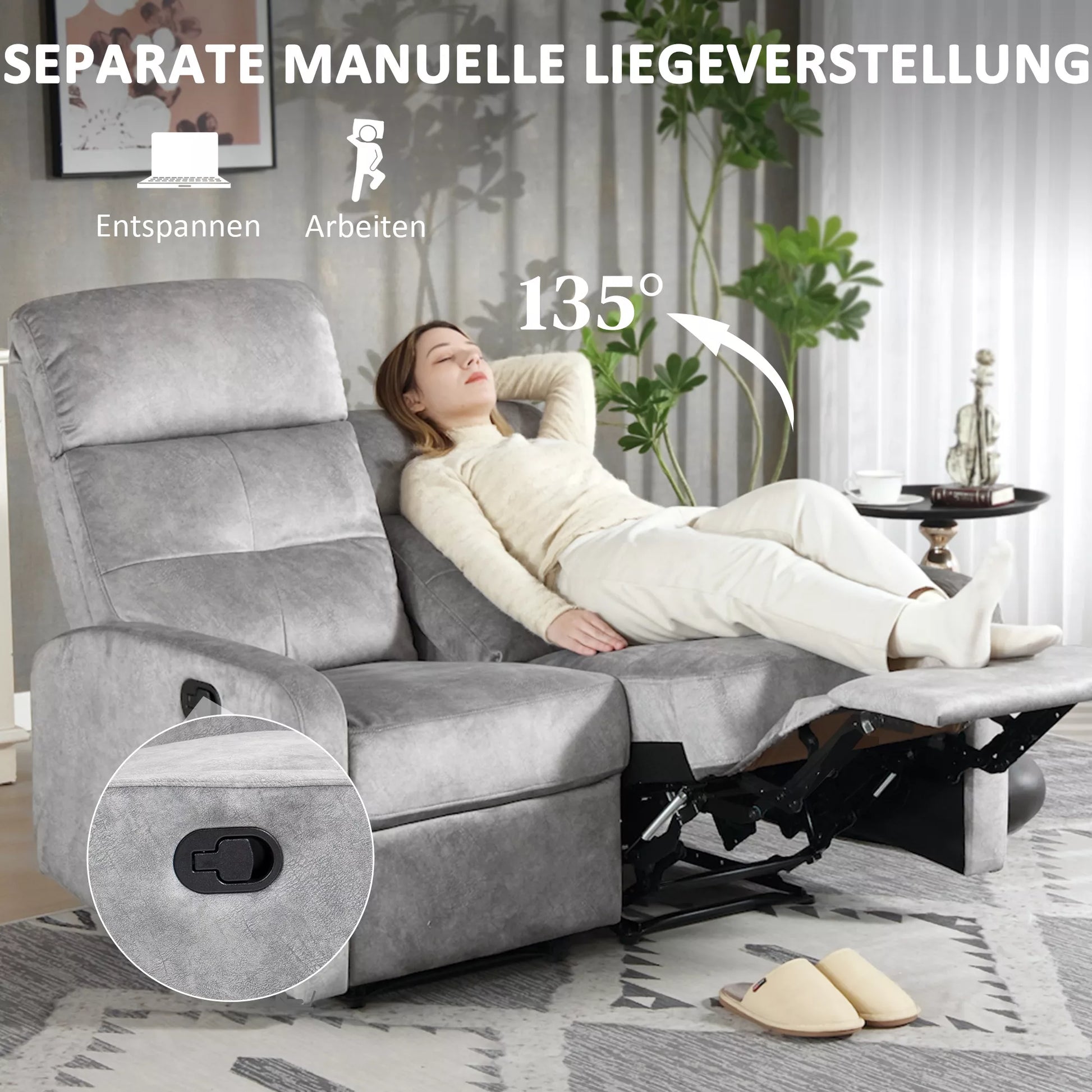 Dviejų vietų fotelis, poilsio fotelis su reguliuojama dviguba atlošimo dalimi ir kojų atrama, skirtas svetainei, pilkas audinio apmušalas