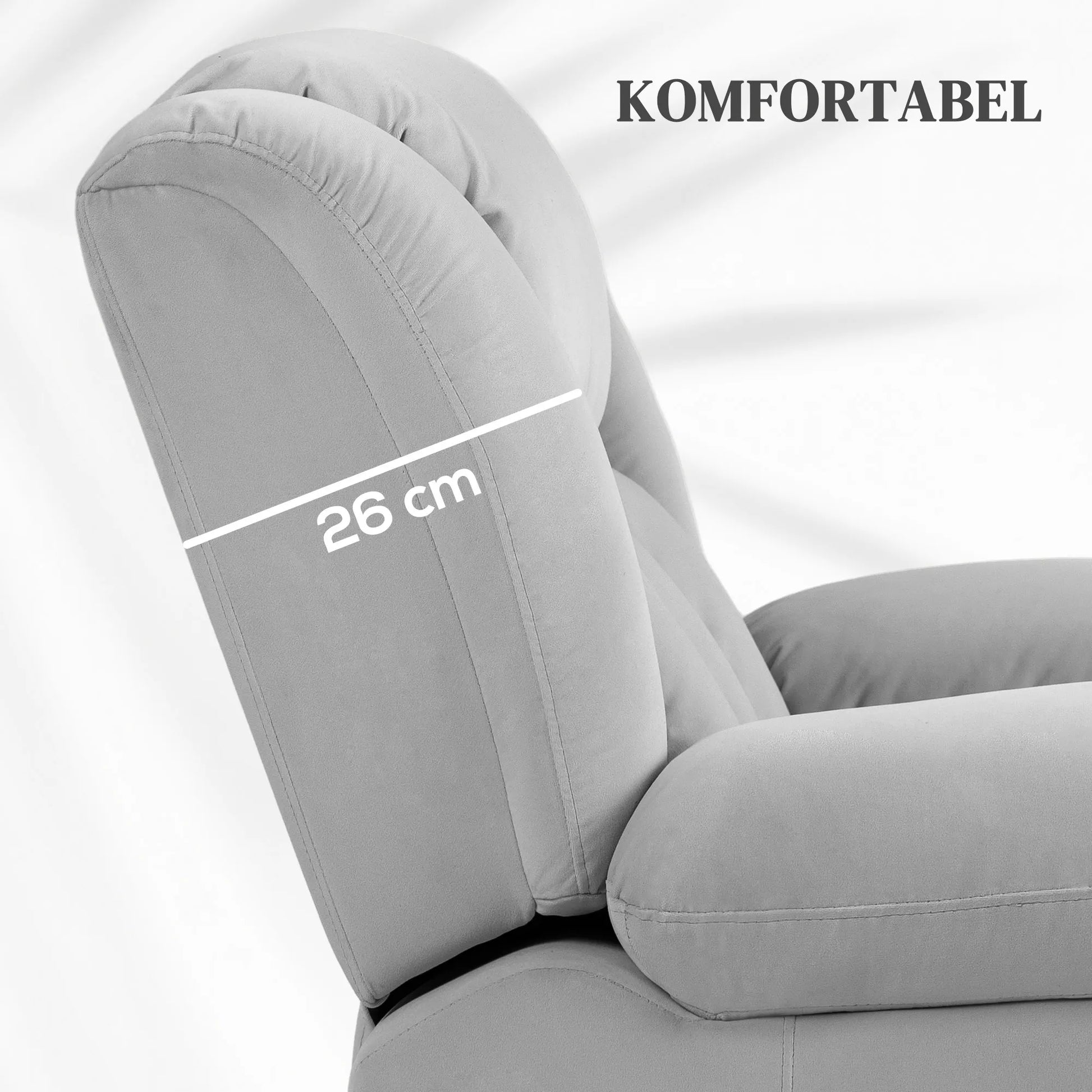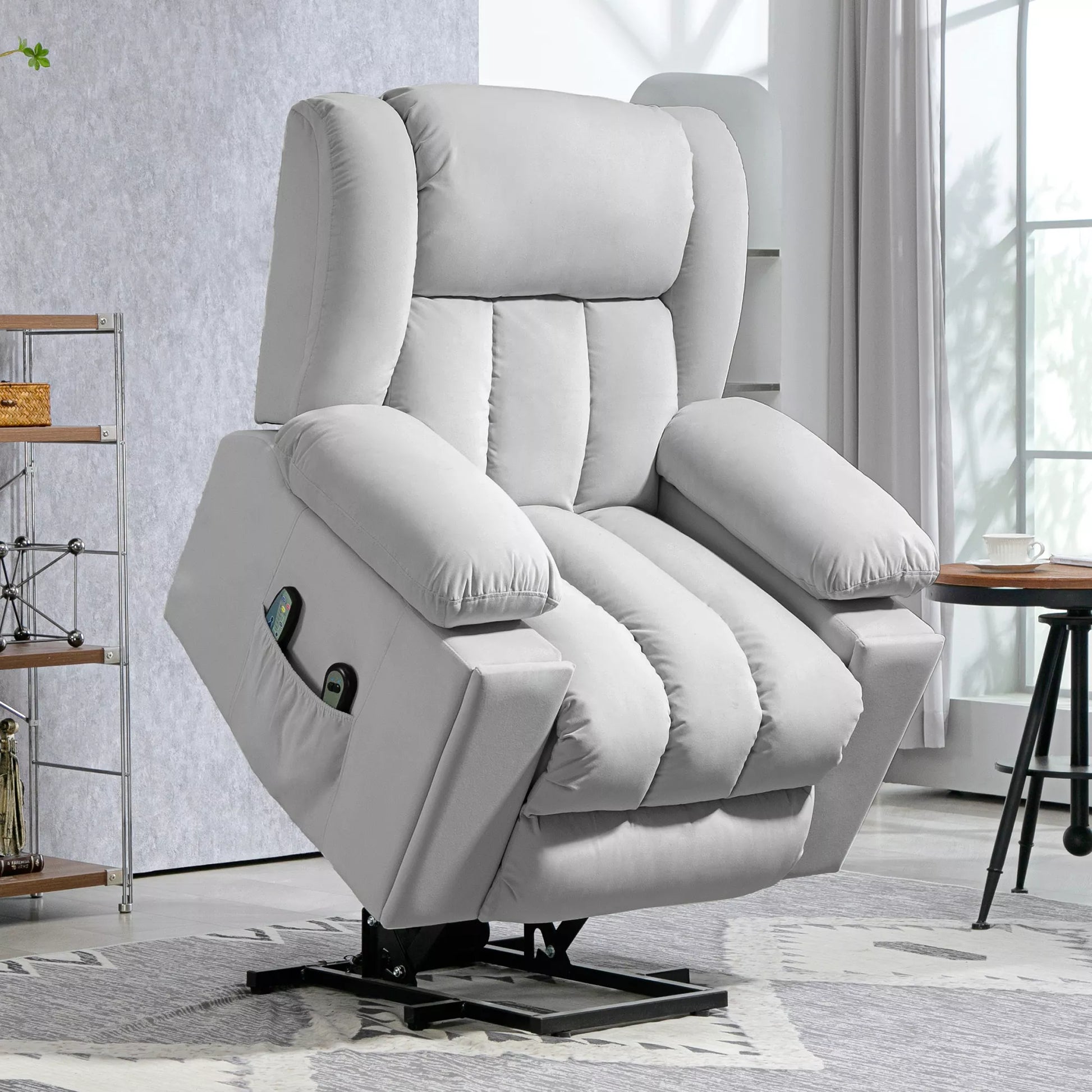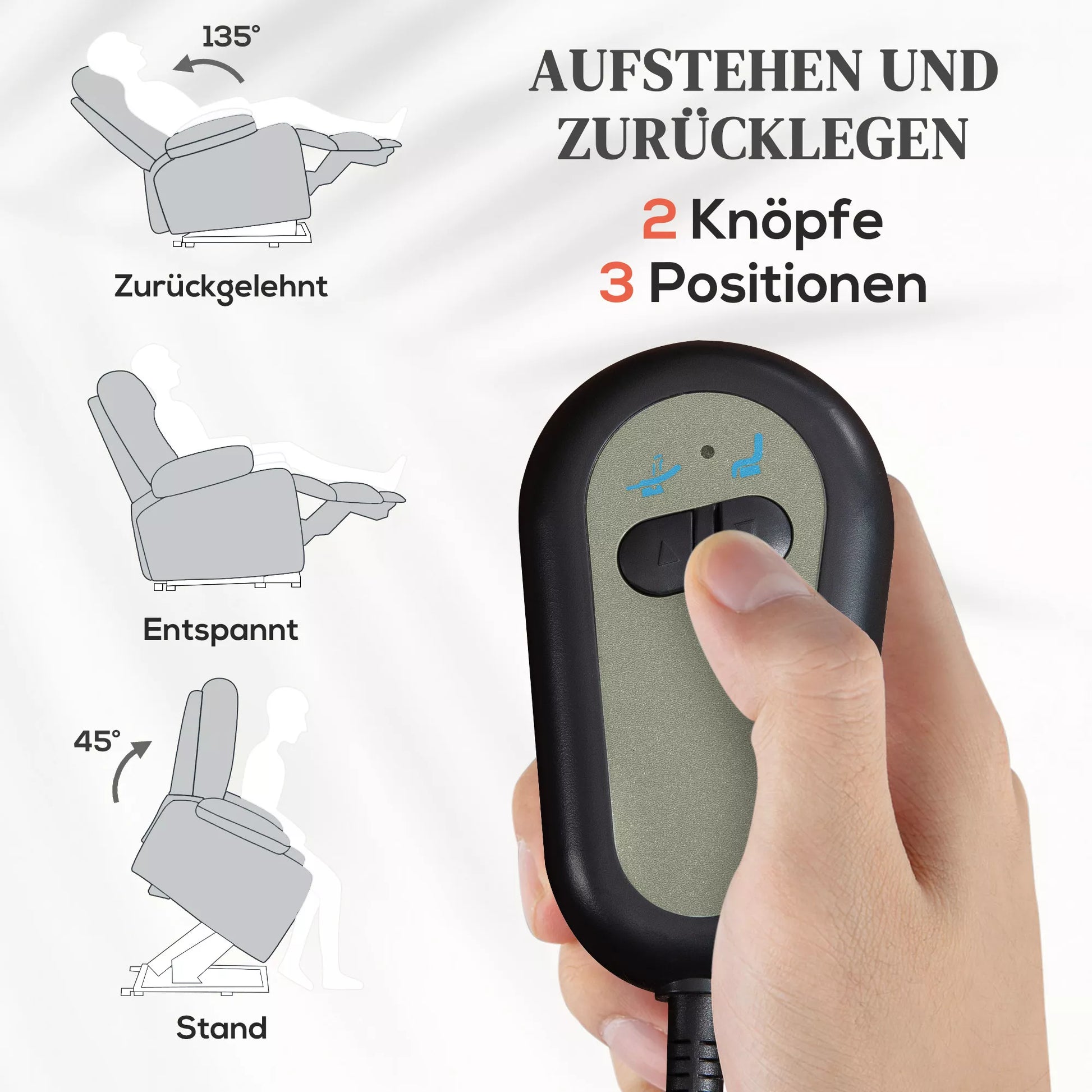 Patirkite poilsio fotelio su pakėlimo funkcija patogumą. Šis kino fotelis su 45° pakėlimo funkcija lengvam atsistojimui ir 135° laipsnių atlenkiama atlošo atrama optimaliam atsipalaidavimui, taip pat turi 8 vibracinio masažo taškus ir juosmens šildytuvą. Minkštas, aksominio audinio apmušalas užtikrina maksimalų komfortą jūsų namuose.
