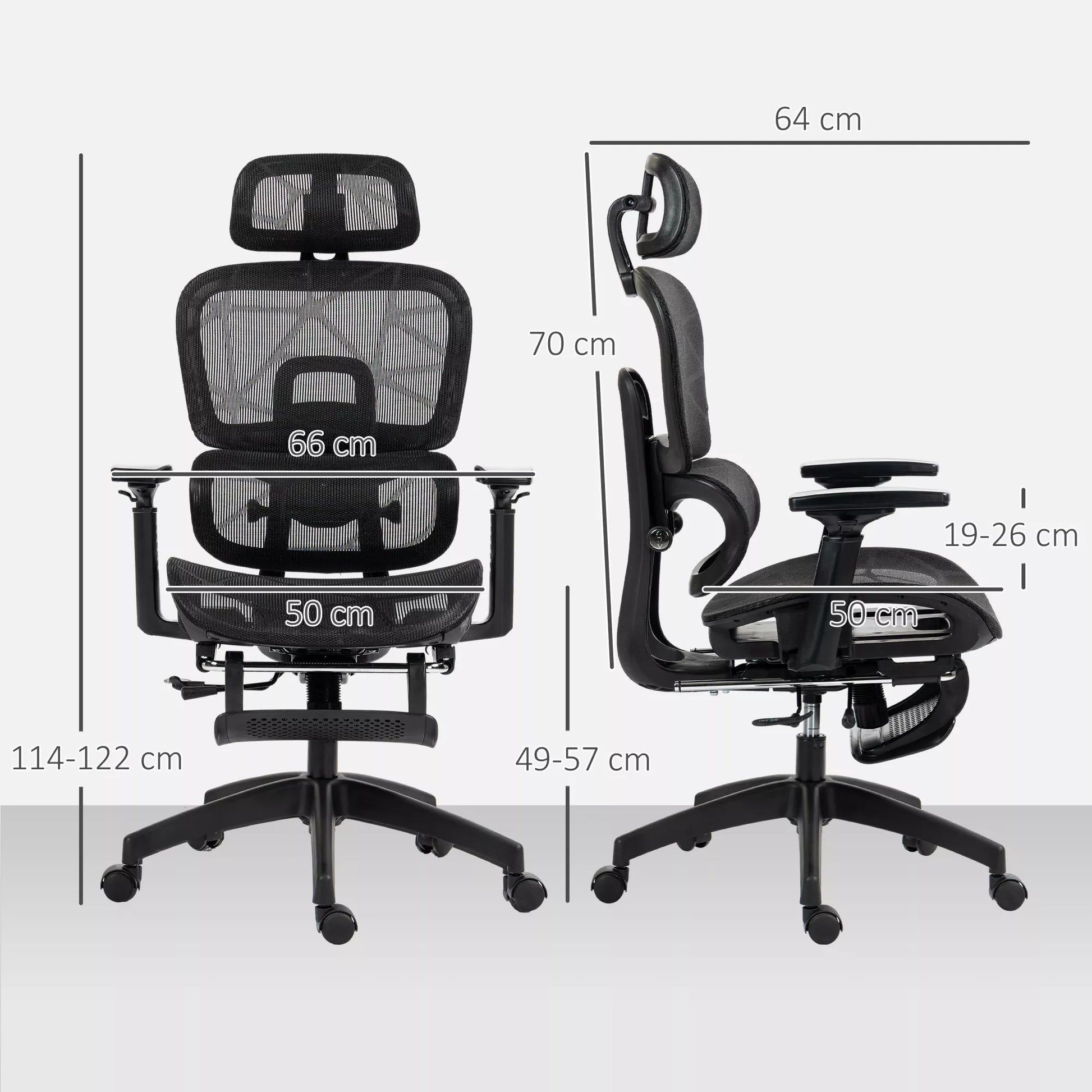 Ergonomiška biuro kėdė su tinklelio apmušalu, reguliuojama, su ratukais, porankiais, galvos atrama, juoda