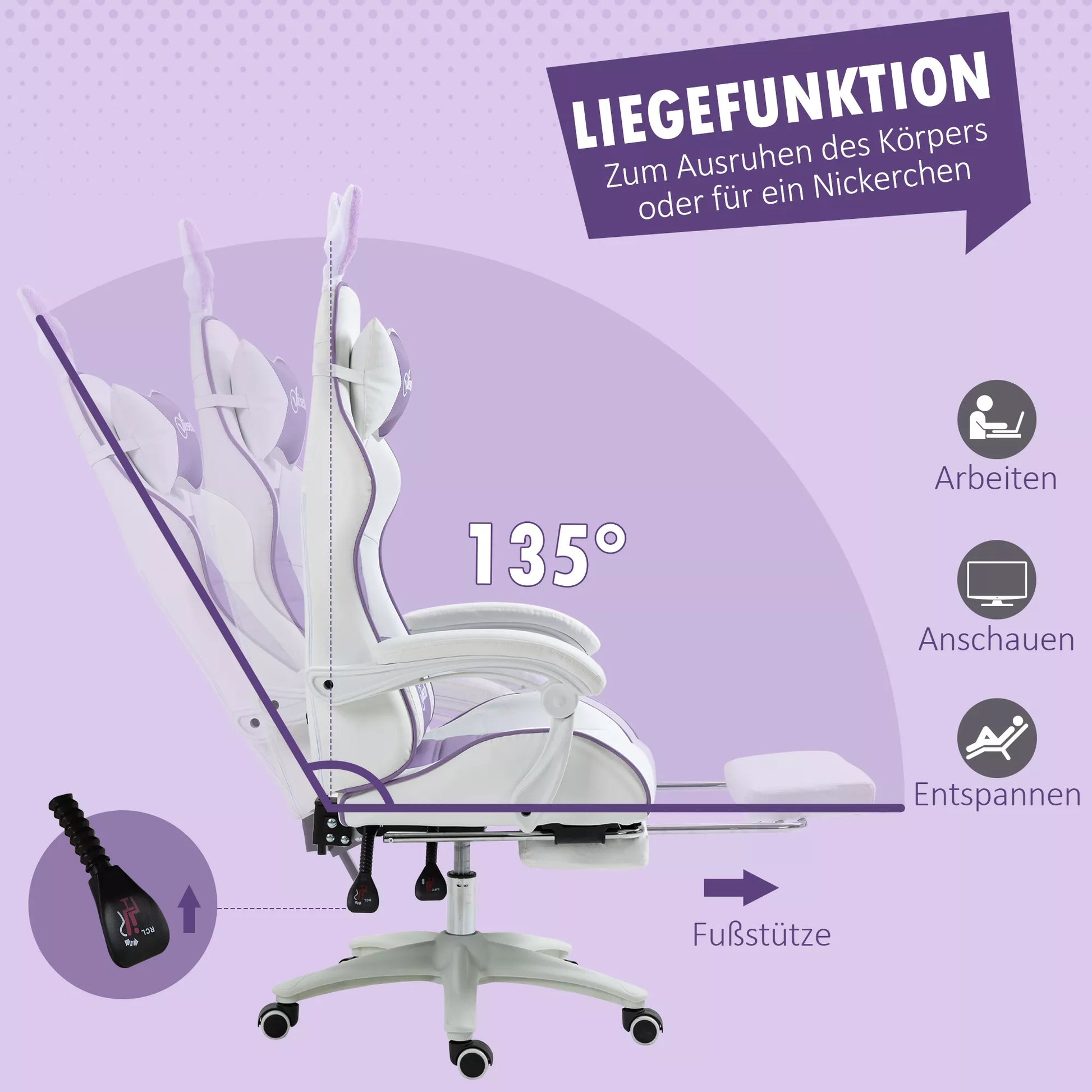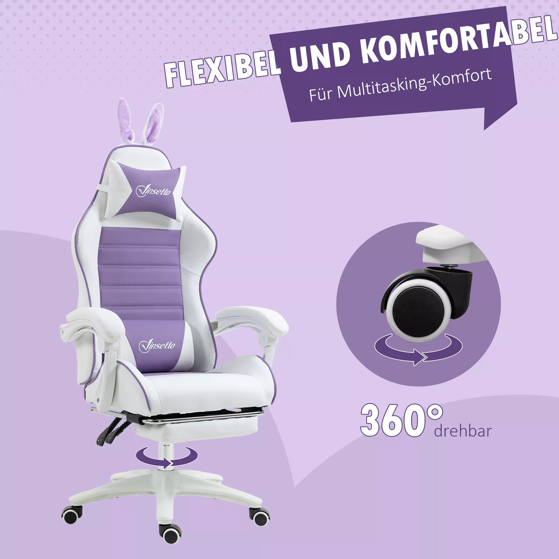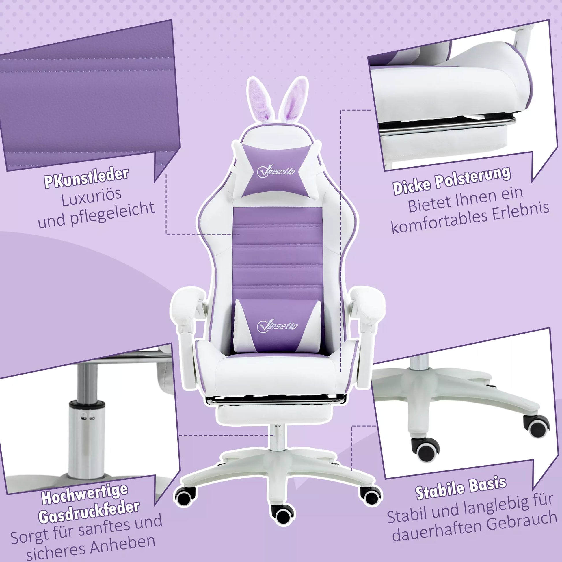 Ergonomiška žaidimų kėdė su juosmens atrama, atrama kojoms, triušio ausų pagalvėle, violetinė