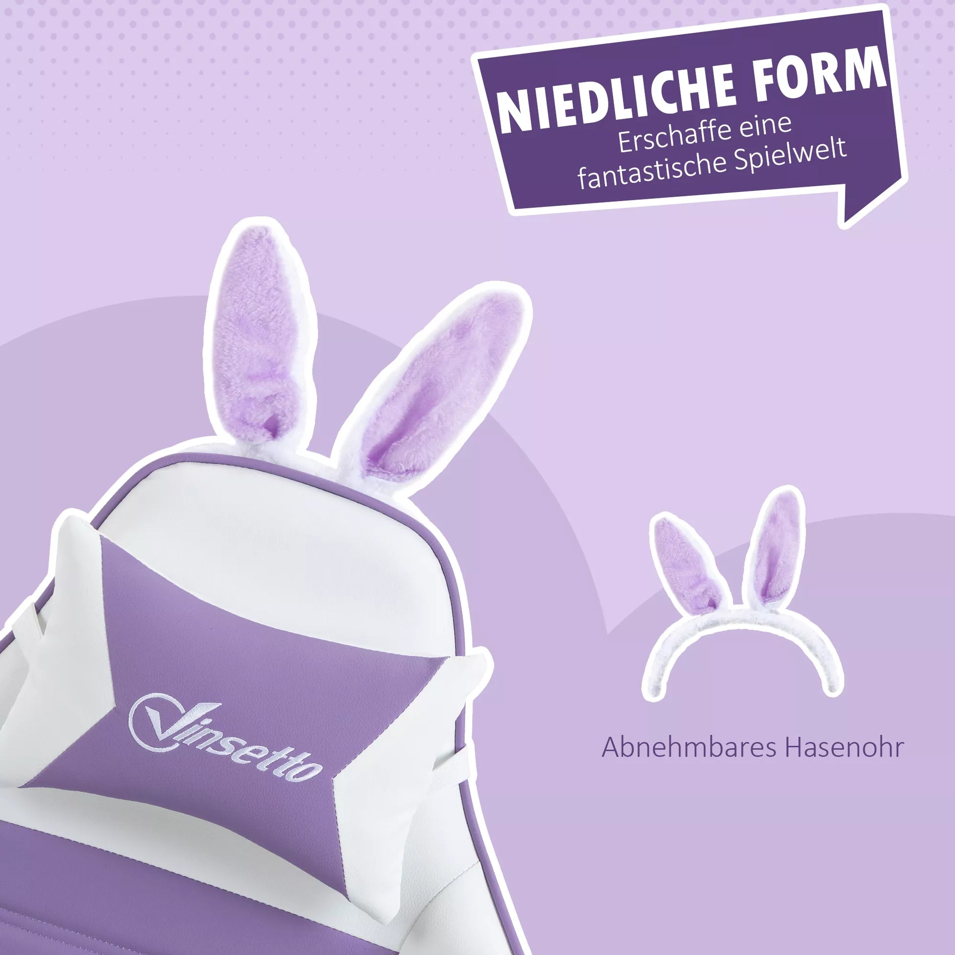 - ✔ Komplekte yra galvos lankelis su zuikučio ausytėmis, suteikiantis žaidimų kėdei linksmumo ir unikalumo, gali būti tvirtinamas arba nuimamas pagal poreikį