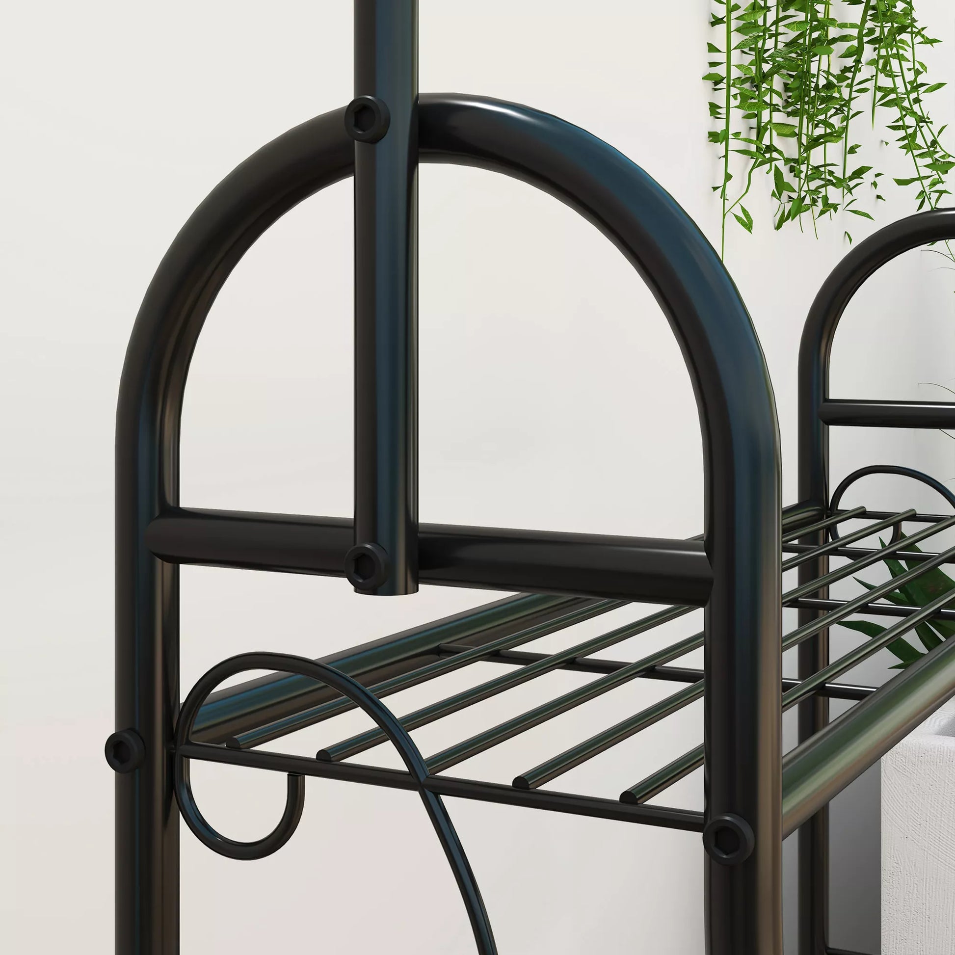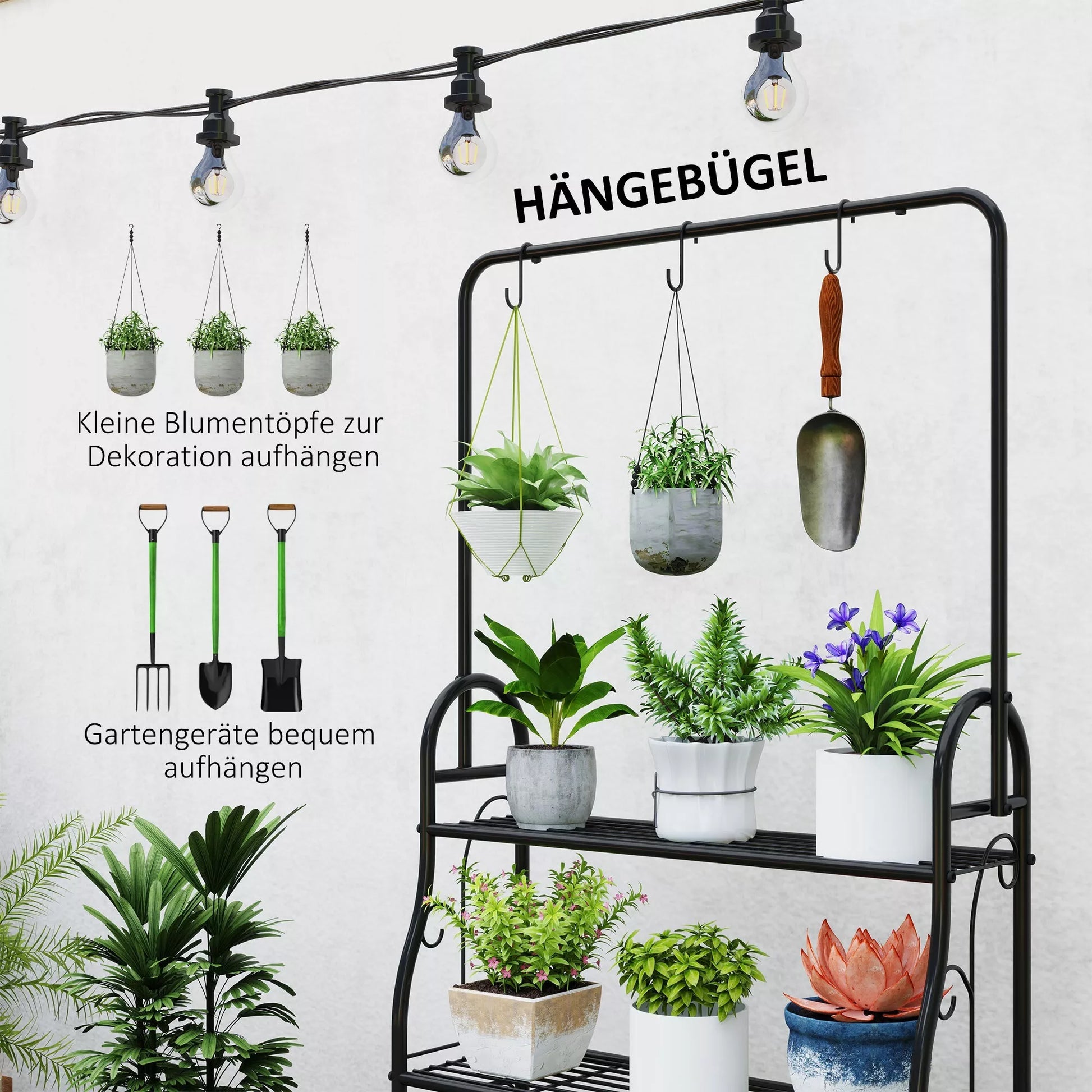 Gėlių lentyna, 3 pakopų augalų lentyna su pakabinimo kabliukais, metalinė lentyna gėlių vazonams, tinkama naudoti viduje ir lauke, juoda.