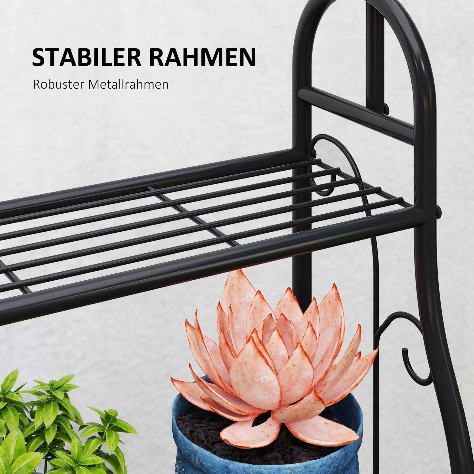 Padidinkite savo augalų pasaulio žavesį su gėlių stoveliu! Ši trijų pakopų gėlių stovo konstrukcija ne tik stilingai pristato jūsų augalus, bet ir turi naudingus pakabinimo kabliukus vazonams bei įrankiams. Pagamintas iš nerūdijančio, milteliais dengto metalo, augalų stovas tinka naudoti tiek viduje, tiek lauke. Atviros grotelės neleidžia kauptis vandeniui, todėl tai idealiu pasirinkimu bet kuriai erdvei.