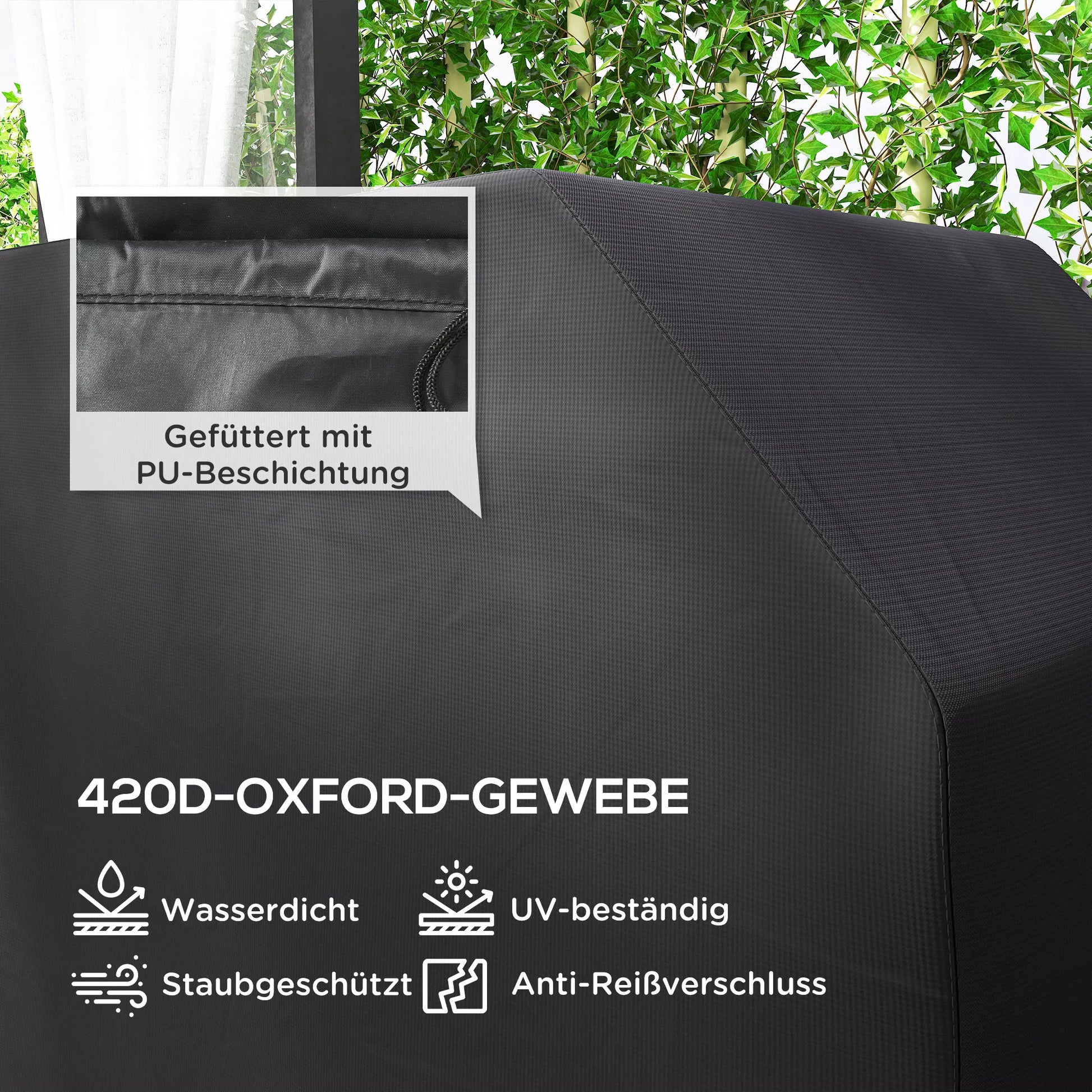 Stilingai apsaugokite savo kepsninę su šiuo uždangalu! Šis dujinės kepsninės uždangalas pagamintas iš 420D Oksfordo audinio su danga. Jis apsaugo nuo vandens, UV spindulių ir dulkių. Praktiški raišteliai ir Velcro užsegimai užtikrina puikų prigludimą, todėl jūsų kepsninė bus paruošta naudoti ištisus metus. Atsipalaiduokite su šiuo elegantišku ir patikimu apsauginiu uždangalu.