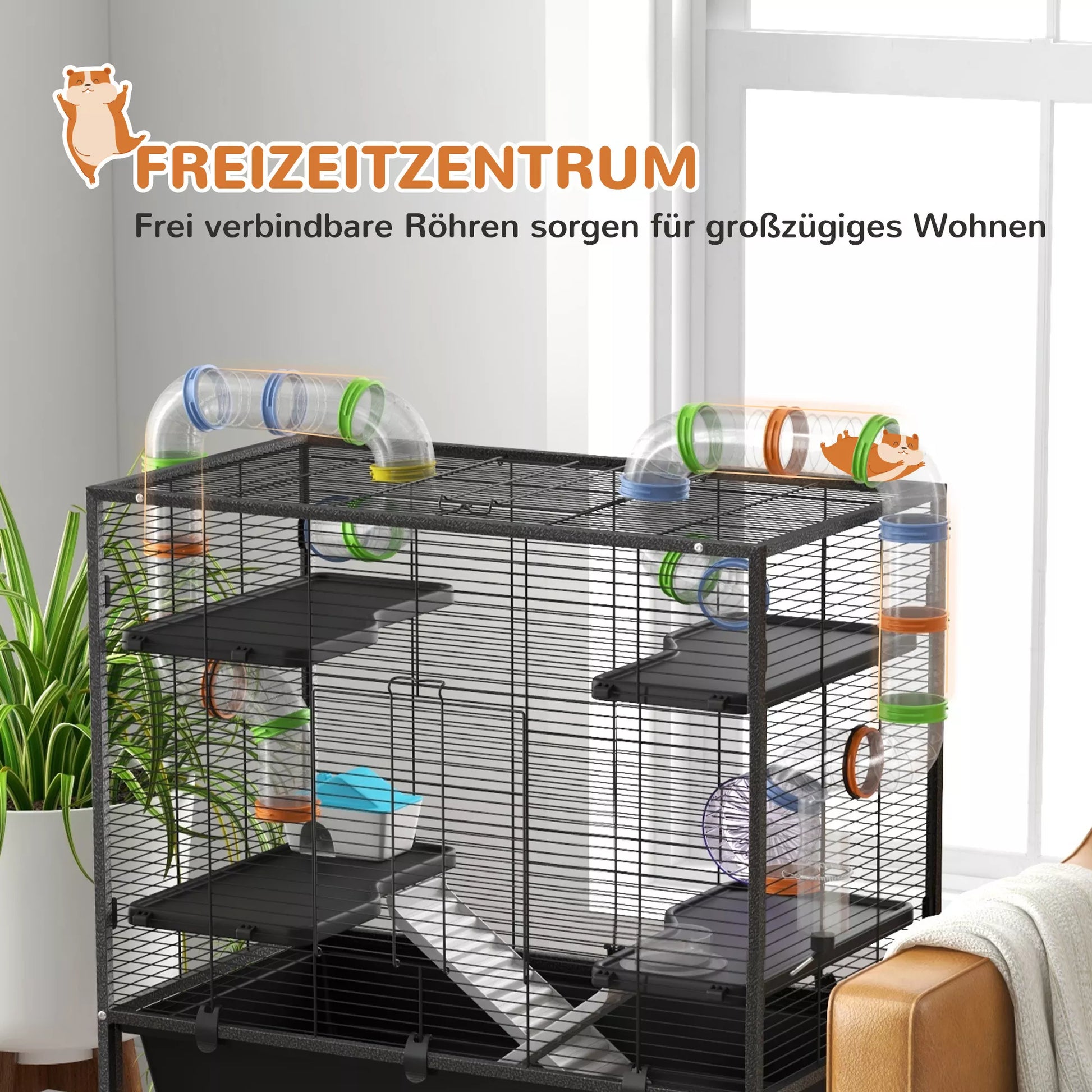 Hamsterio narvas su vamzdeliais, bėgimo ratu, nameliu, vandens dispenseriu, 109 x 82 x 46 cm, juodas