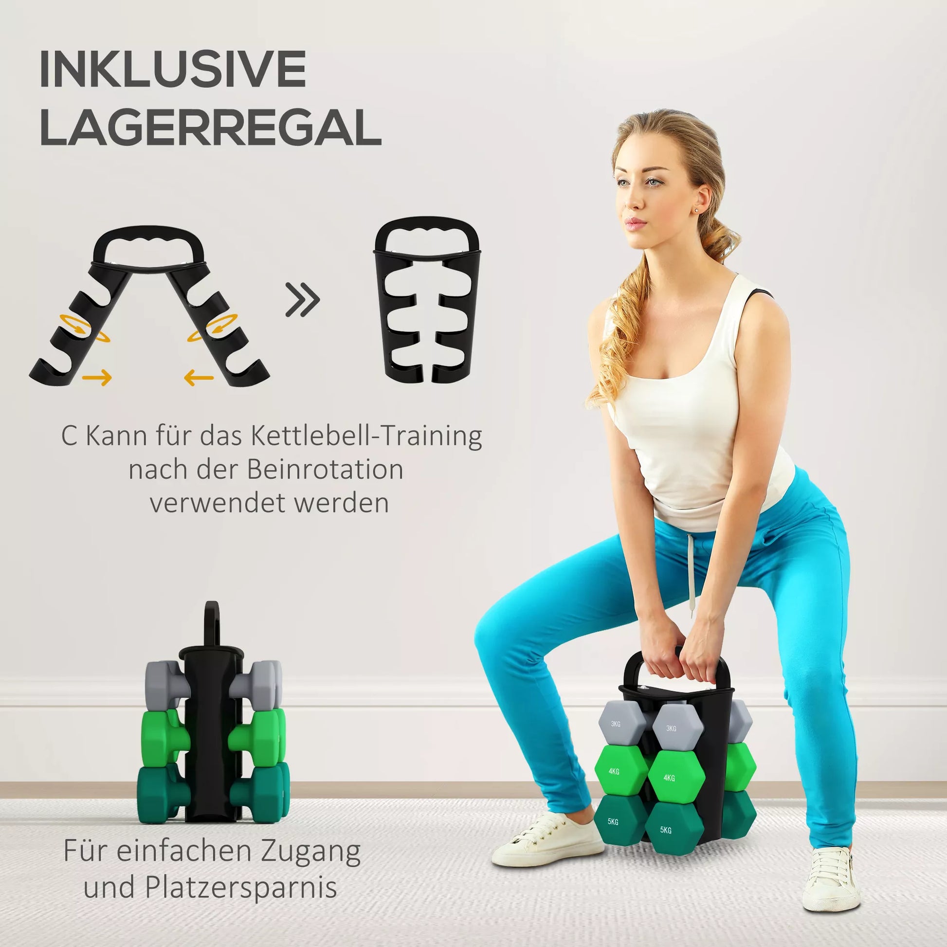 Hantelų rinkinys su laikymo stovu, rinkinys su 6 hanteliais treniruotėms, 2 x 3 kg, 2 x 4 kg, 2 x 5 kg