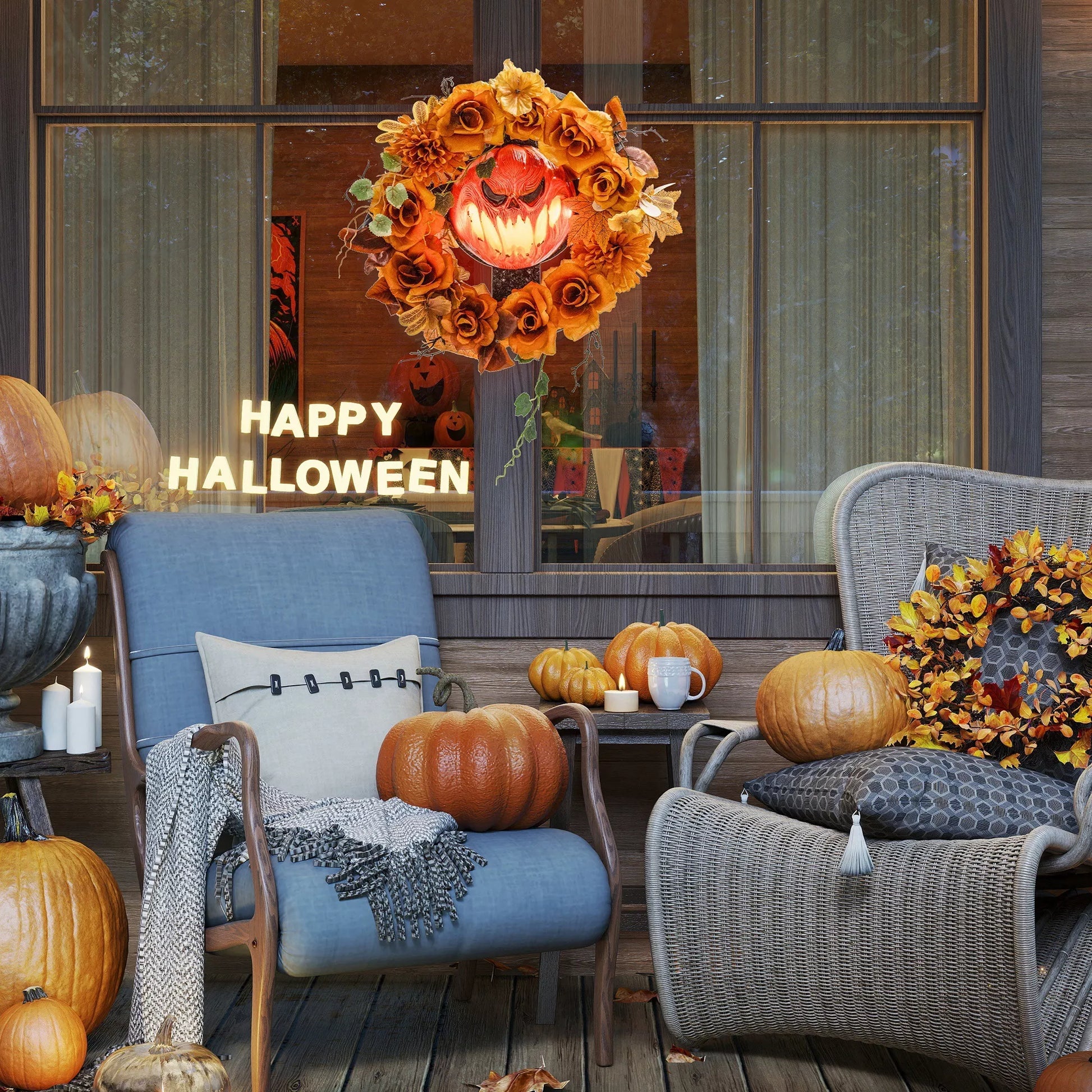 Helovino vainikas, siaubo moliūgo dizainas, rudens lapai, šviesos efektai, plastikas