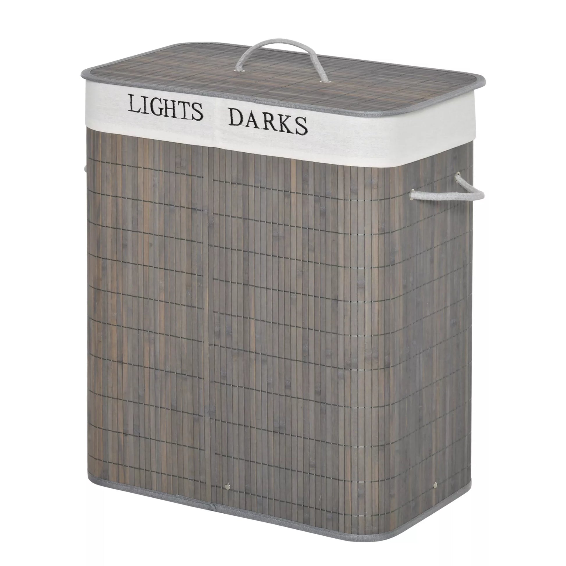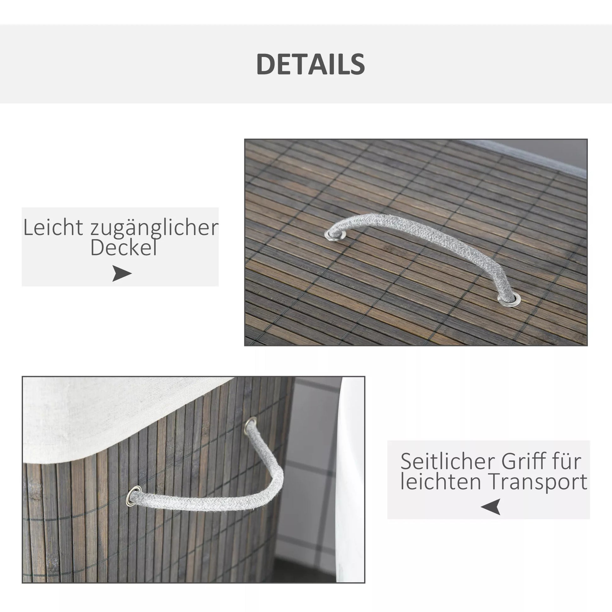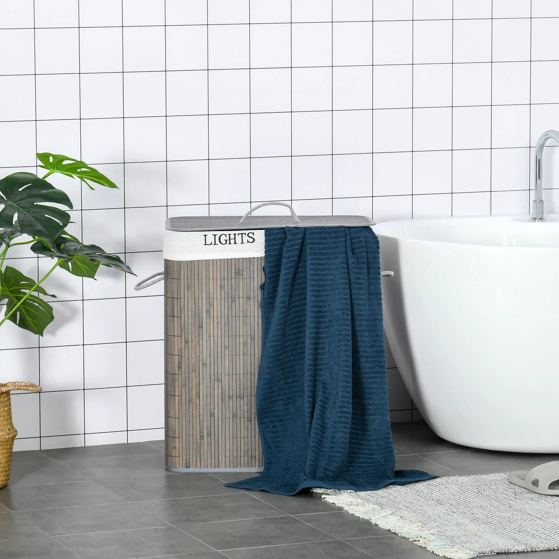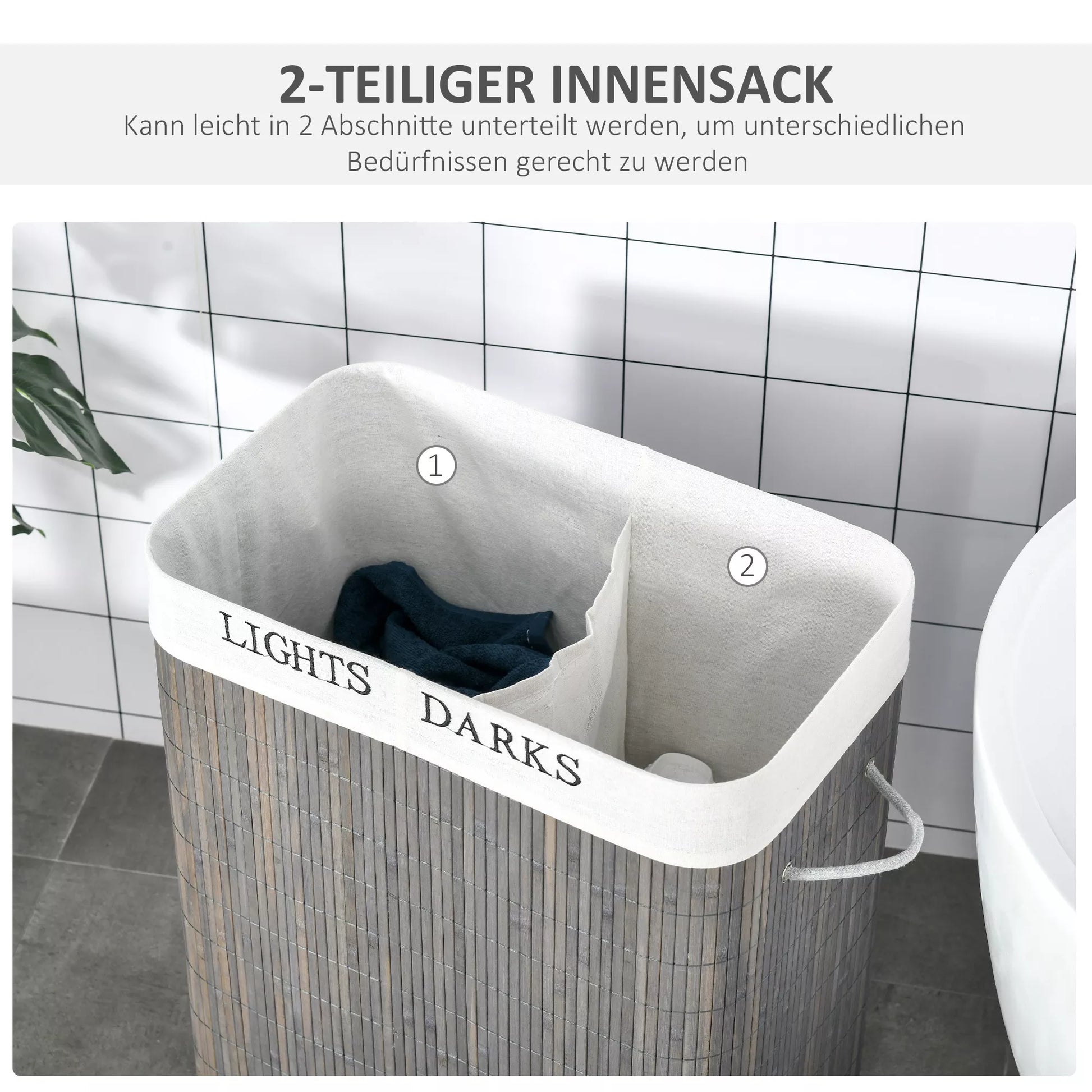 100L skalbinių krepšys su 3 rankenomis, su skalbiamu maišeliu, Bambukas, poliesteris, medvilnė, metalas, 52 x 32 x 63 cm, Pilkas