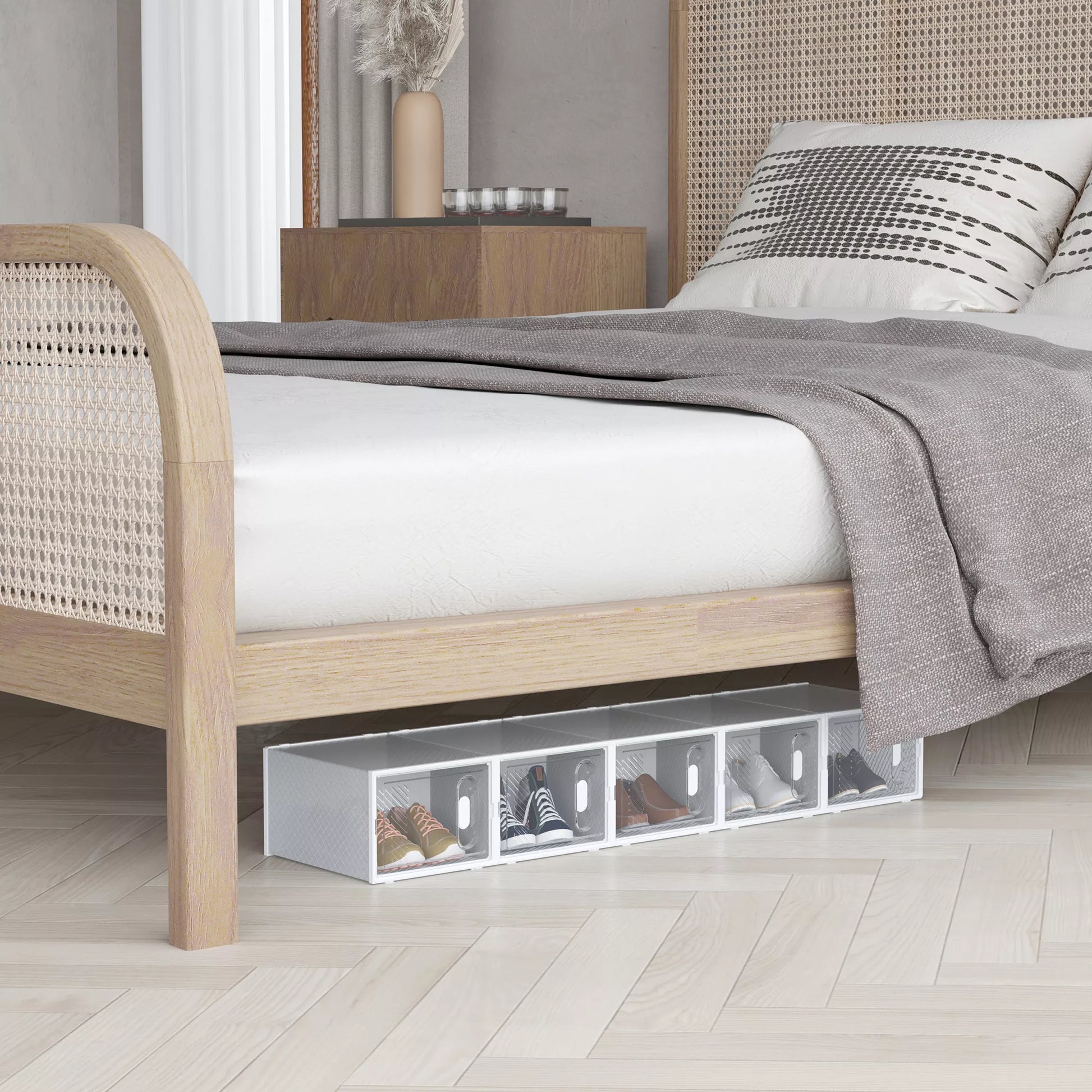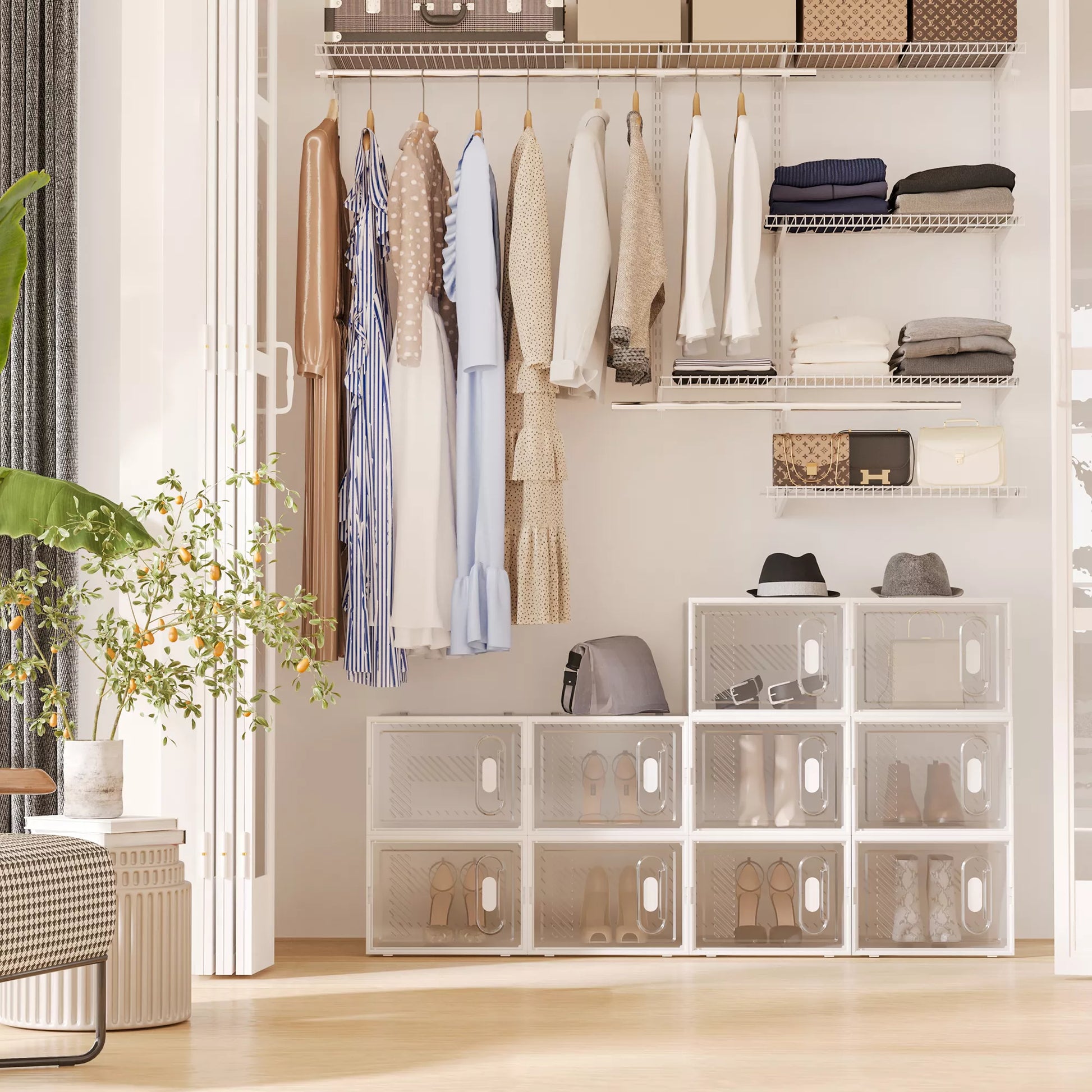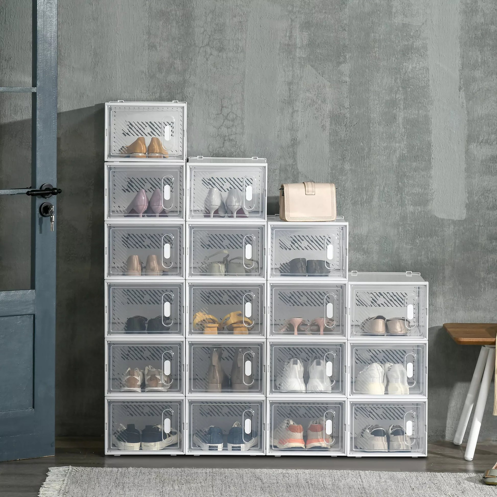 Ar nenorite, kad jūsų batai voliotųsi atidaryti spintoje ir kauptų dulkes? Skaidri batų lentyna siūlo lankstų dizainą su 18 modulių, kuriuos galite individualiai išdėstyti. Dėl viršuje esančio išpjovimo šias jungiamas lentynas galima saugiai sukrauti vieną ant kitos. Skaidrios plastikinės plokštės leidžia greitai rasti viską. Puikus ir tvarkingas priedas jūsų namams!