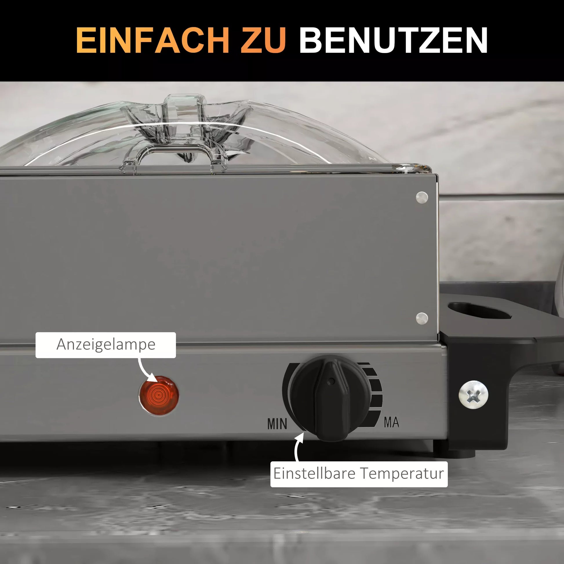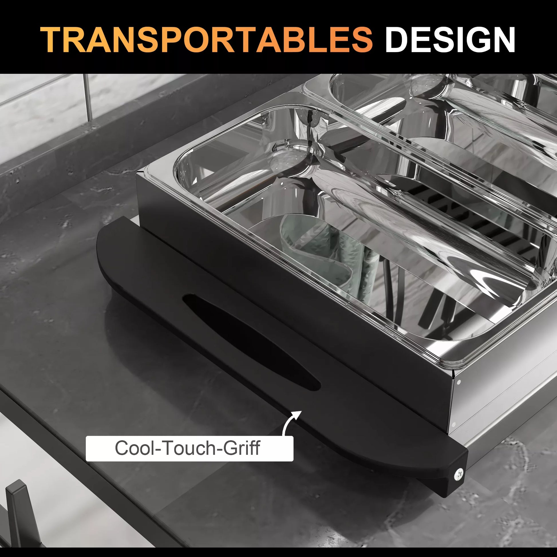Elektrinis maisto pašildytuvas pakelia vakarėlių patiekalus į aukštesnį lygį, užtikrinant nuolat skanų ir šiltą maistą. Šis nerūdijančio plieno maisto pašildytuvas efektyviai išlaiko šilumą. Reguliuojama 58°C–85°C temperatūra leidžia nustatyti norimą karštį. Komplekte yra dvi 1 litro ir dvi 2,4 litro talpos maisto indai, kiekvienas su permatomu dangčiu, kuris išlaiko maistą šiltą. Maisto pašildytuvas turi vėsias rankenas saugiam naudojimui.