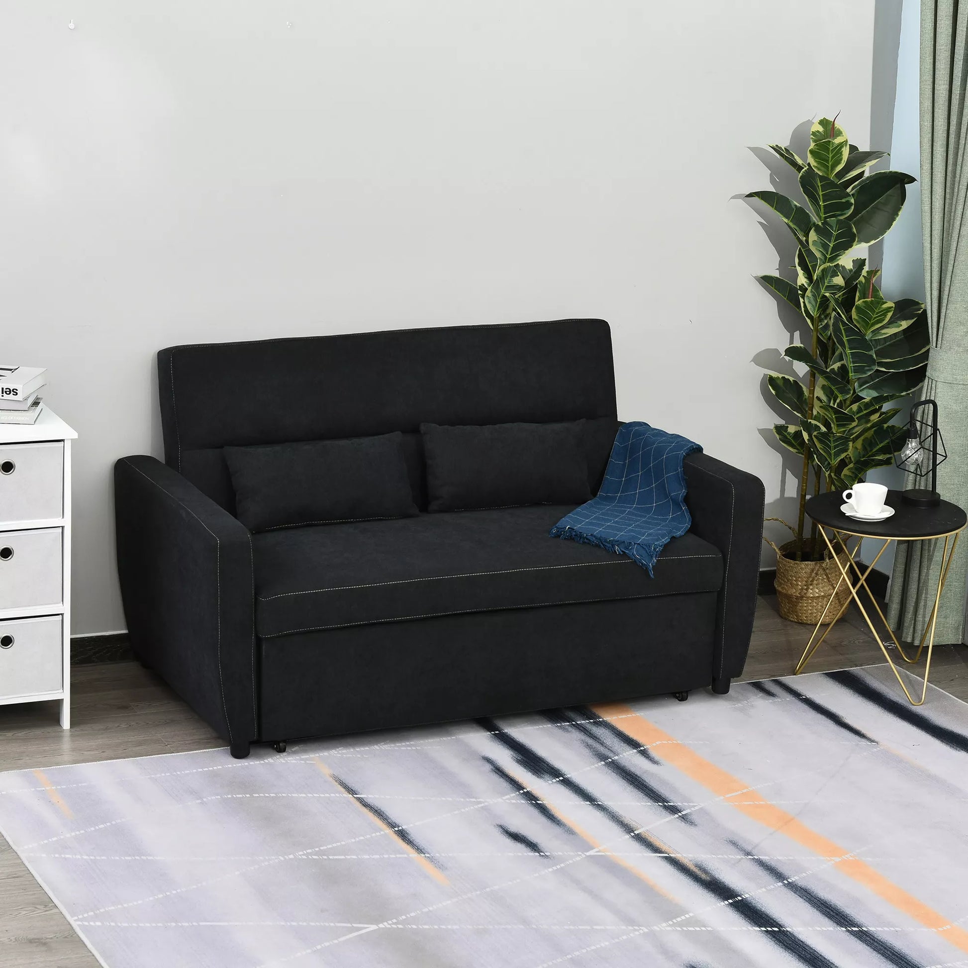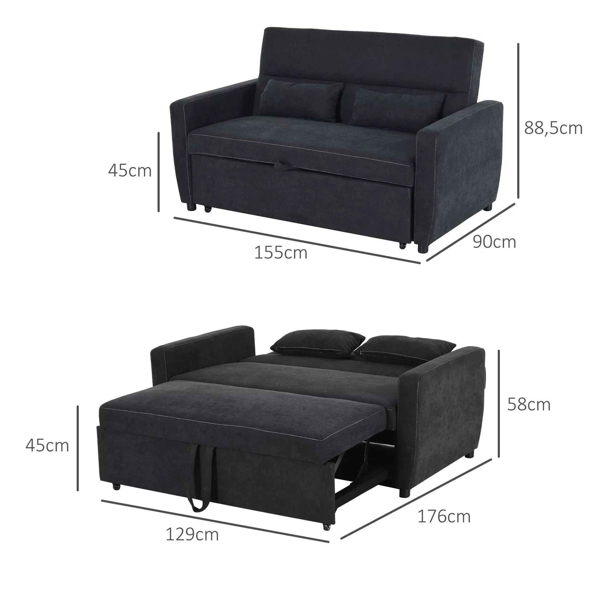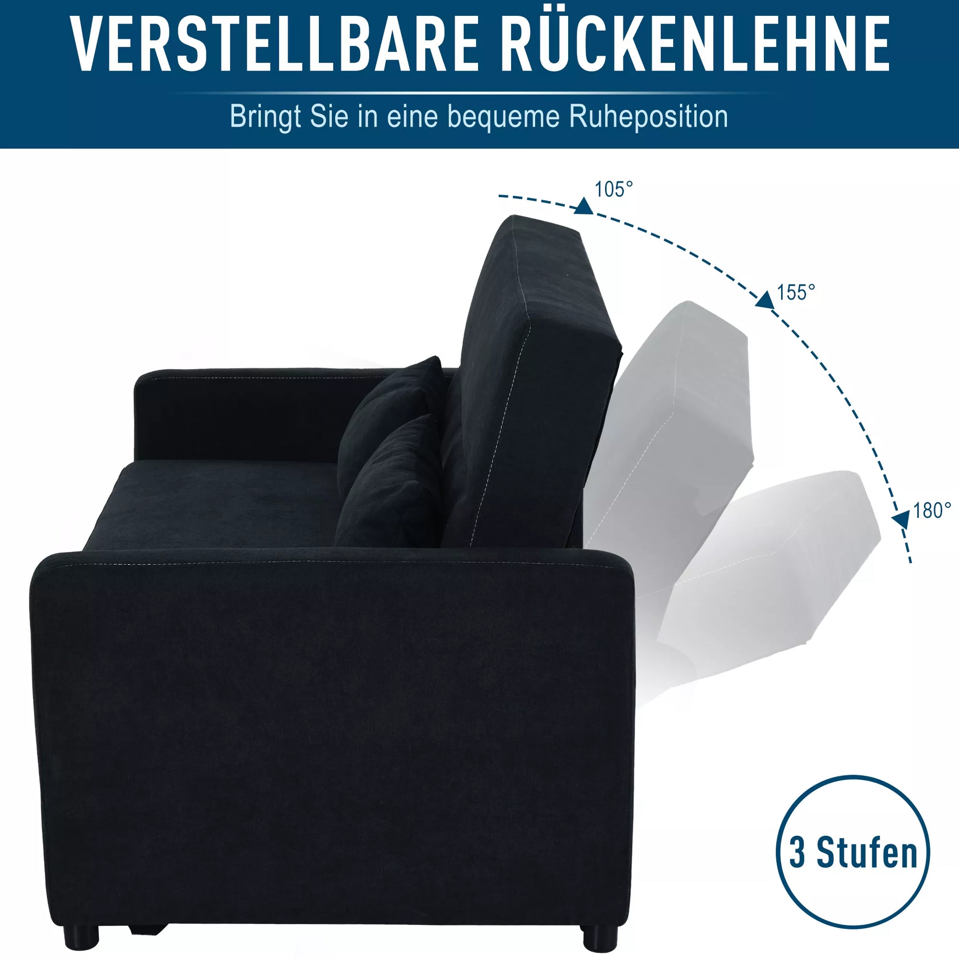 Dvivietė sofa su miegojimo funkcija, reguliuojama atlošas, minkšta sofa, aksomo išvaizda, skirta svetainei, miegamajam, juoda