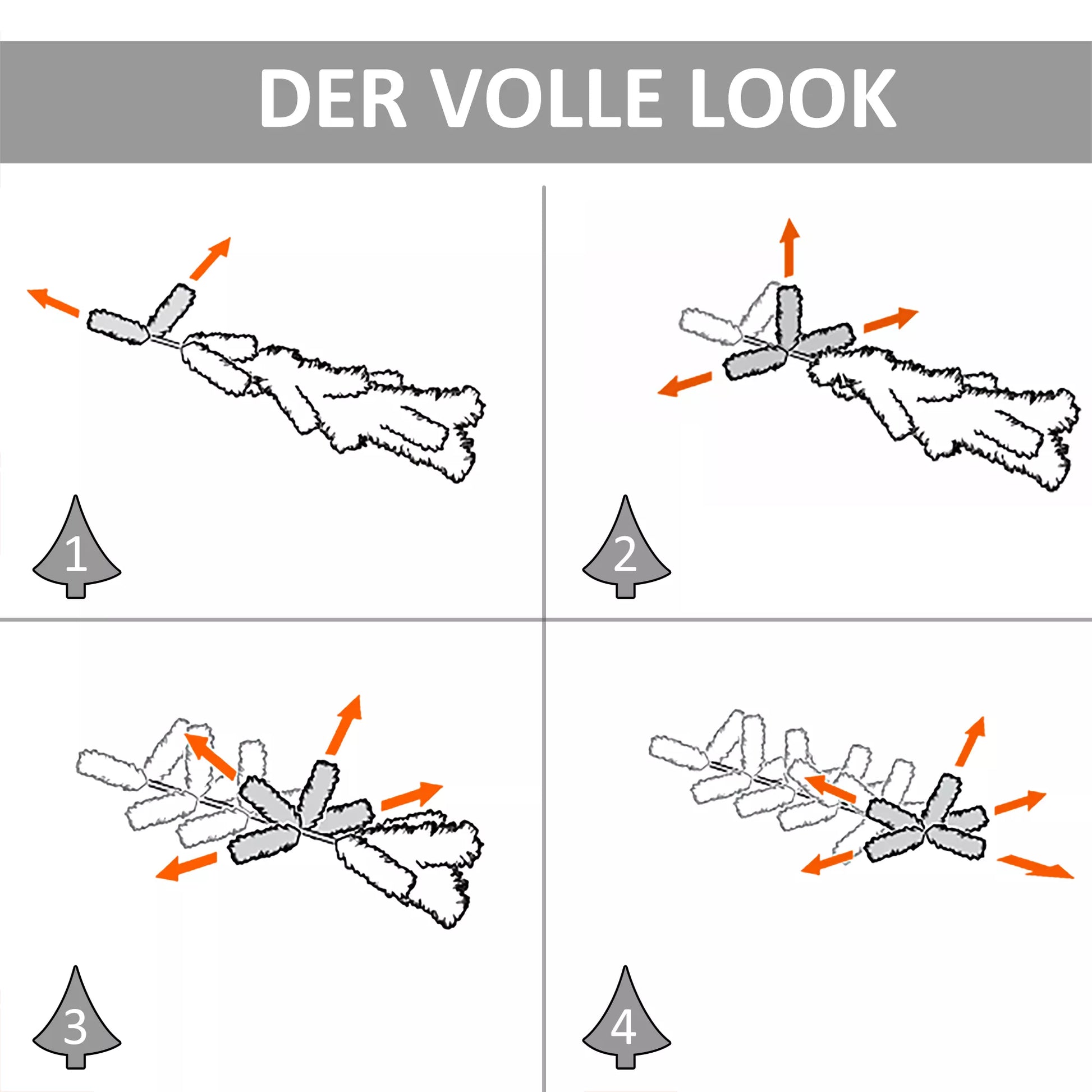 - ✔ PASTABA: Norėdami gauti pilną išvaizdą, prašome išskleisti visus atskirus galiukus. Rekomenduojame skirti 10-15 minučių eglutei formuoti