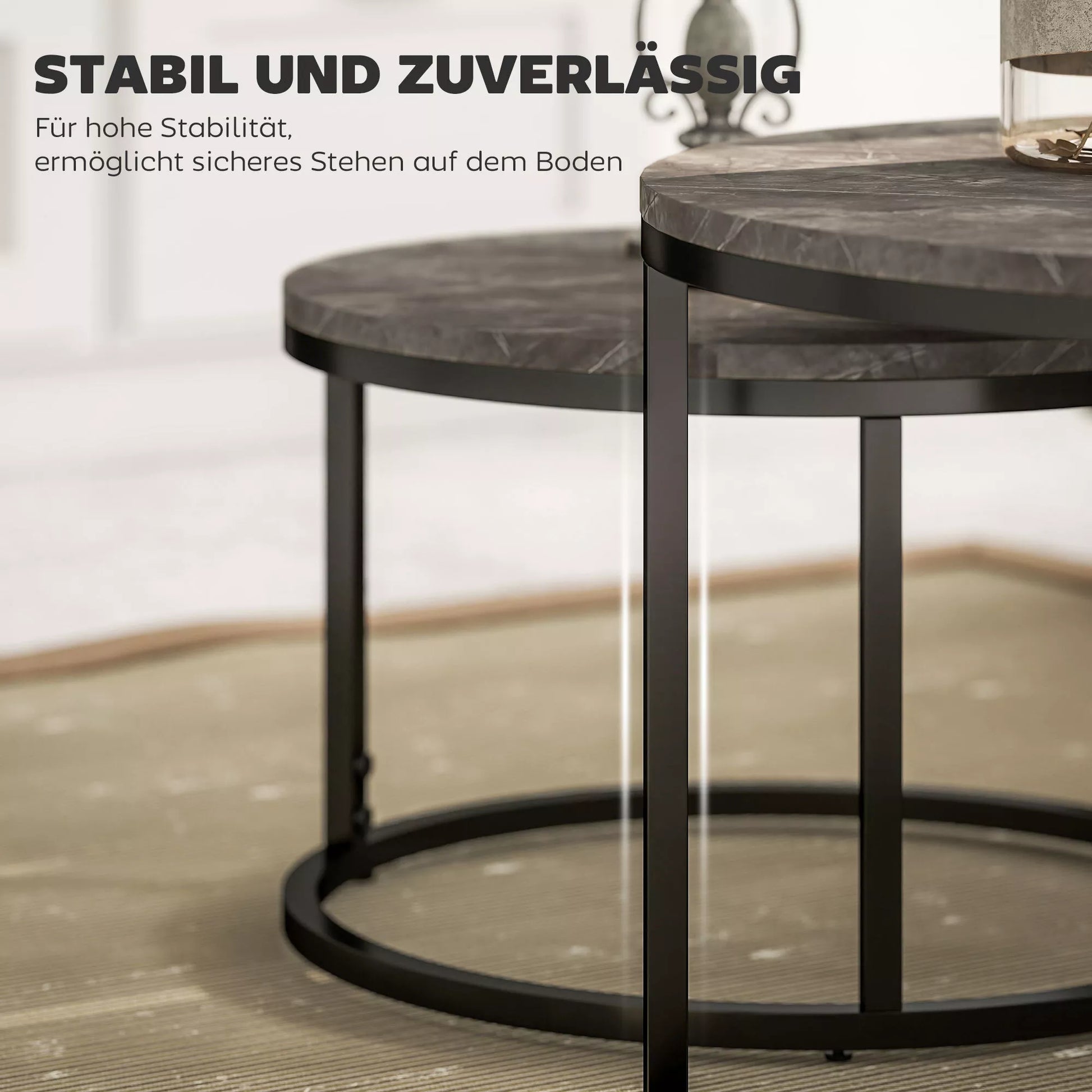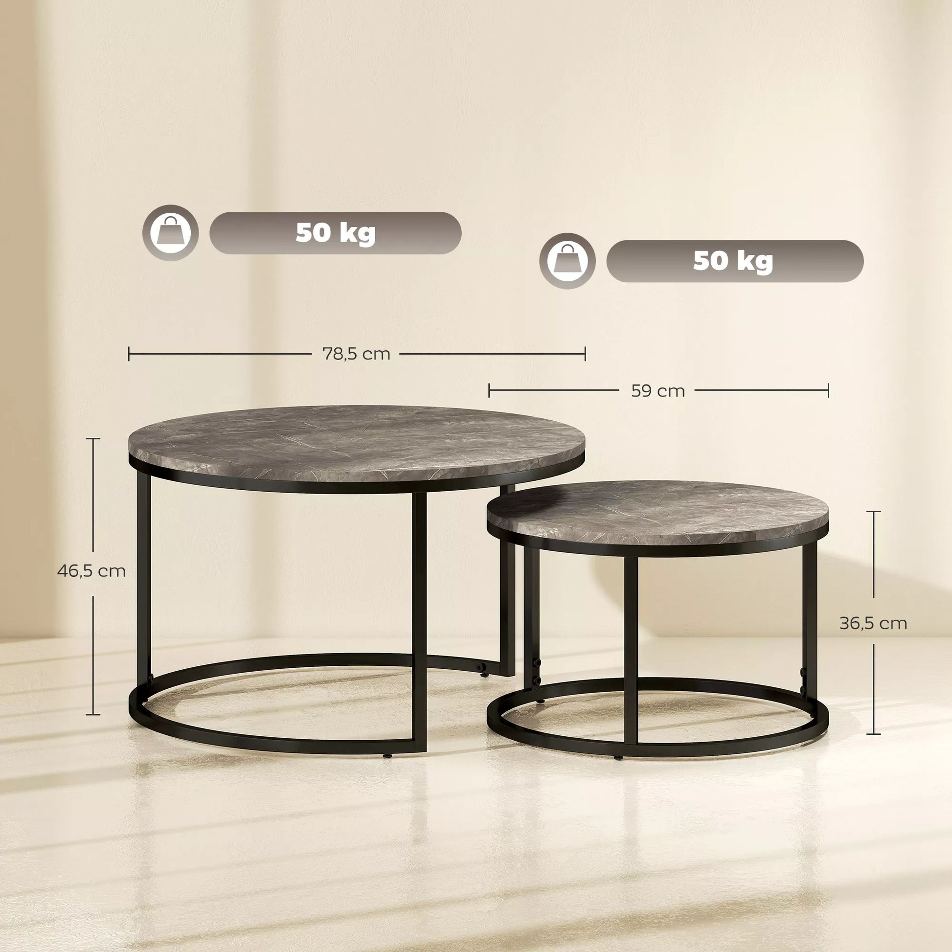 Šie du staliukai ant kojelių padarys stilingą įspūdį bet kuriame kambaryje, nesvarbu, ar juos pastumsite atskirai, ar vieną į kitą. Rinkinį sudaro mažas ir didelis staliukai, kurie sklandžiai įeina vienas į kitą, leidžiantys sutaupyti vietos juos pastačius. Tvirti metaliniai rėmai ir patrauklūs, marmurą primenantys stalviršiai garantuoja ilgaamžiškumą ir ilgalaikę estetiką.