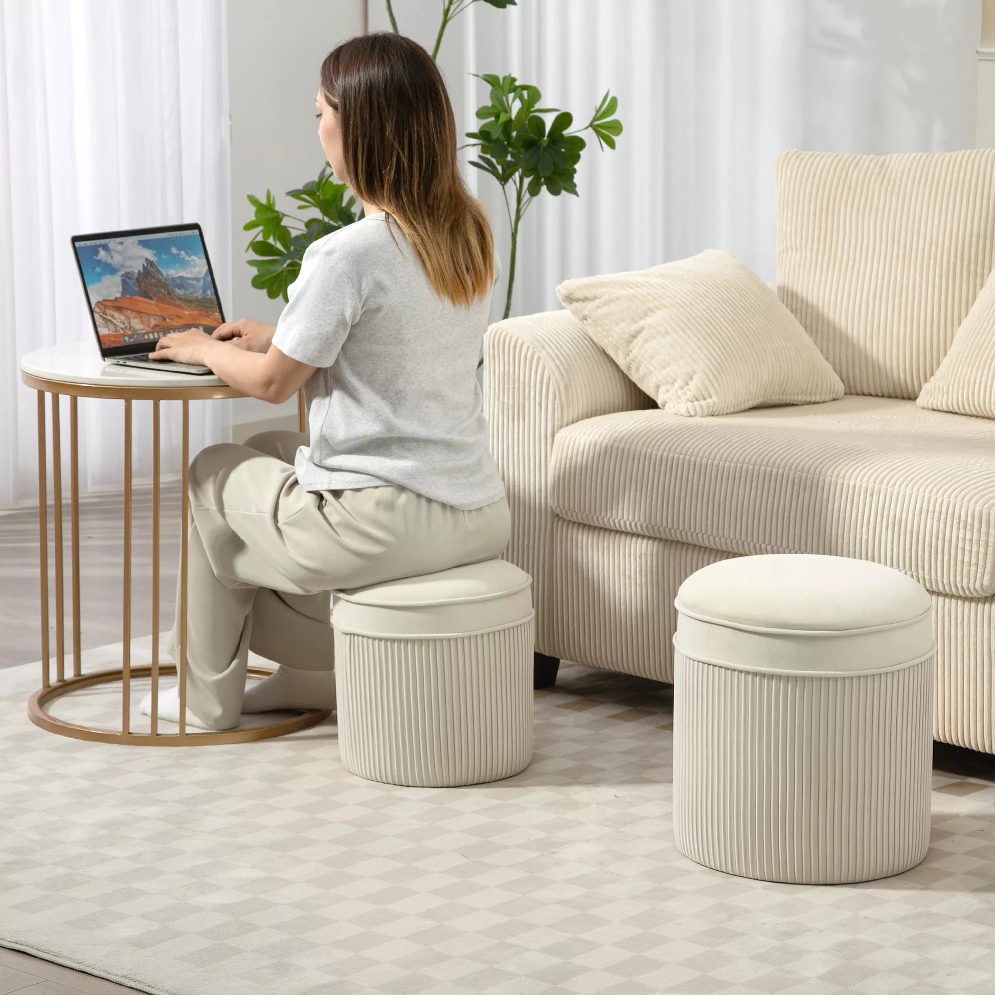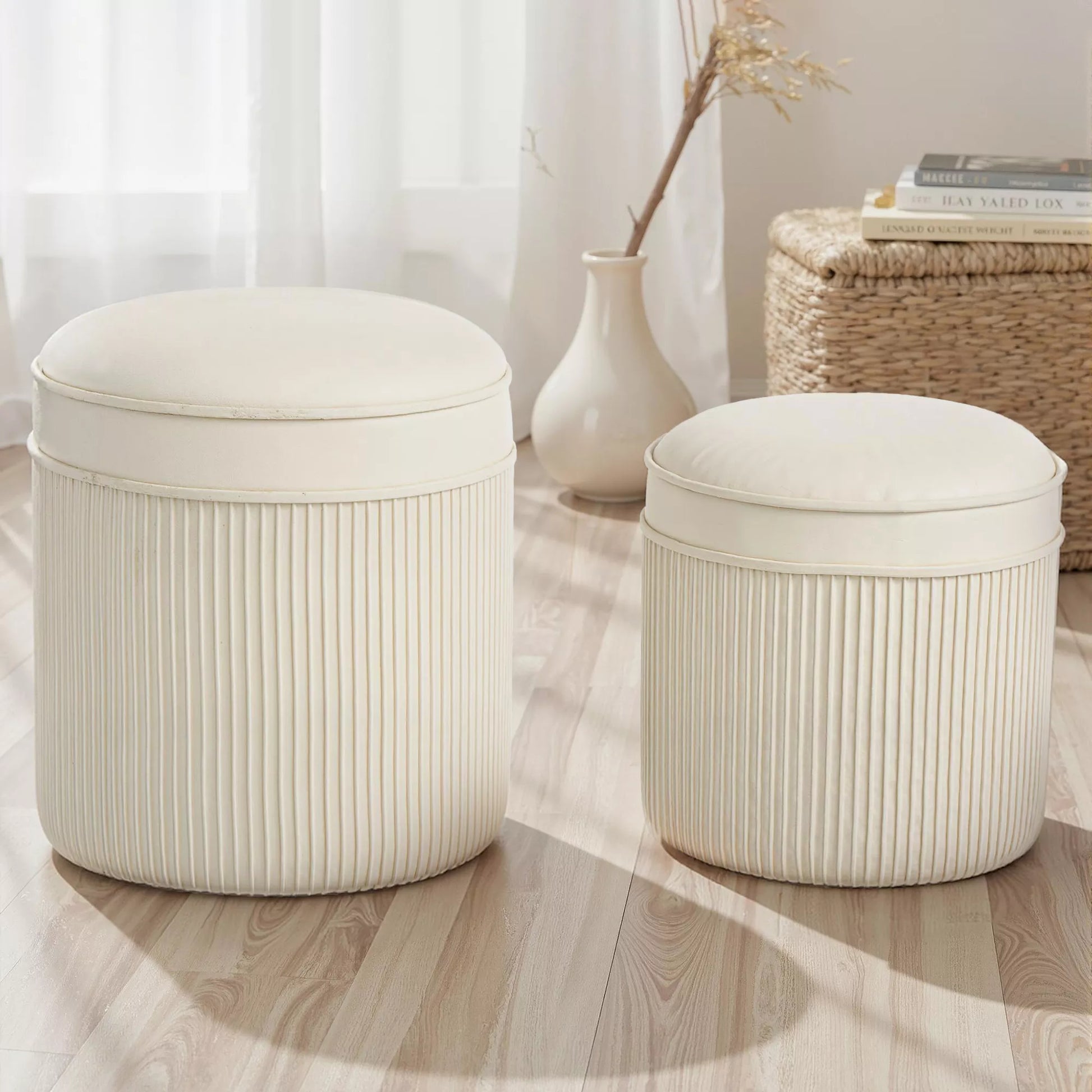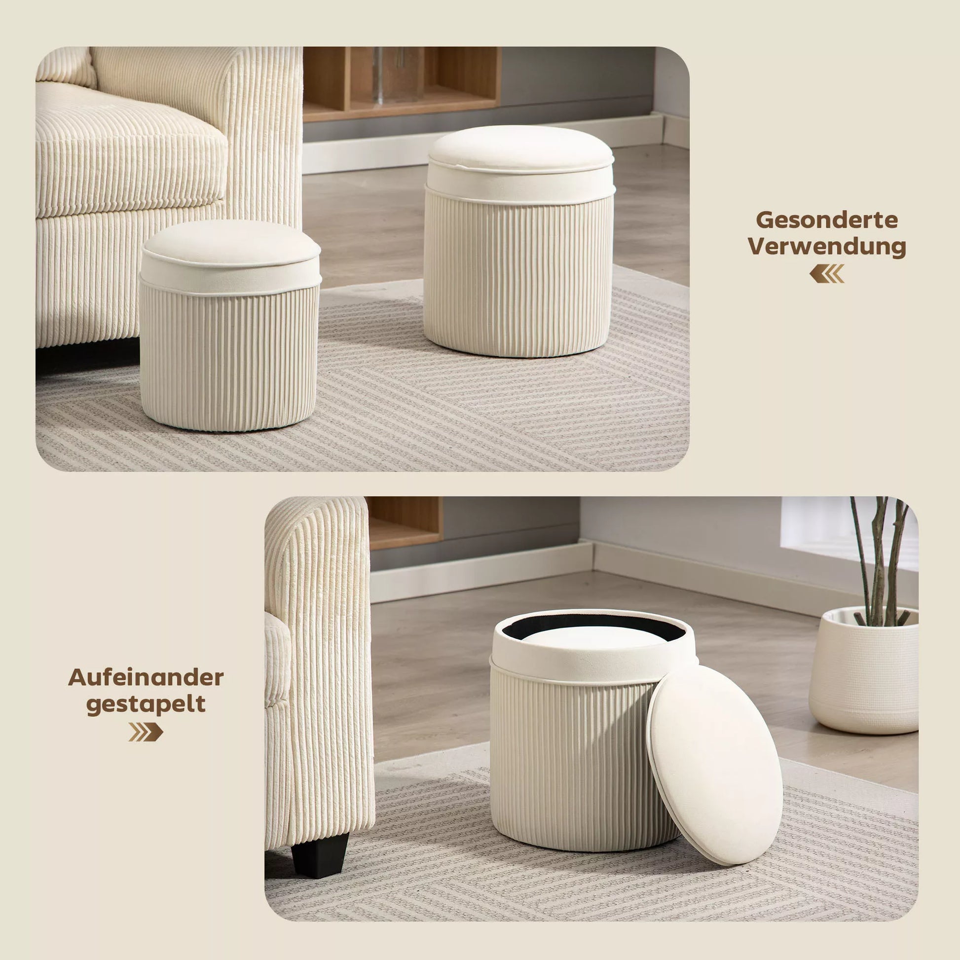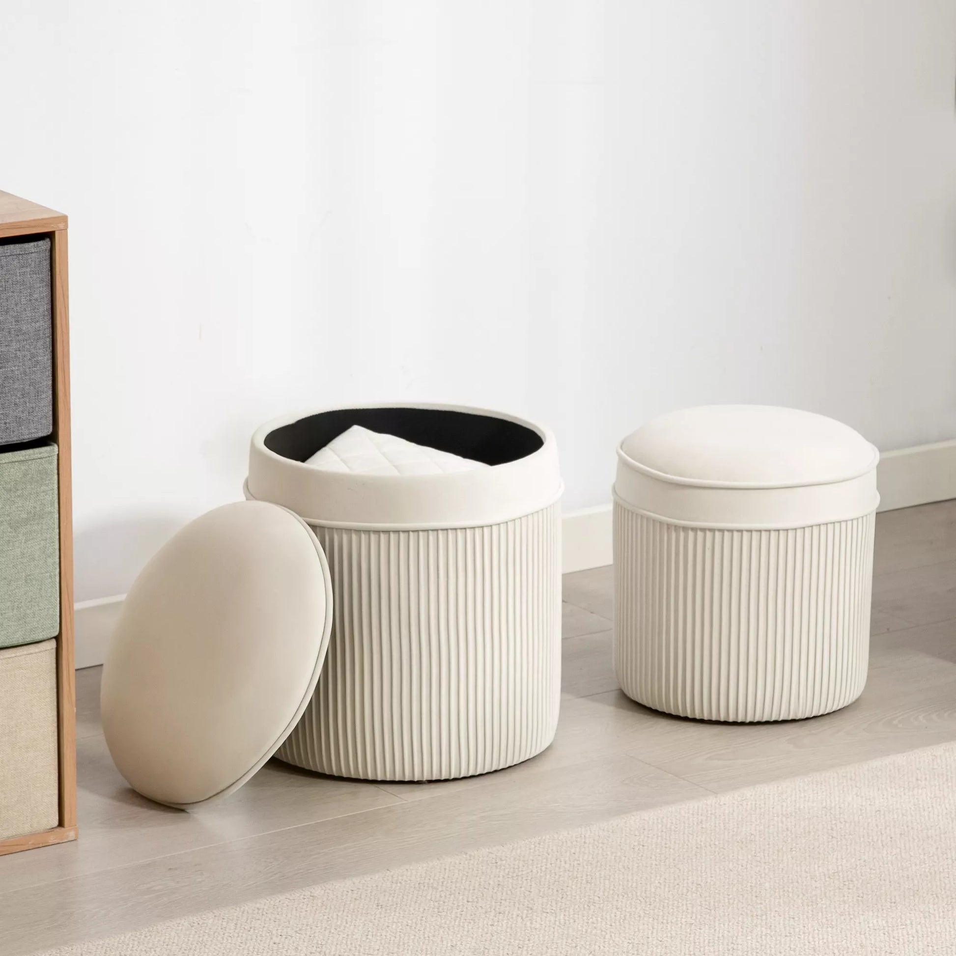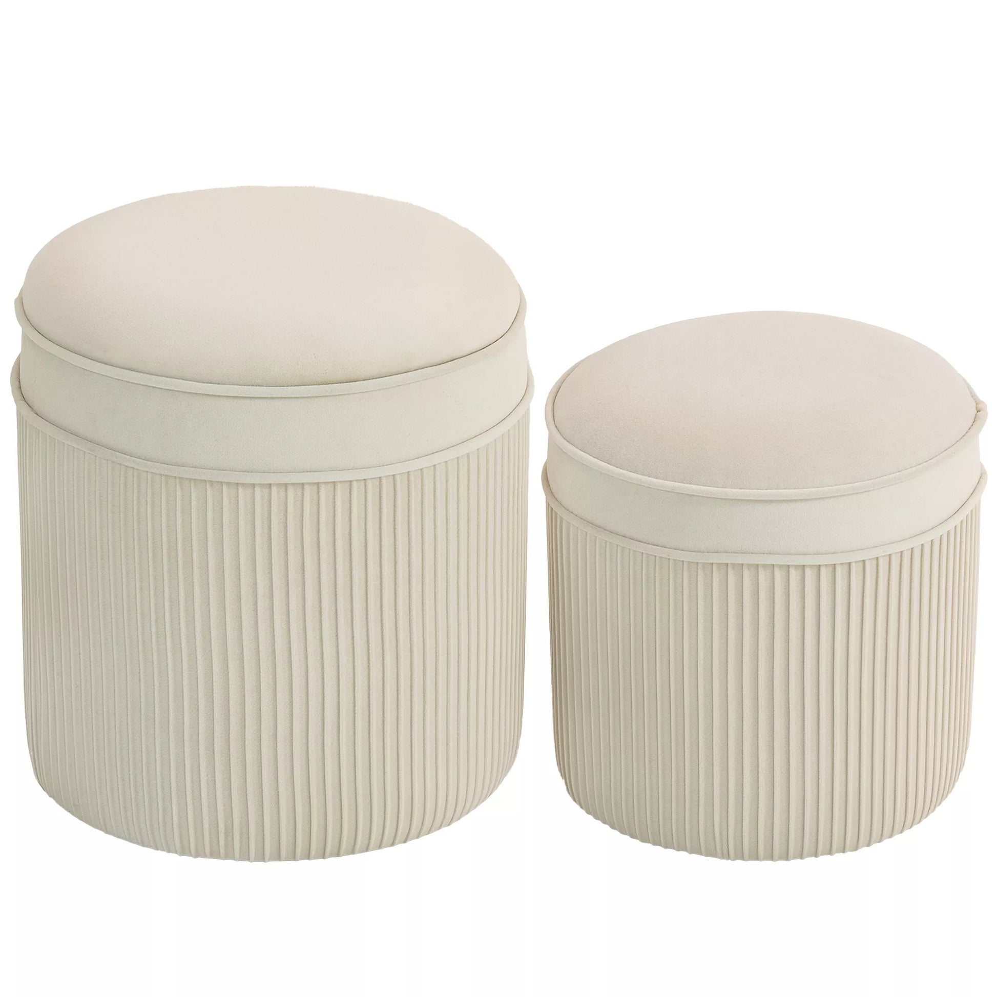 2 vnt. rinkinys, sėdmaišis su daiktadėže, pufas su dangčiu, apvalus pakojis su aksomo išvaizda, 36 x 36 x 41,5 cm, kreminės baltos spalvos