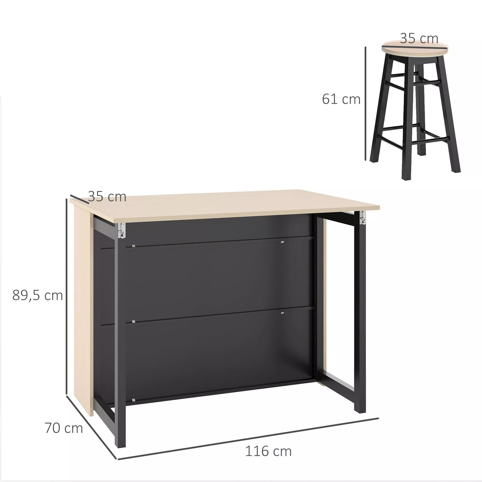 3 dalių baro komplektas, baro stalas su atlenkiamu stalviršiu, 2 baro kėdės, 6 daiktų laikymo dėžės, juodos spalvos + ąžuolo, 116 x 70 x 89,5 cm