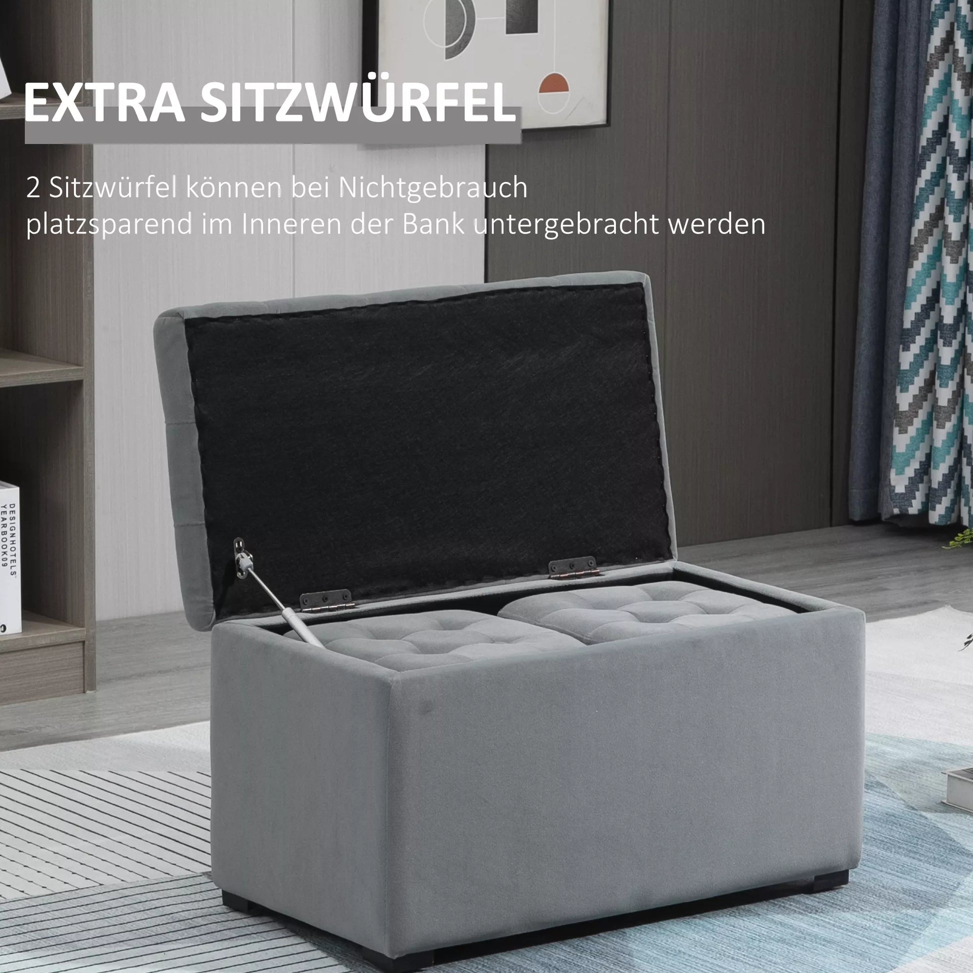 - ✔ 2 mažesnius sėdimuosius kubus galima laikyti suoliuko viduje, taupant vietą
