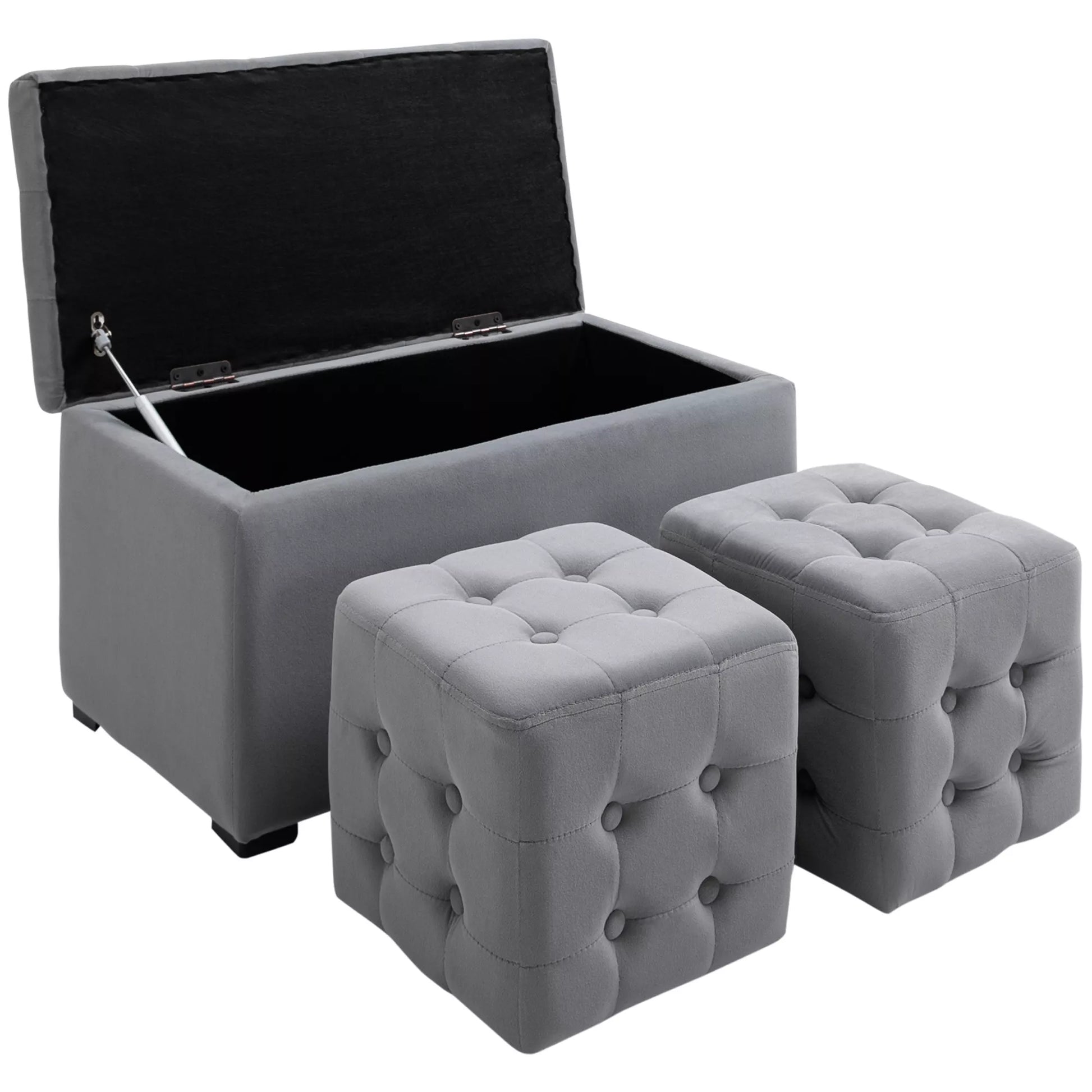 3 dalių rinkinys su laikymo vieta, 2 x sėdimasis pufas, apmušta dėžė su sėdyne, kojų pufas, laikymo dėžė, kojų atrama, atlaiko iki 130 kg, mikropluošto audinys, putplastis, 75 x 40 x 42 cm, šviesiai pilkos spalvos