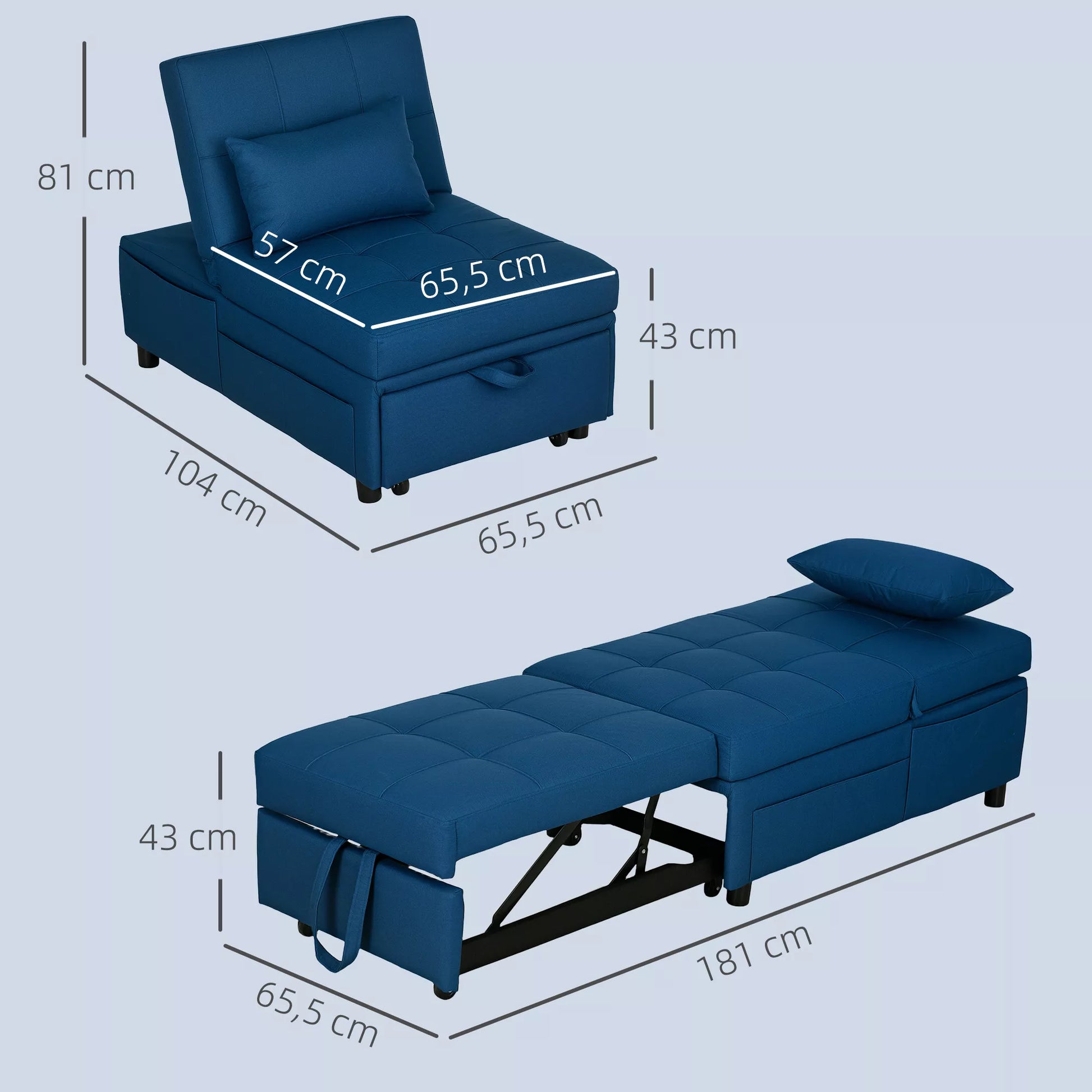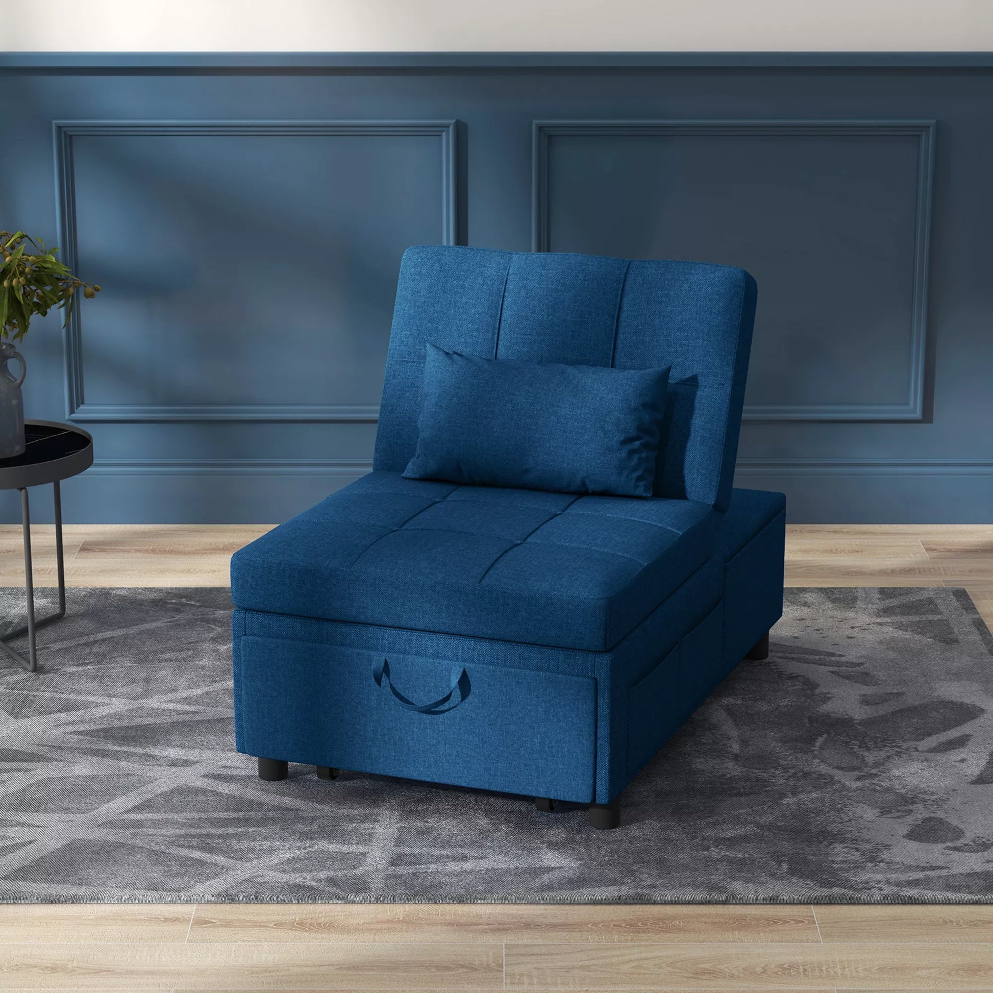 3in1 sulankstomas krėslas su šonine kišene, svečių lova su pagalve, reguliuojamu atlošu, lovos kėdė su ratukais, mėlynos spalvos