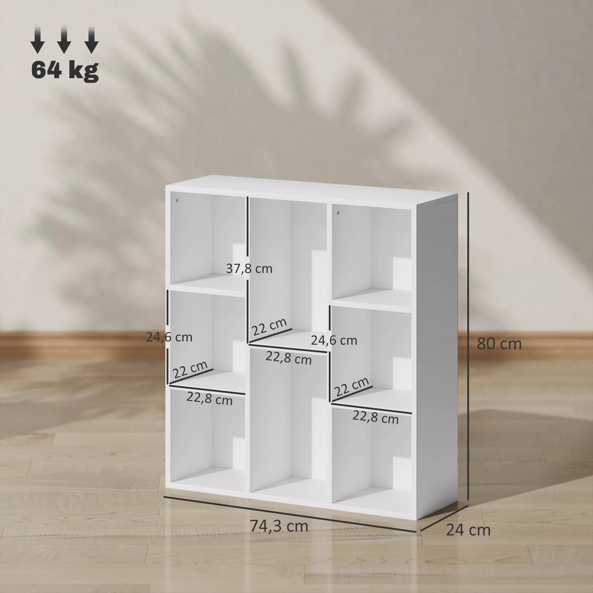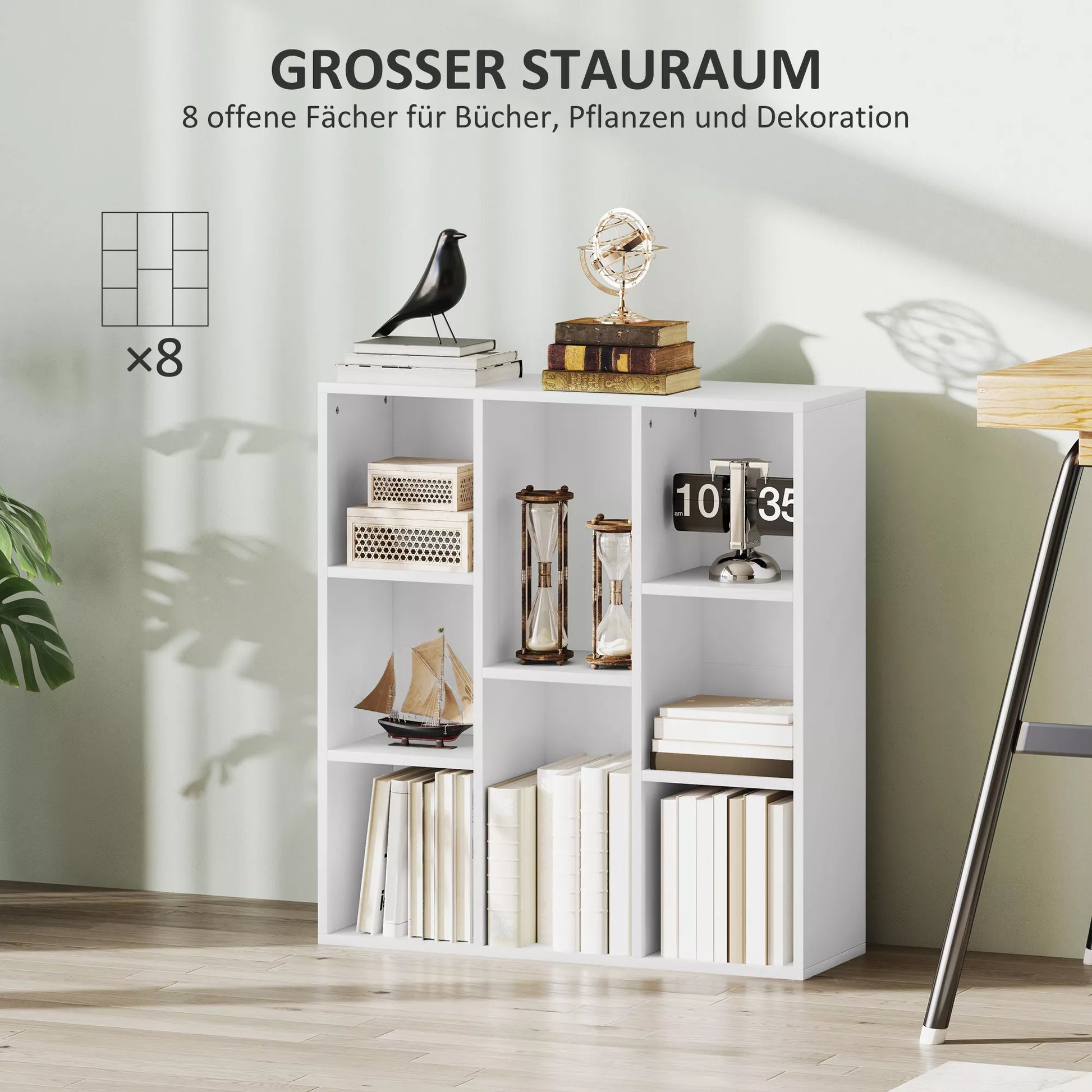 3 pakopų knygų lentyna, 8 skyrių, medžio drožlių plokštė, laikymo lentyna, balta