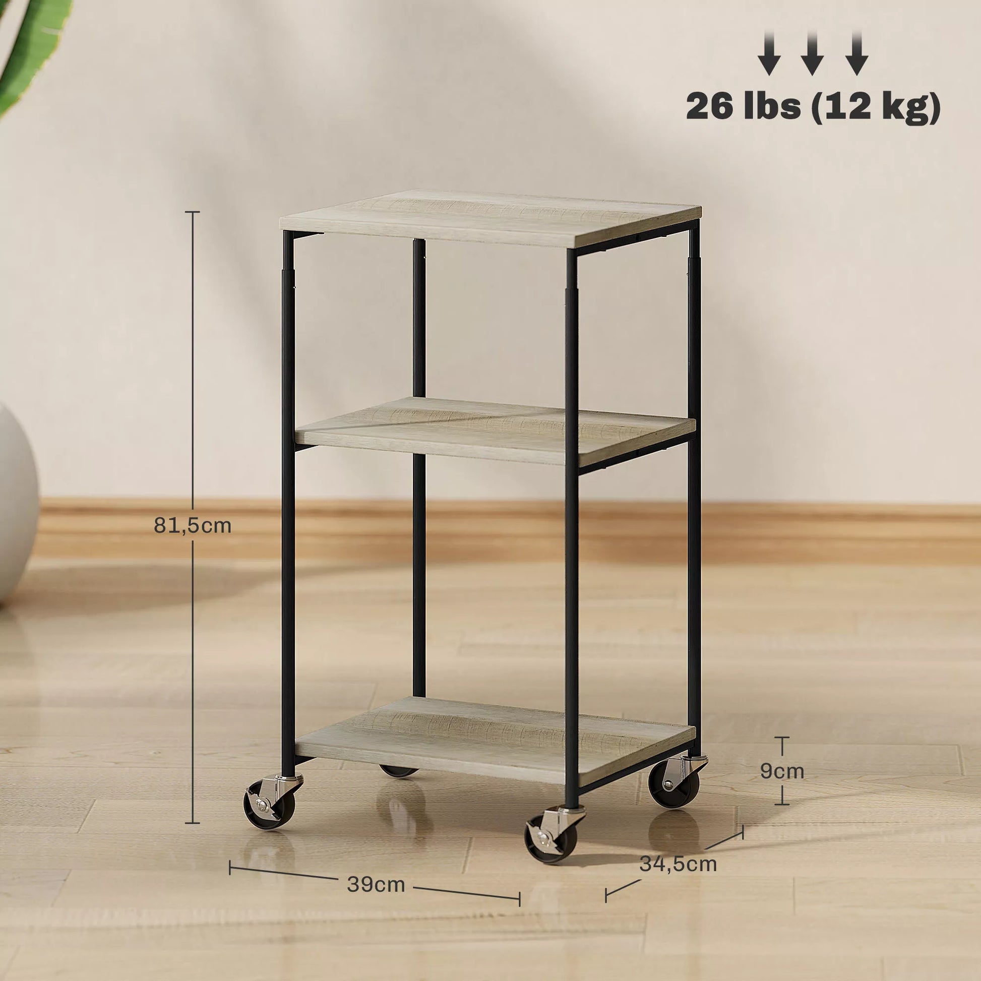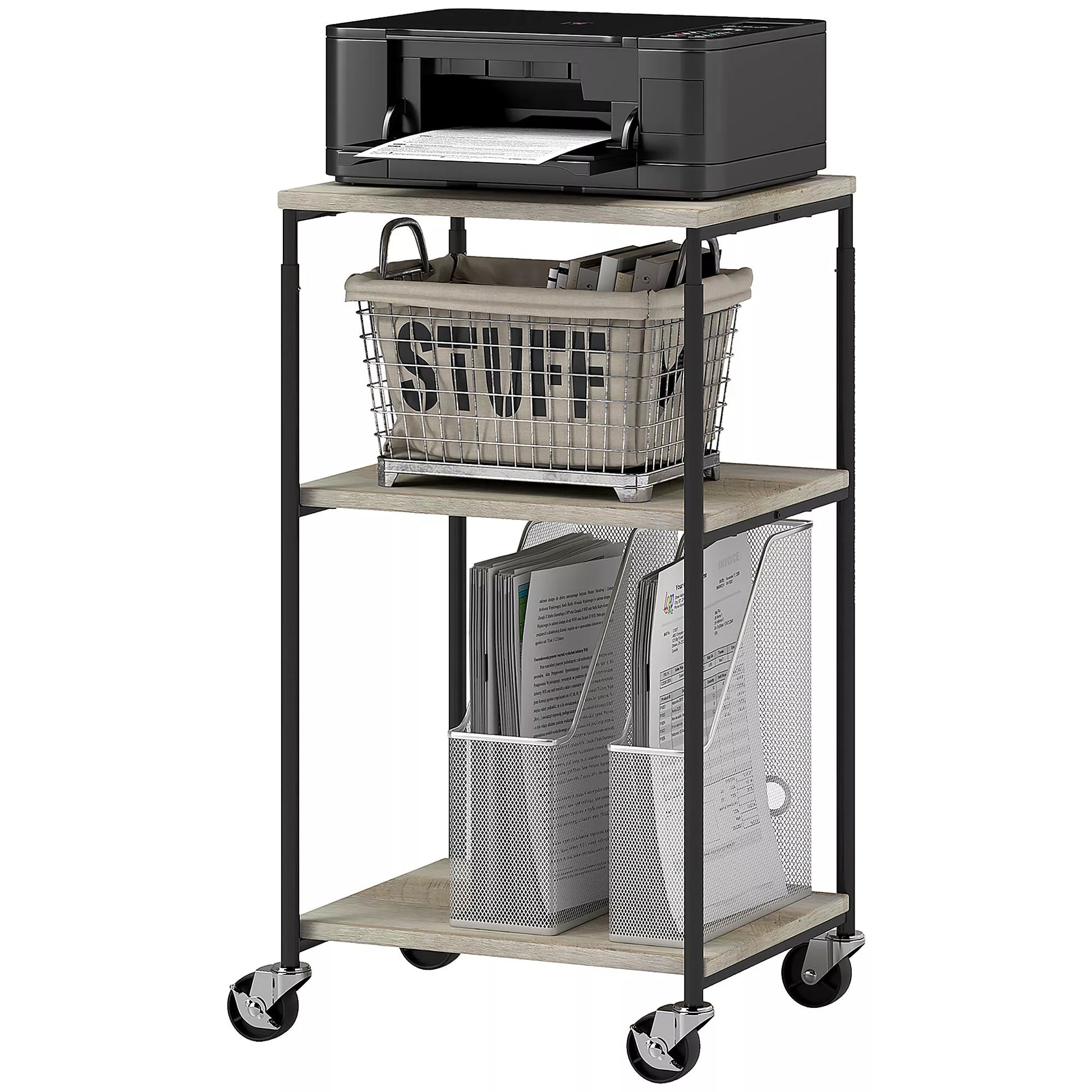 Spausdintuvo stovas su 3 lentynomis, reguliuojamo aukščio, mobilus spausdintuvo vežimėlis su ratukais, namų biurui, metalo ir medžio