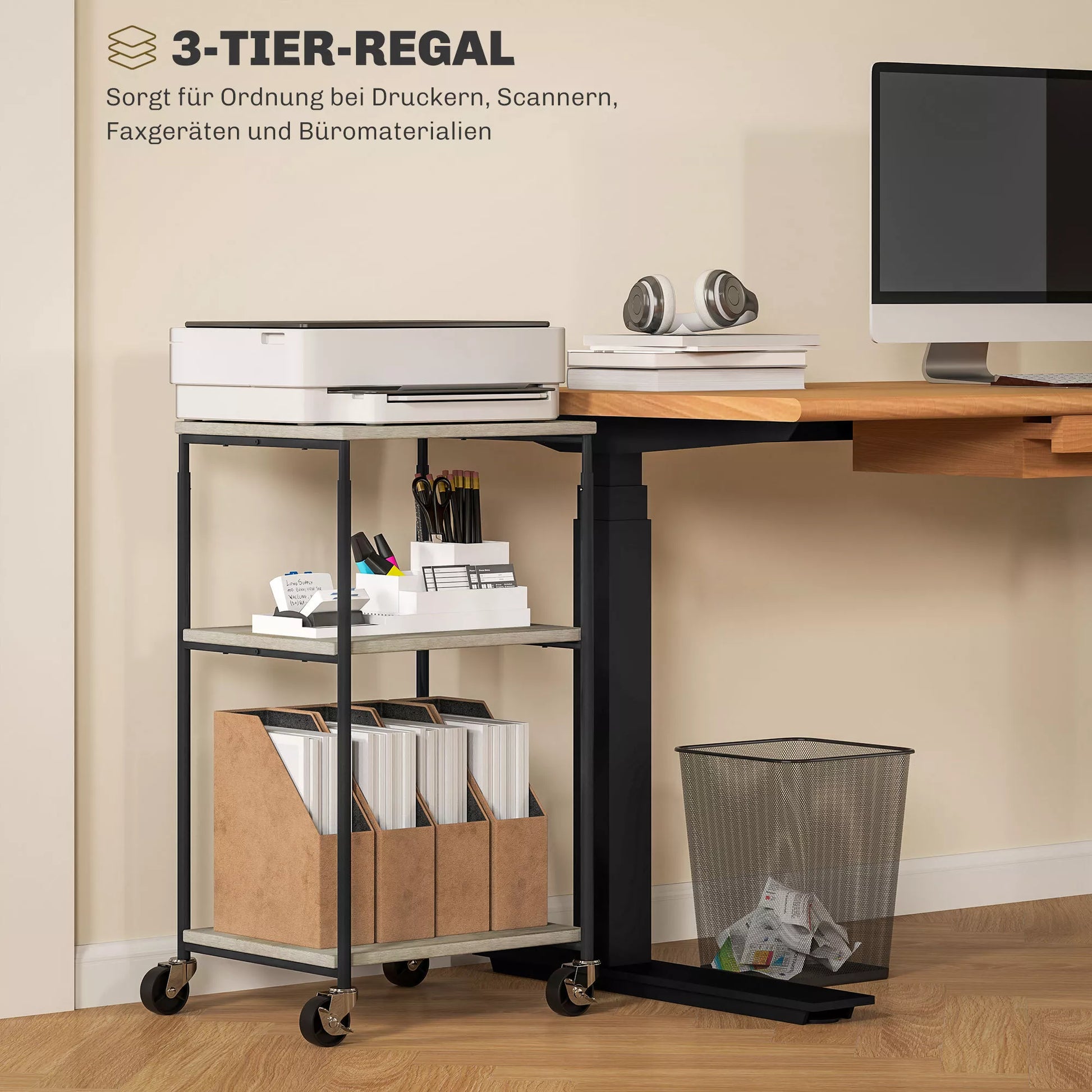 - ✔ Trijų pakopų spausdintuvo laikiklio lentyna maksimaliai padidina biuro reikmenų saugojimo vietą