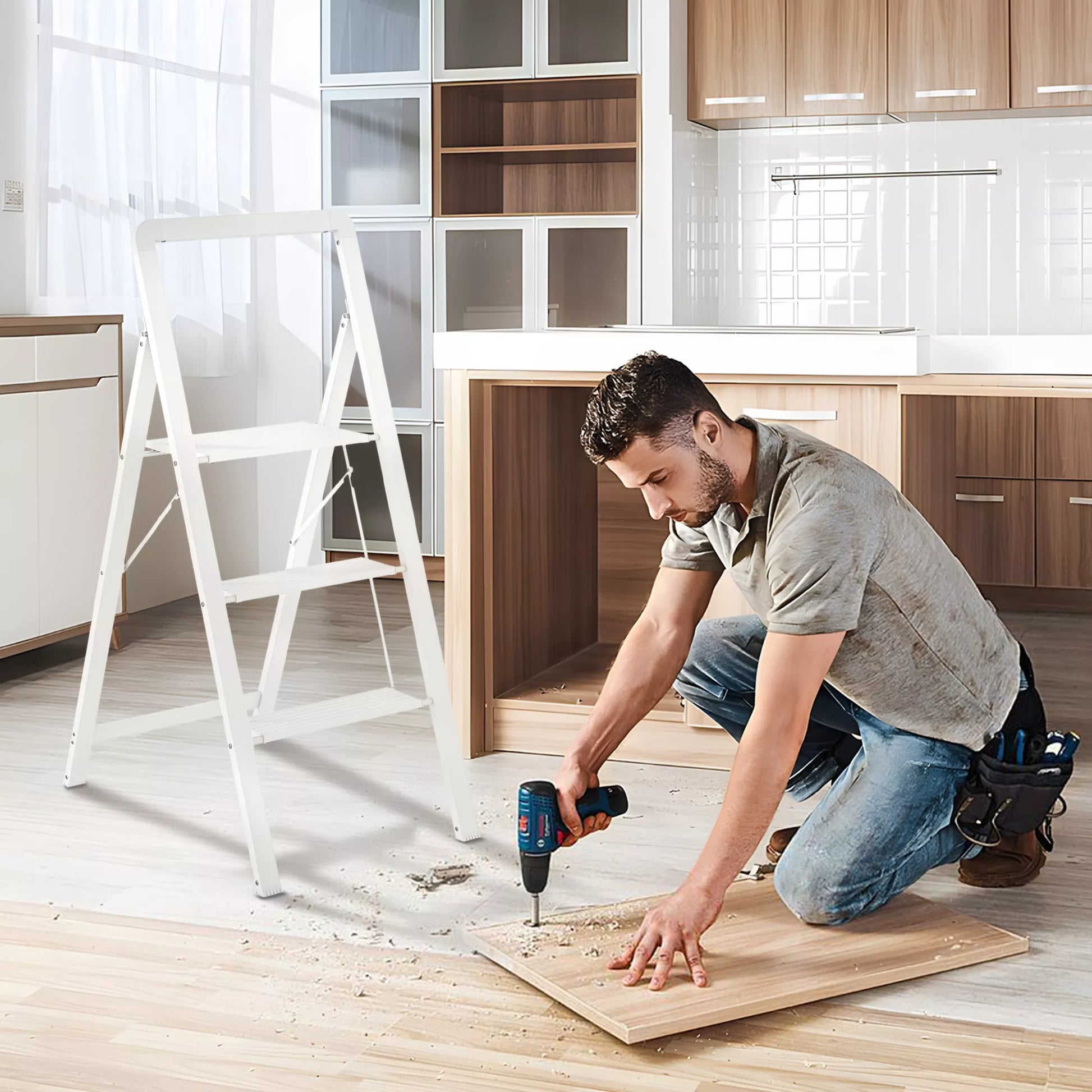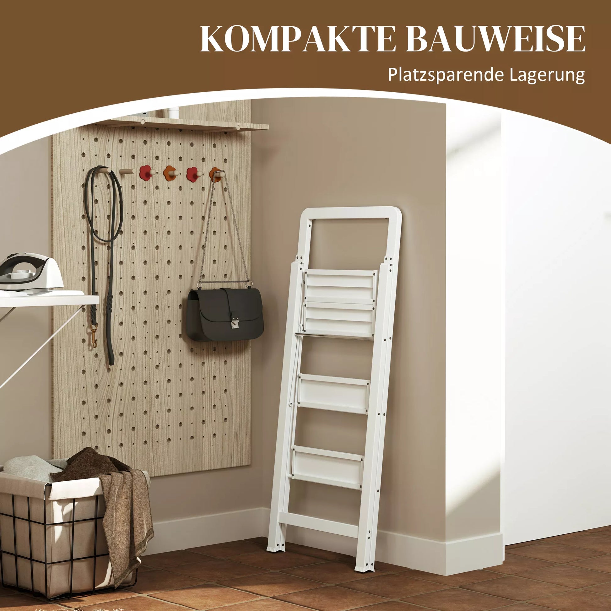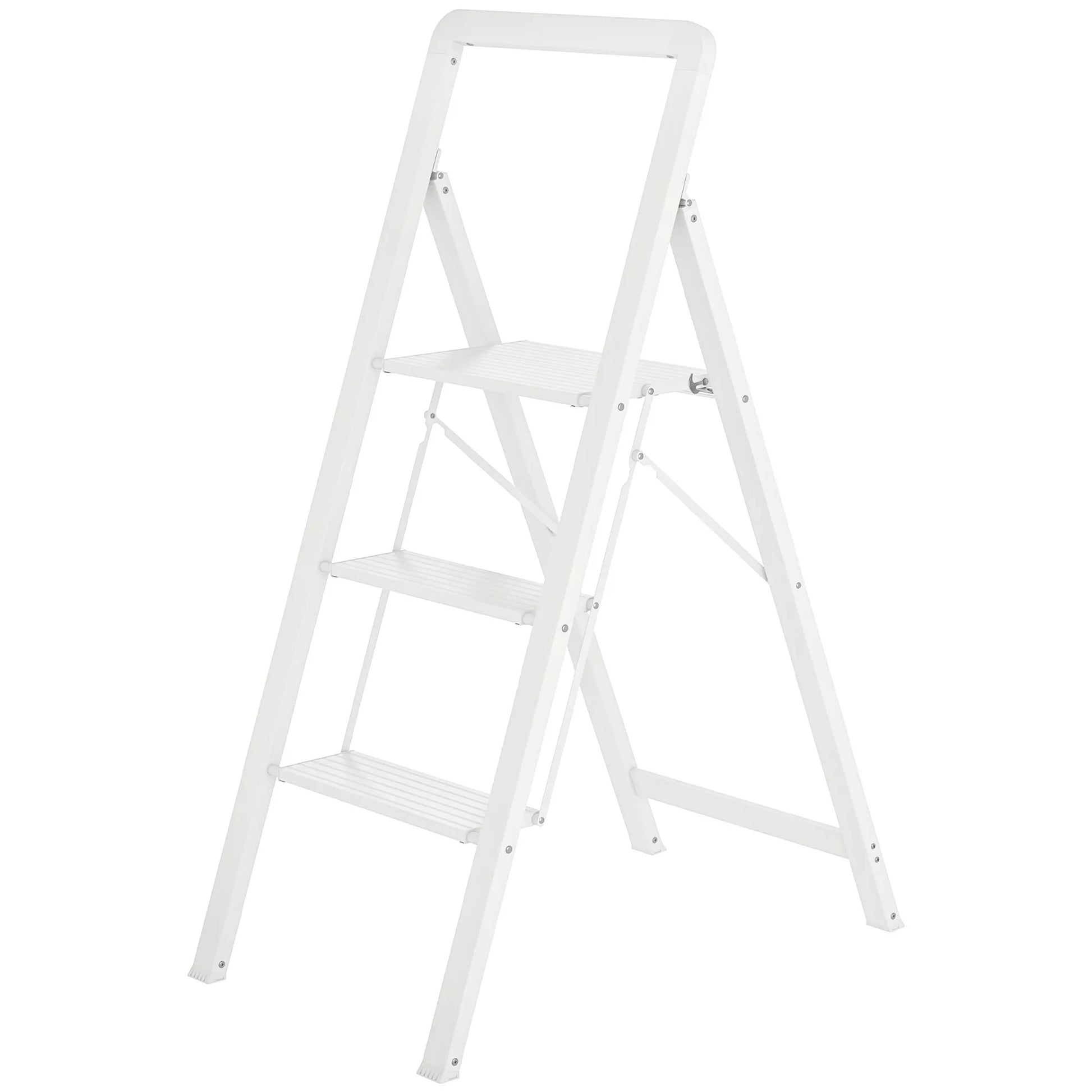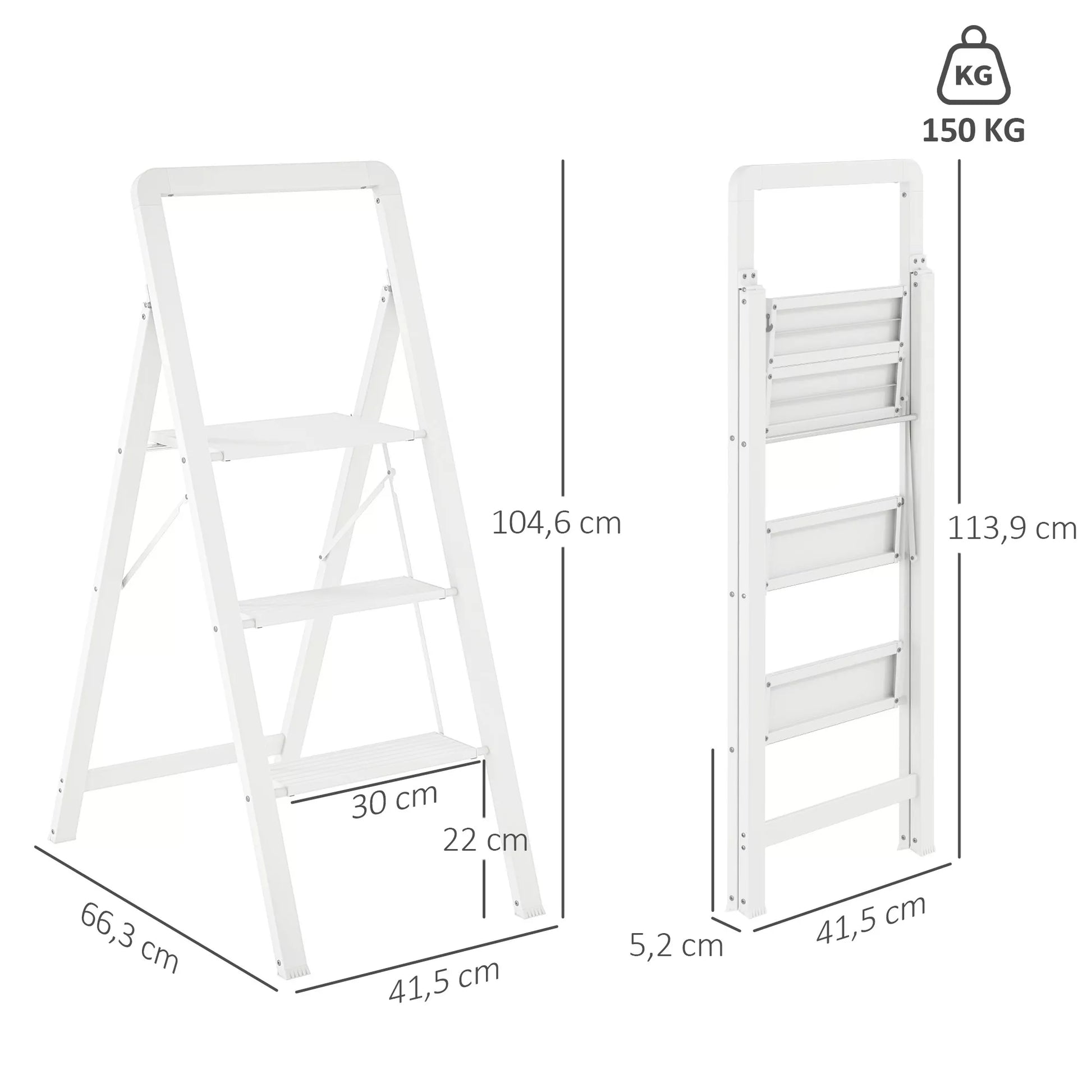 3 pakopų sulankstomos aliuminio kopetėlės, neslystanti platforma, baltos