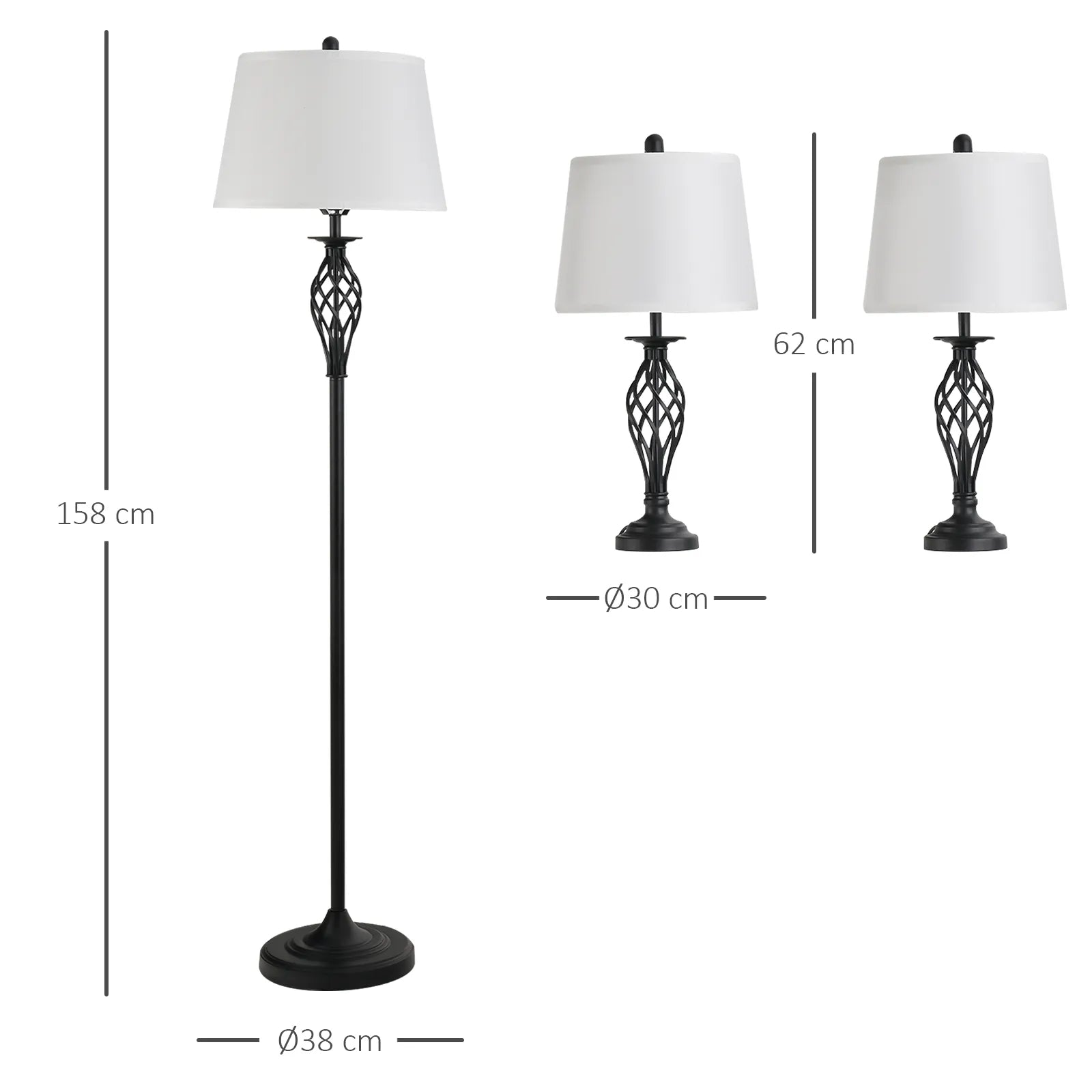 3 lempų rinkinys: 2 stalinės lempos (ø38 x 158H cm) + 1 pastatoma lempa (ø30 x 62H cm). Vintage stalinė lempa su kojiniu jungikliu, skirta svetainei, miegamajam. Medžiaga: metalas, spalva: juoda+balta.
