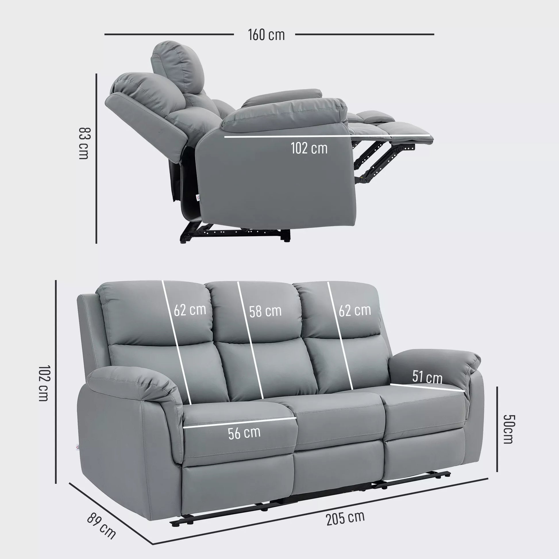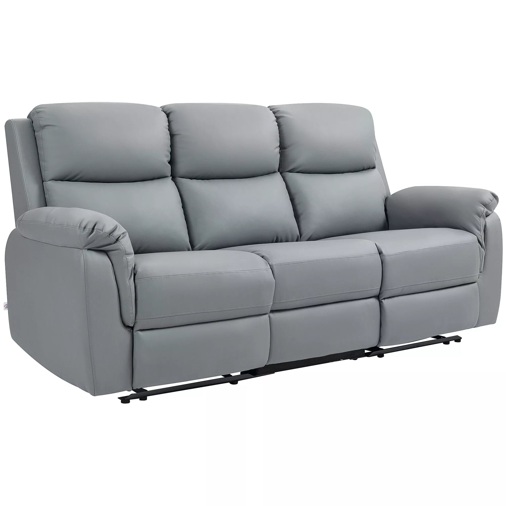 3 vietų sofa, kairė ir dešinė sėdynės atlenkiamos, reguliuojama atrama kojoms, dirbtinės odos apmušalas, skirta svetainei, tamsiai pilka